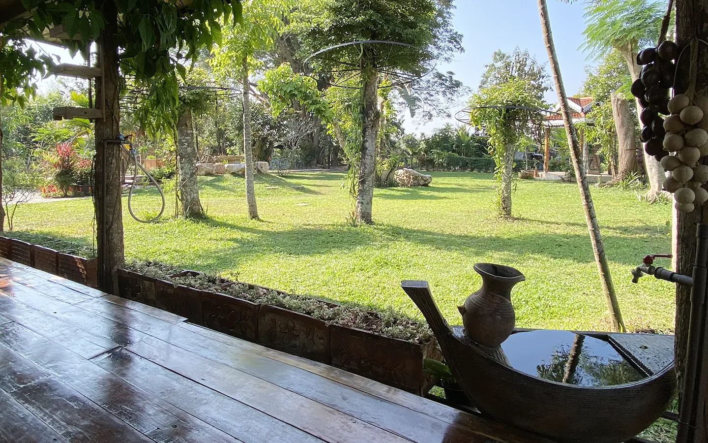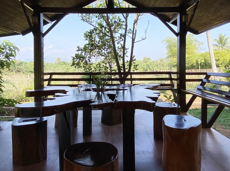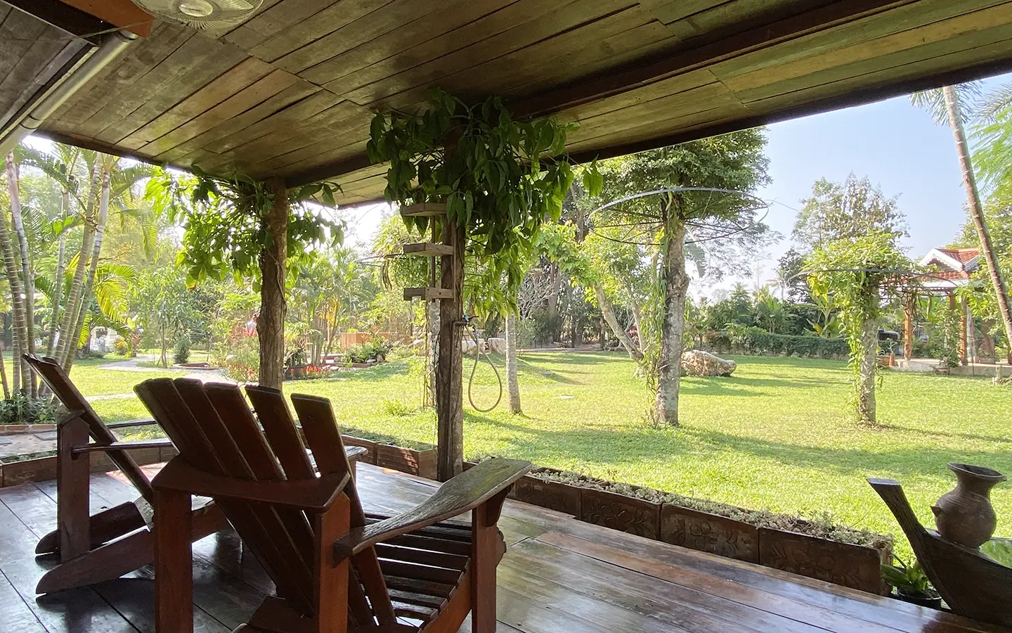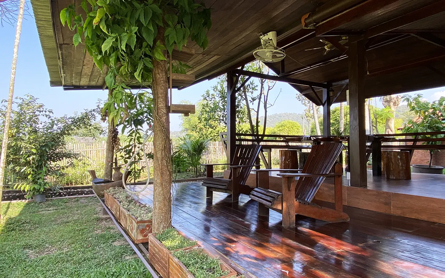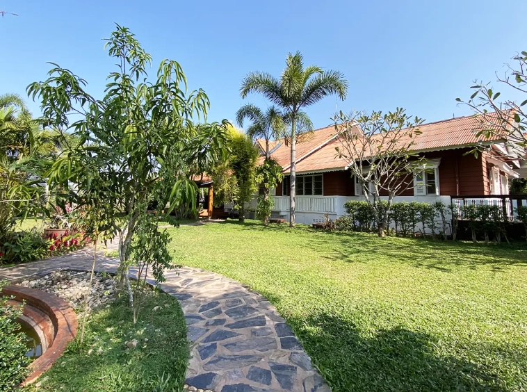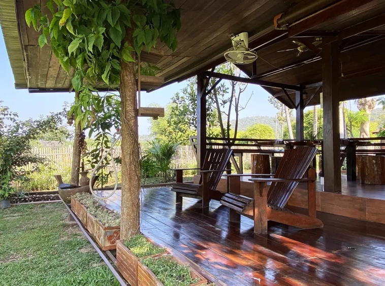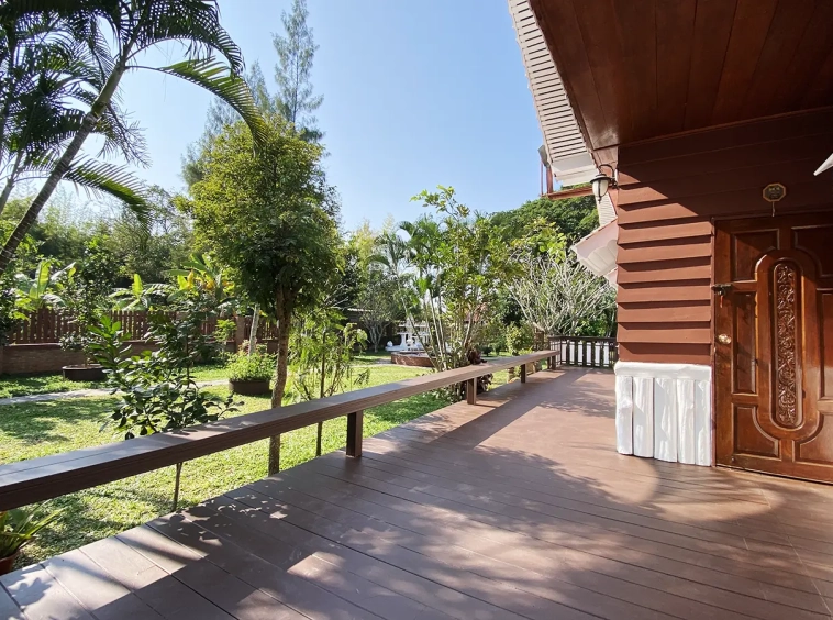 A beautiful renovated Lanna teak wood house on an impressive 4.25 rai of land bordering a National Park is for sale semi furnished in the Mae Taeng area North of Chiang Mai city. It is about a 50-minute drive from Mae Rim, where Makro and Kad Farang are. The property is in a quiet, serene village close to Mae Ngad Dam and enjoys the view of Chiang Dao Mountain.