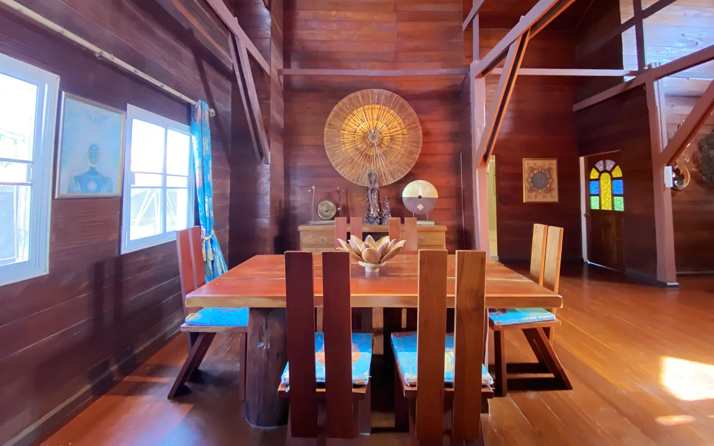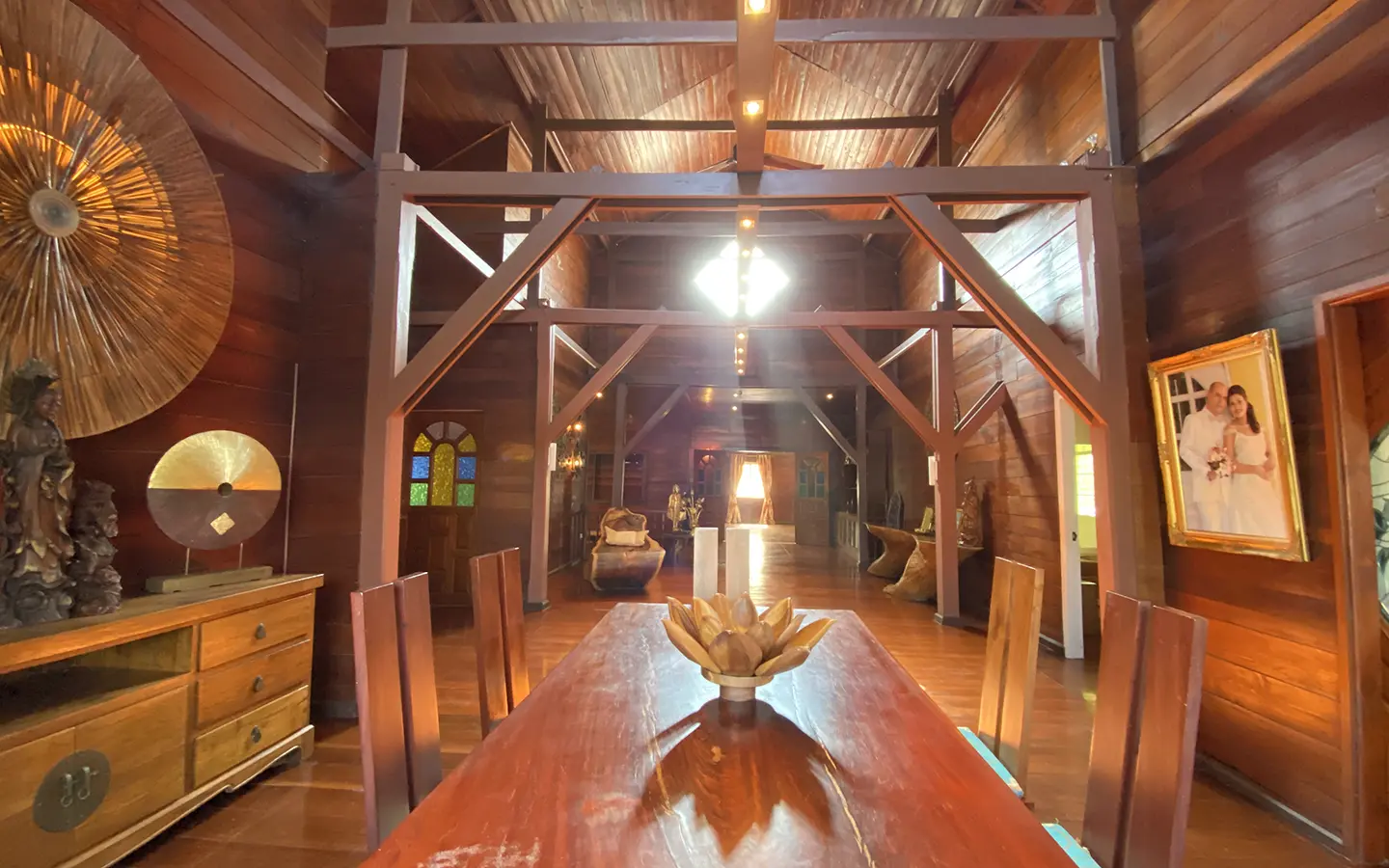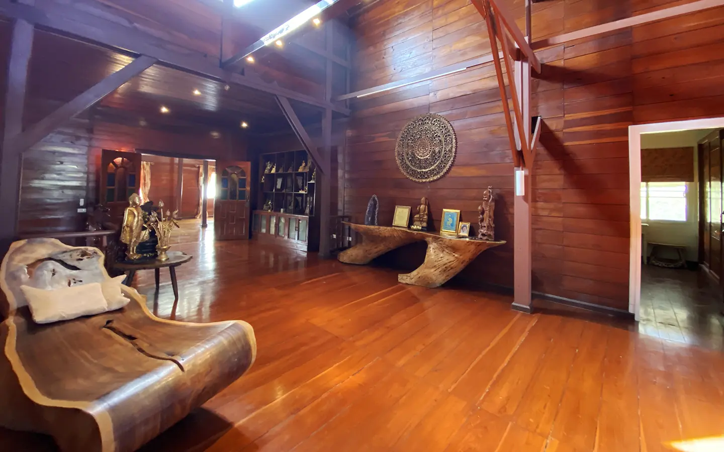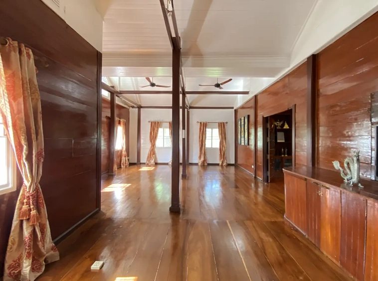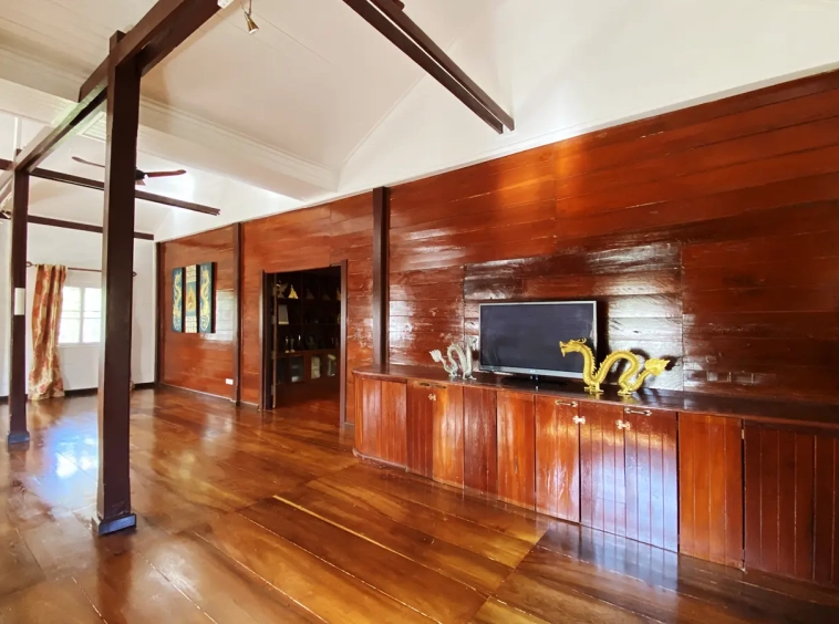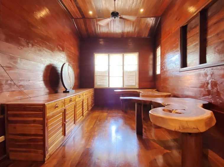 At the front of the house is a large, all-teak wood, covered sitting terrace for outdoor dining/entertaining or simply enjoying nature. Inside, the entire house features gorgeous floor-to-ceiling teak wood in a unique design that must be seen to be truly appreciated.