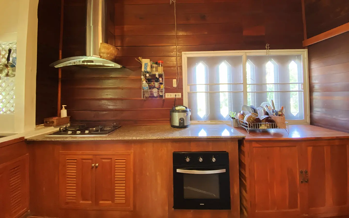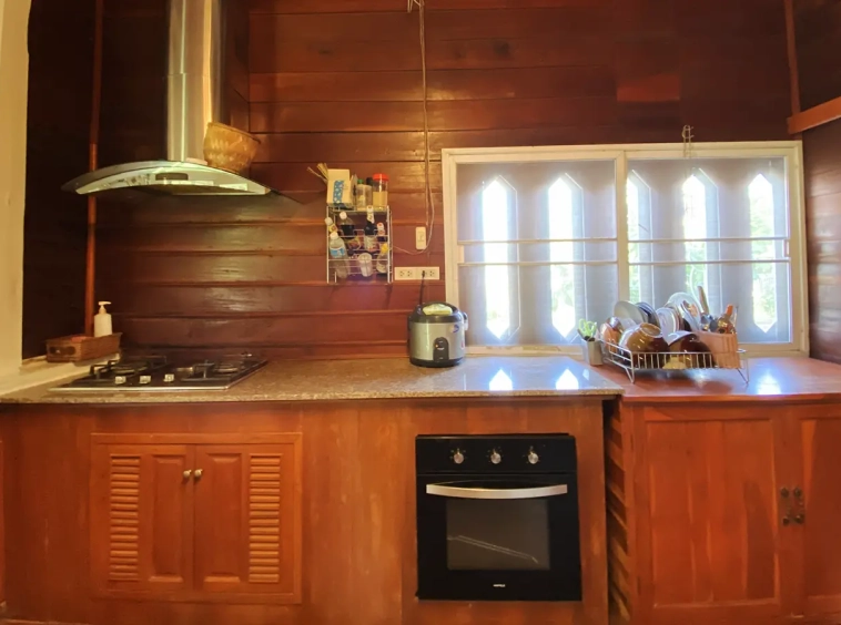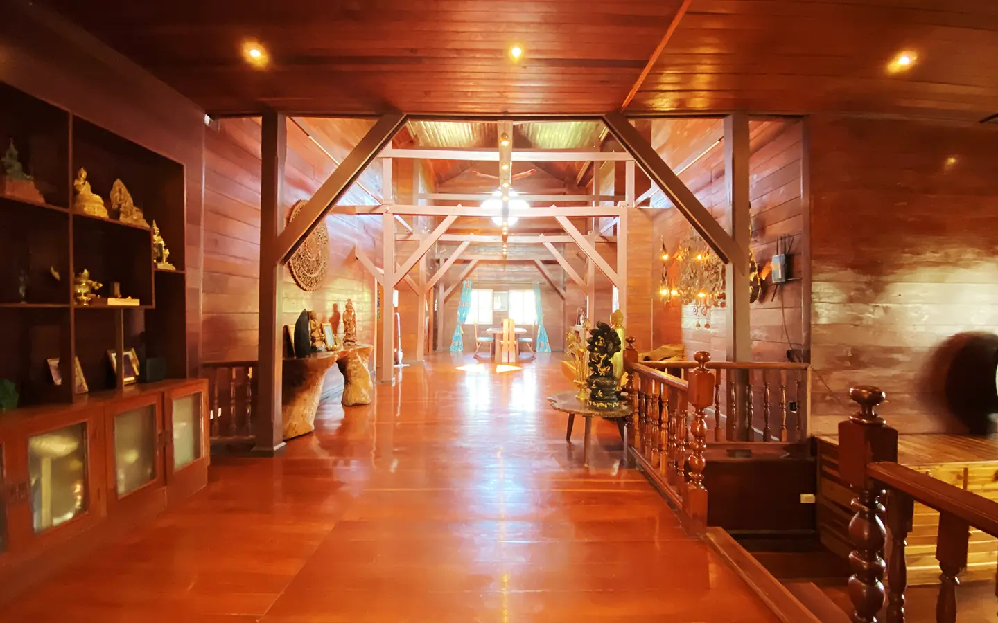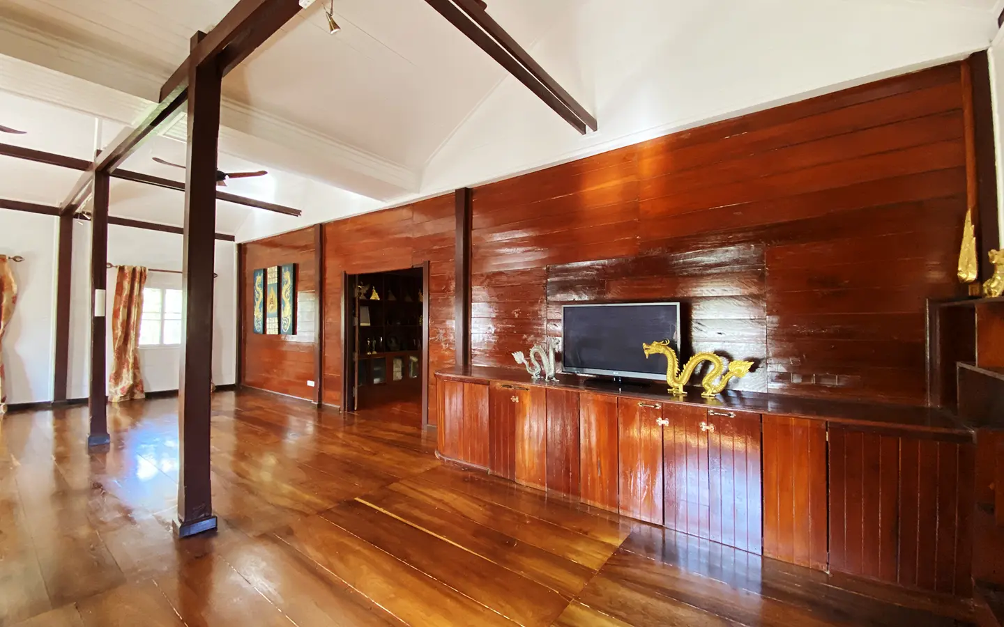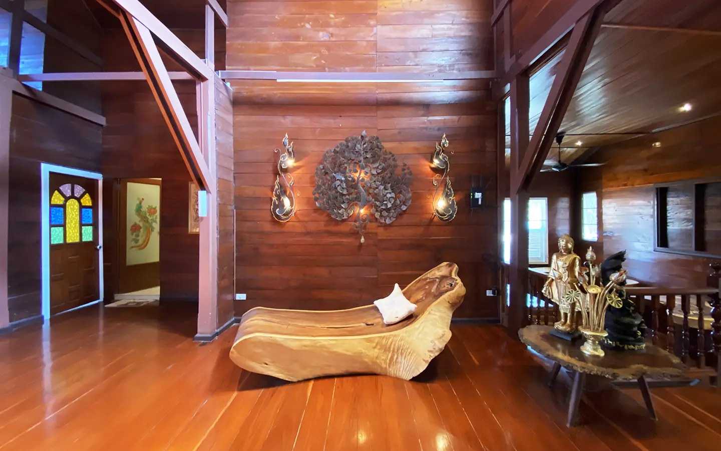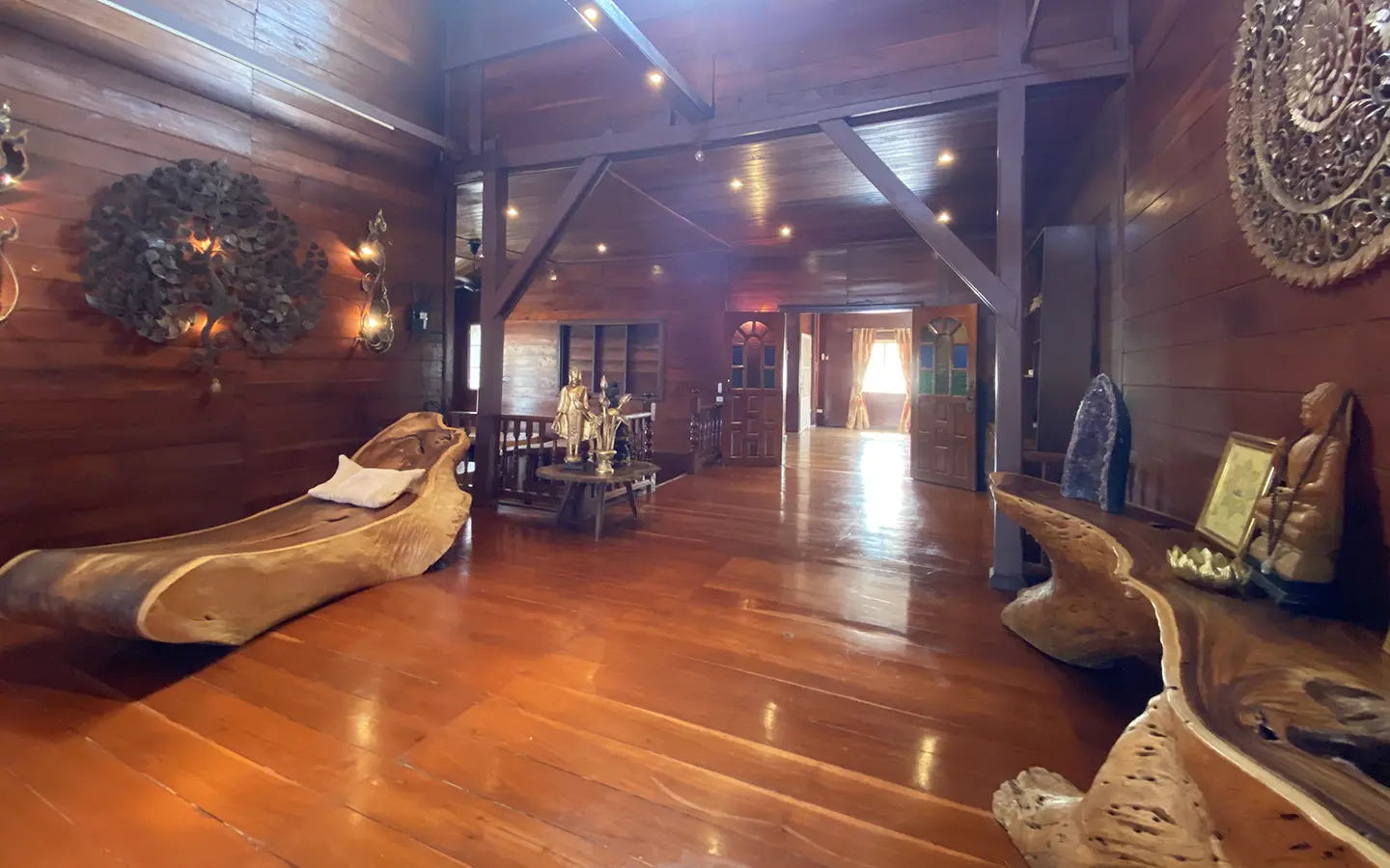 At the front of the house is a large, all-teak wood, covered sitting terrace for outdoor dining/entertaining or simply enjoying nature. Inside, the entire house features gorgeous floor-to-ceiling teak wood in a unique design that must be seen to be truly appreciated.