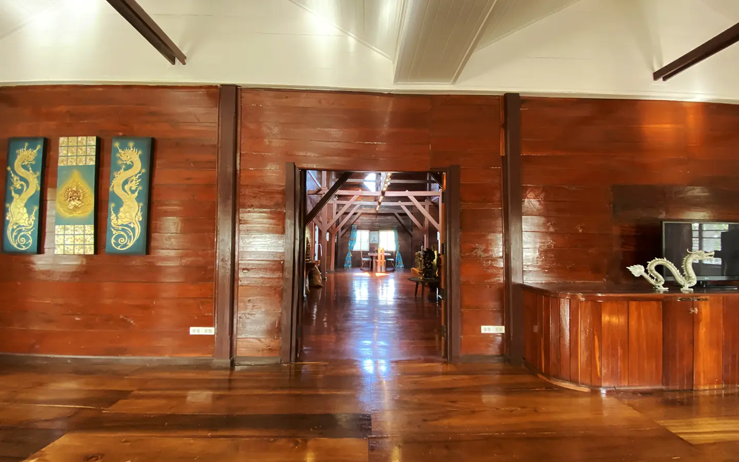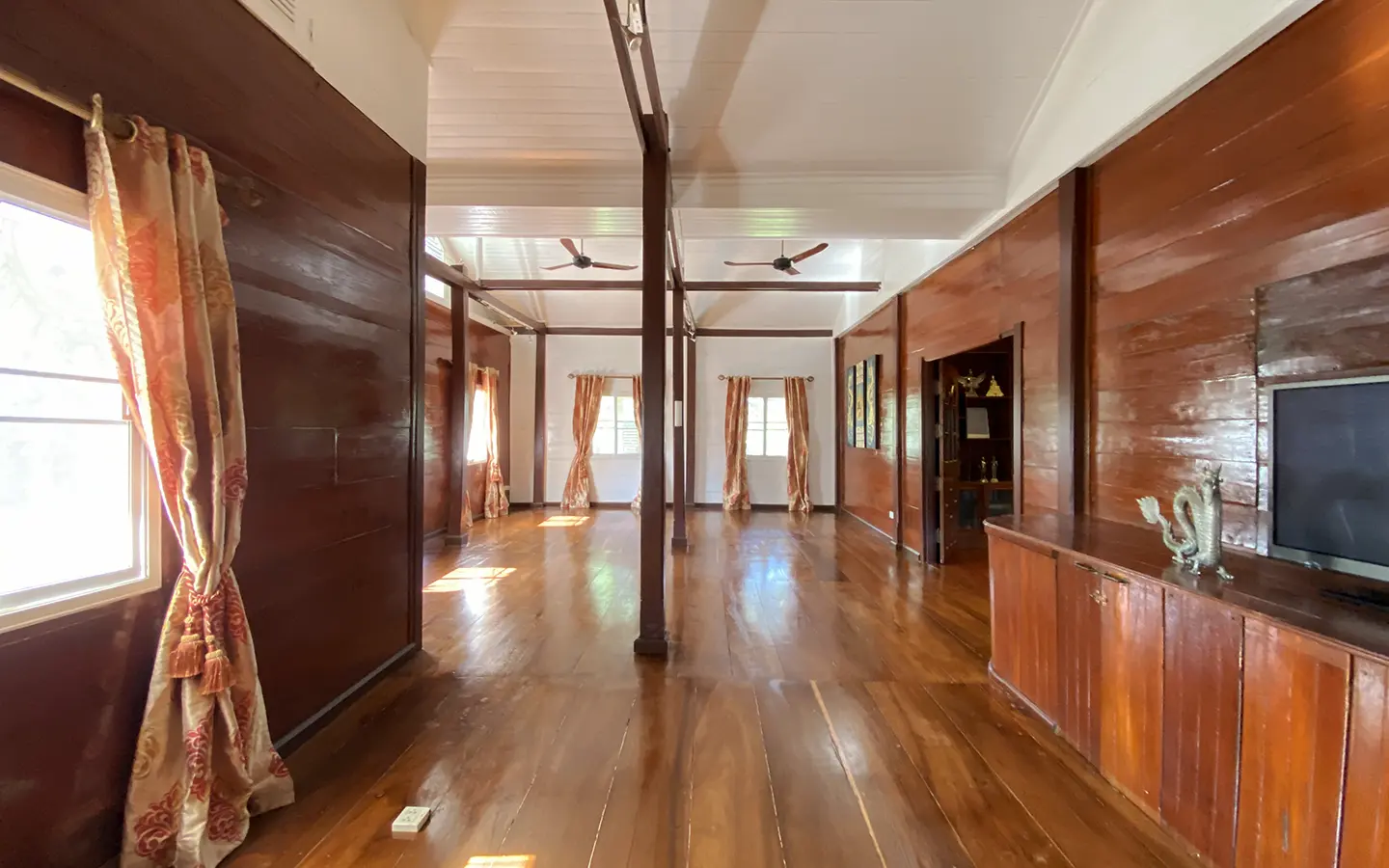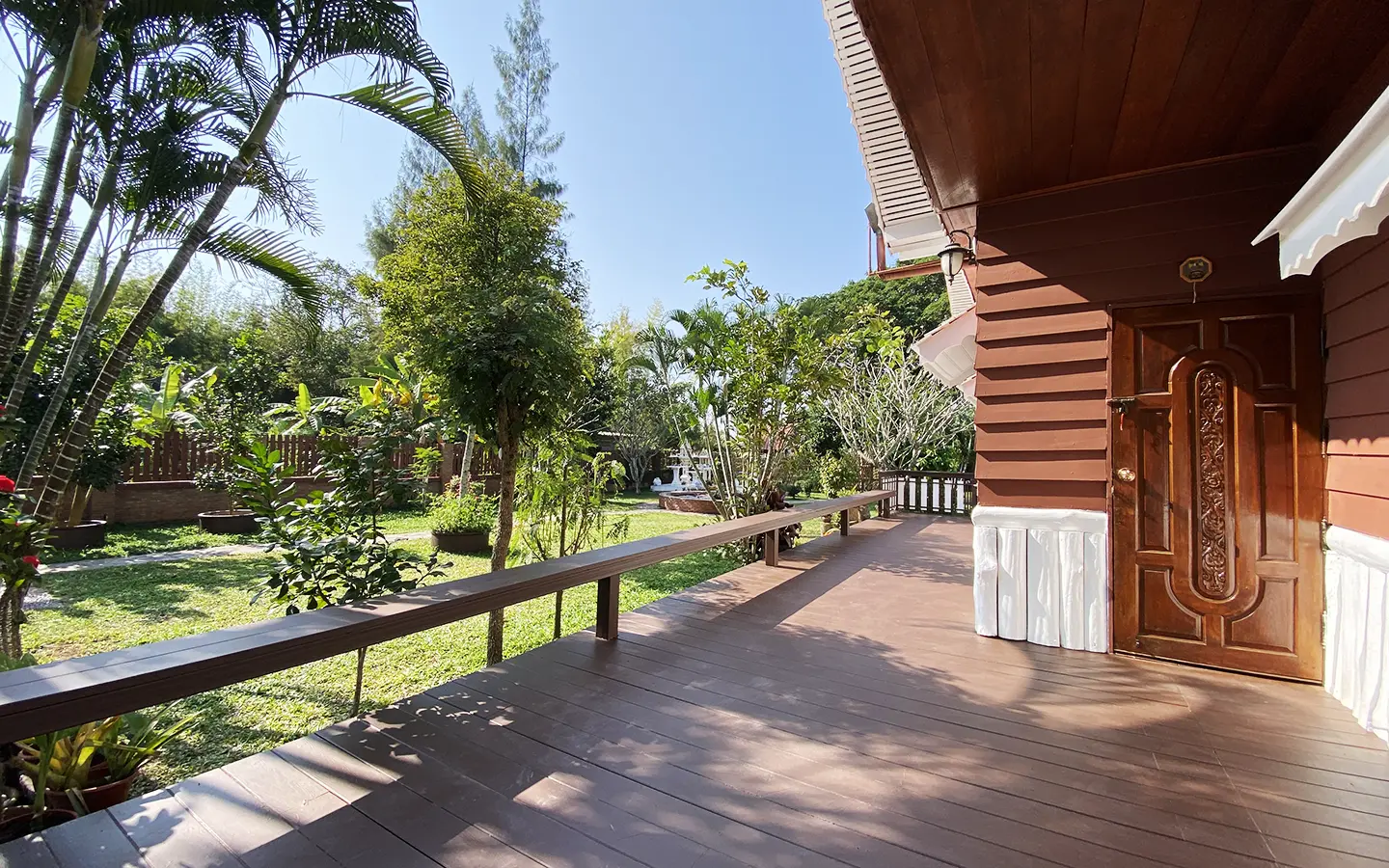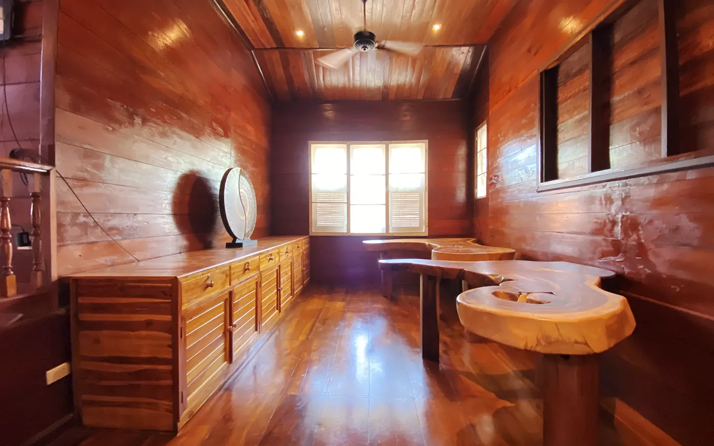 At the front of the house is a large, all-teak wood, covered sitting terrace for outdoor dining/entertaining or simply enjoying nature. Inside, the entire house features gorgeous floor-to-ceiling teak wood in a unique design that must be seen to be truly appreciated.