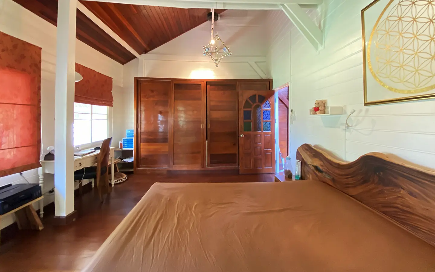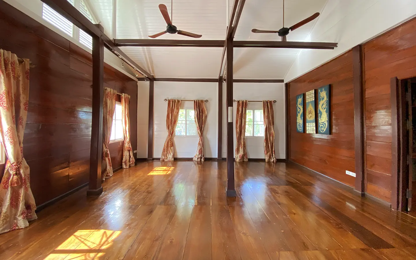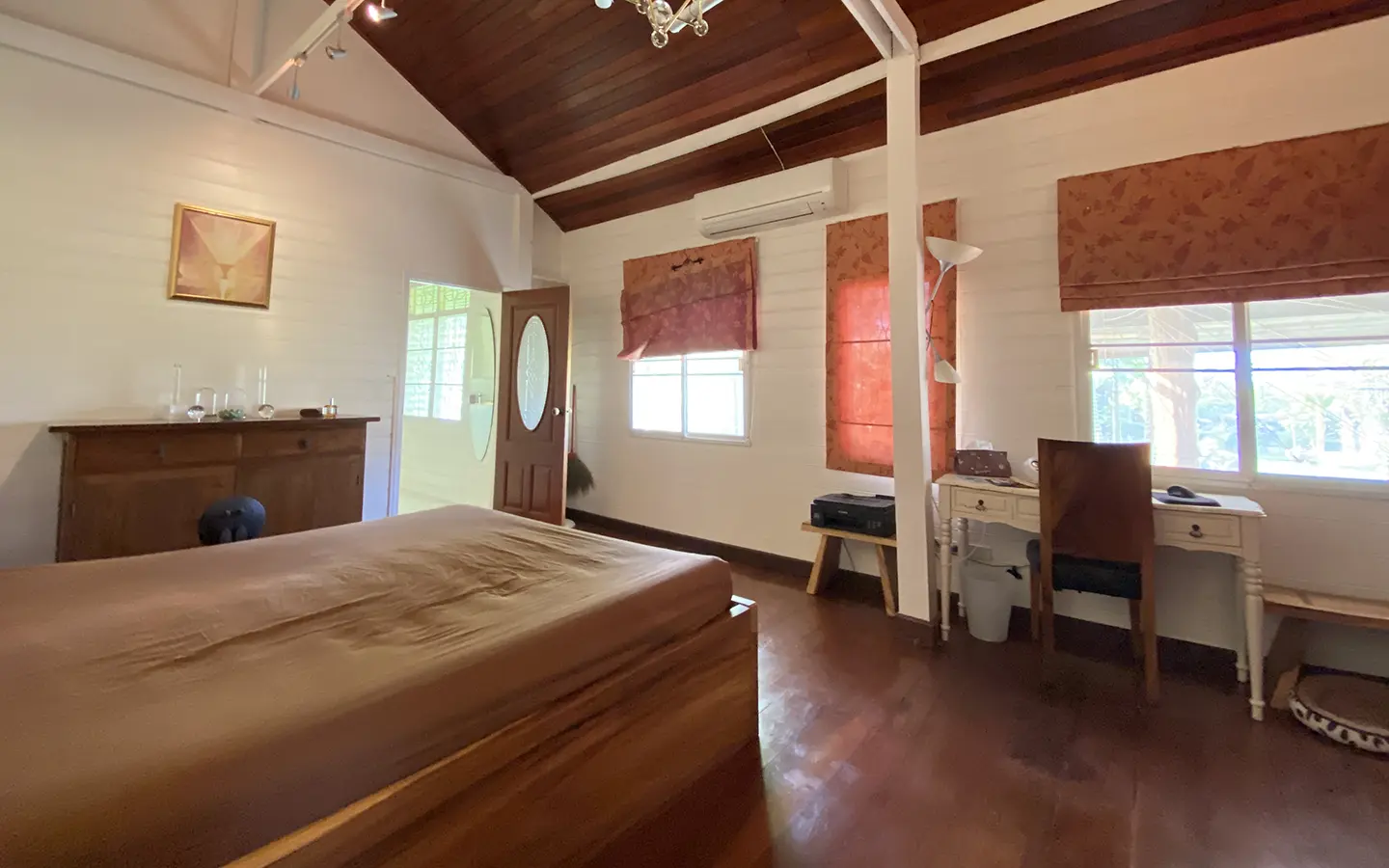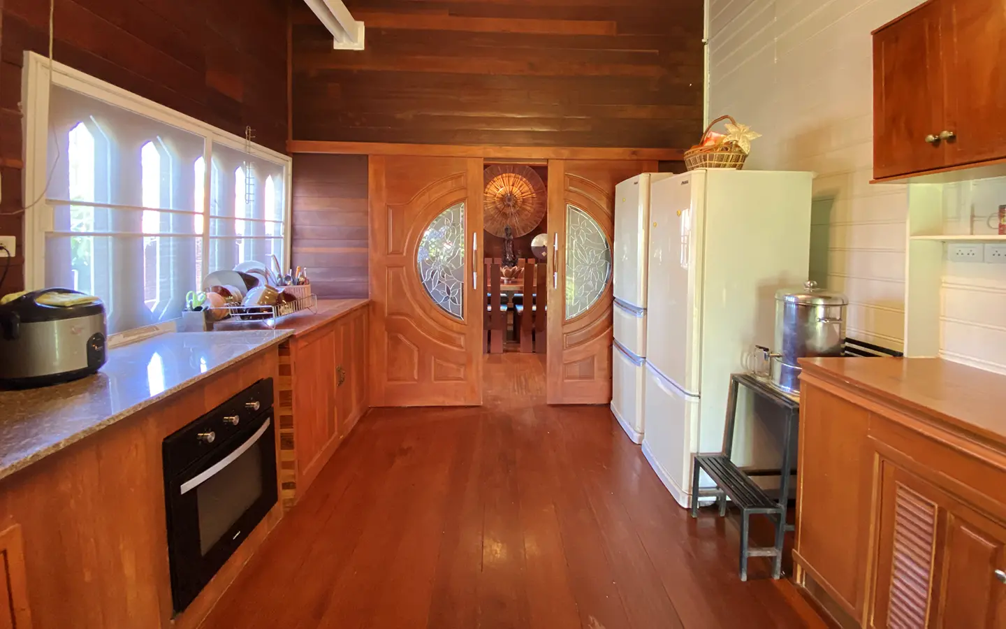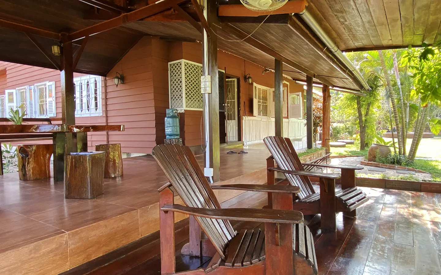 At the front of the house is a large, all-teak wood, covered sitting terrace for outdoor dining/entertaining or simply enjoying nature. Inside, the entire house features gorgeous floor-to-ceiling teak wood in a unique design that must be seen to be truly appreciated.