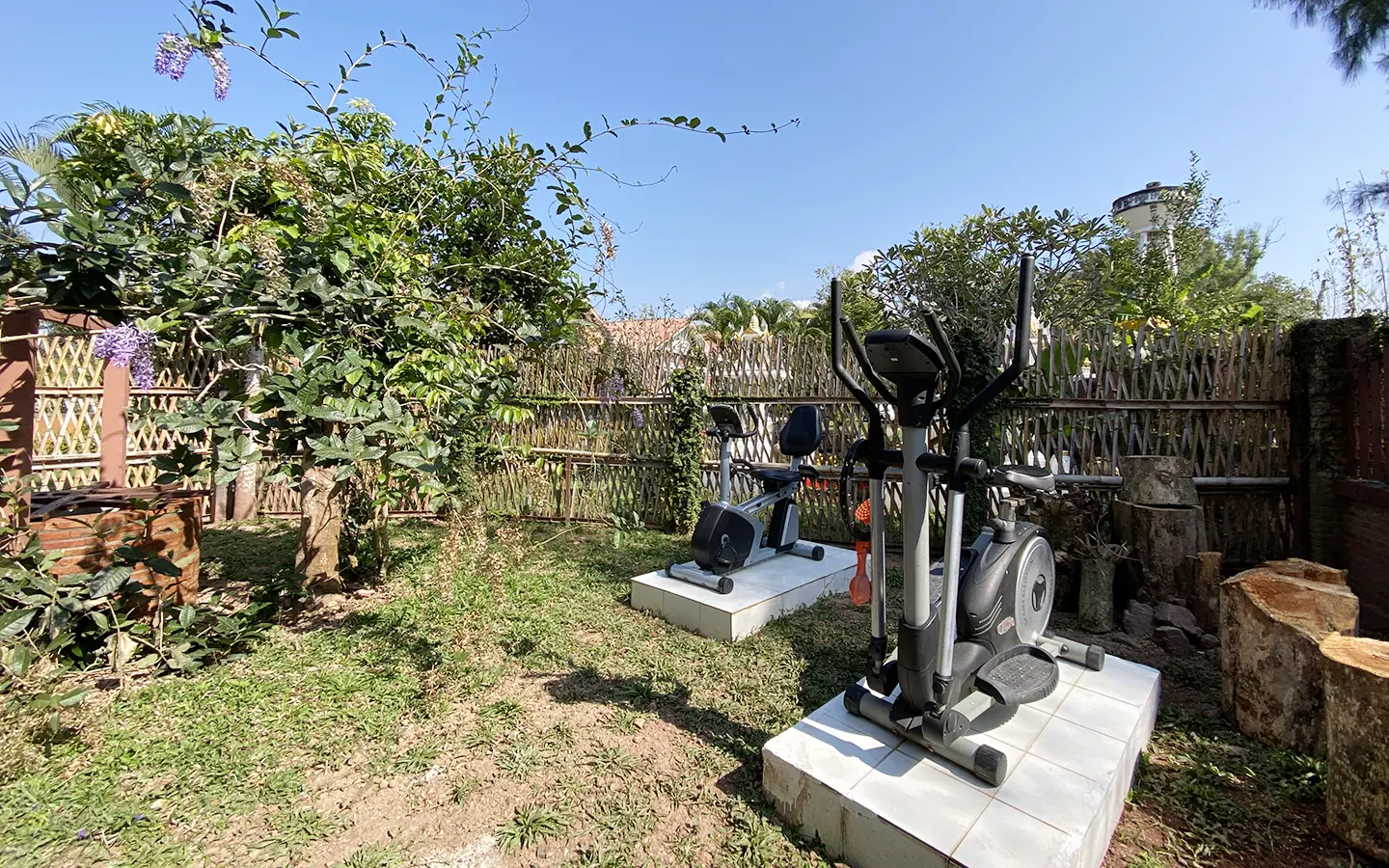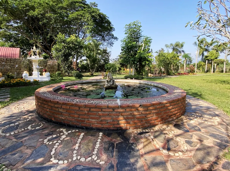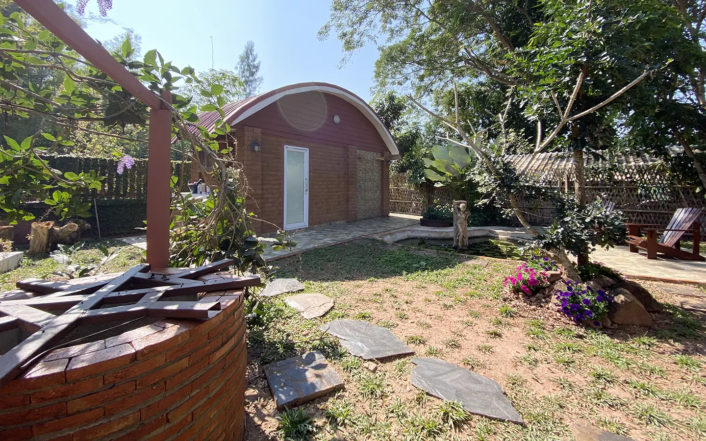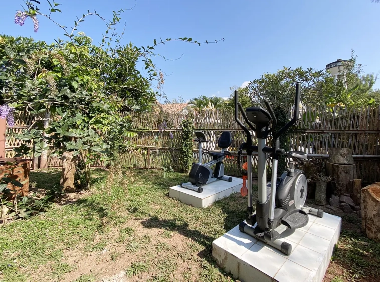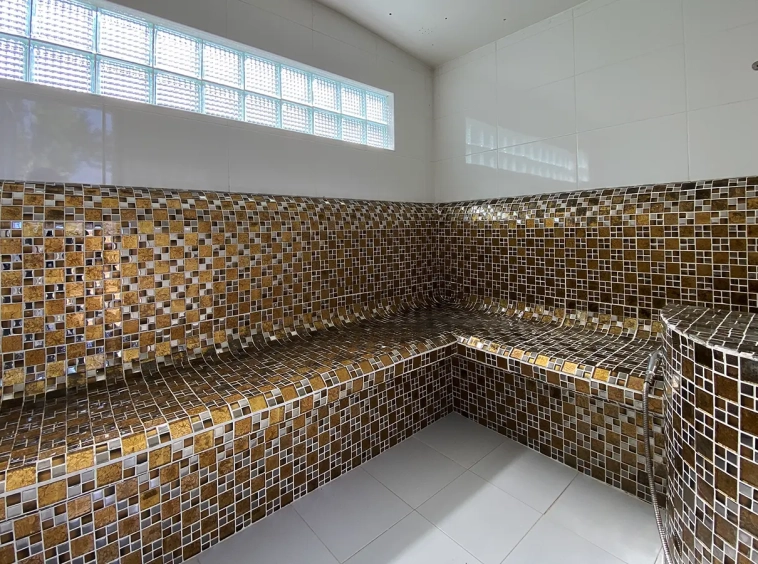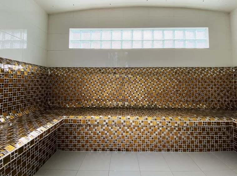 The steam room building can accommodate 5-6 people and comes with a bathroom, a sitting area near the fish pond and an exercise corner.