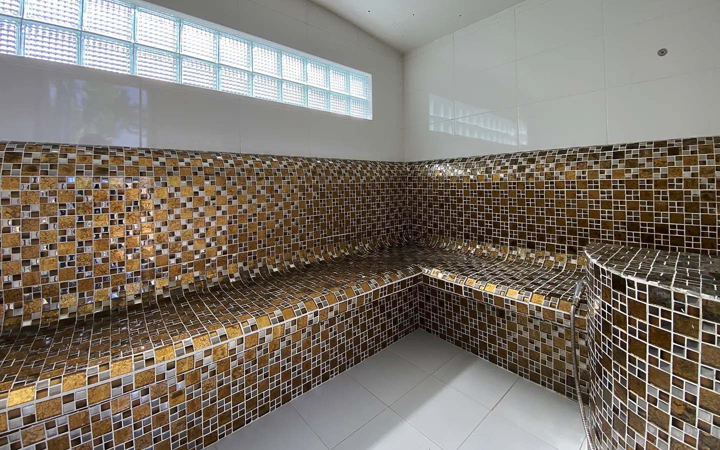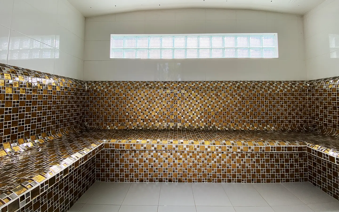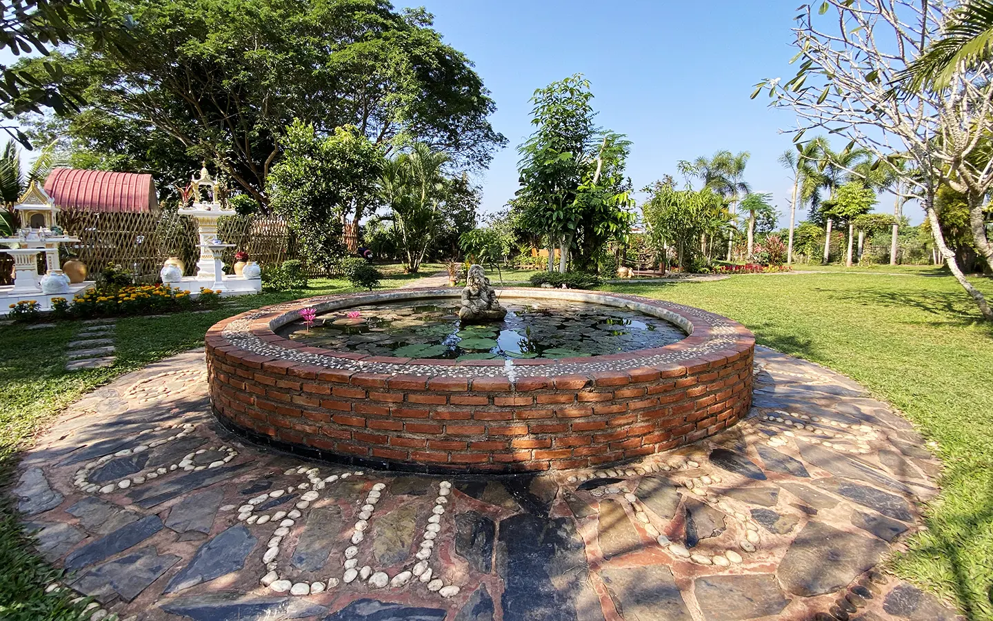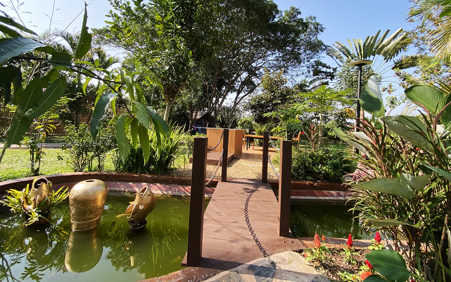 The steam room building can accommodate 5-6 people and comes with a bathroom, a sitting area near the fish pond and an exercise corner.