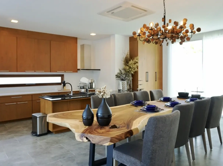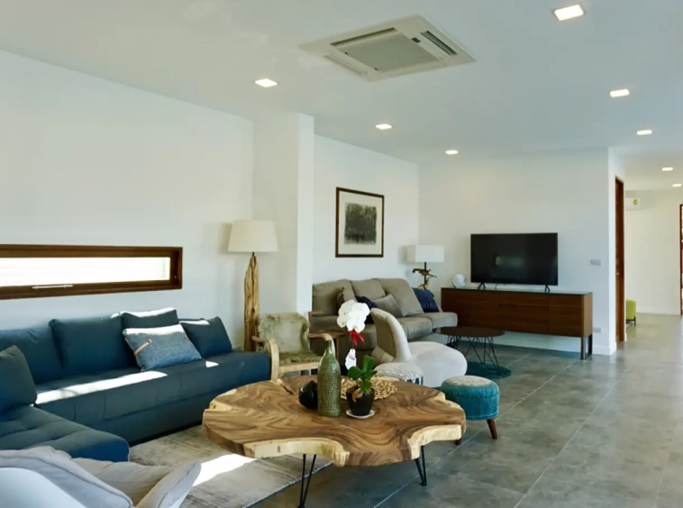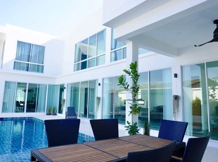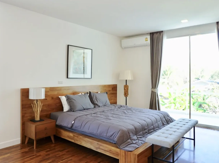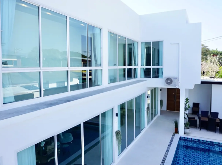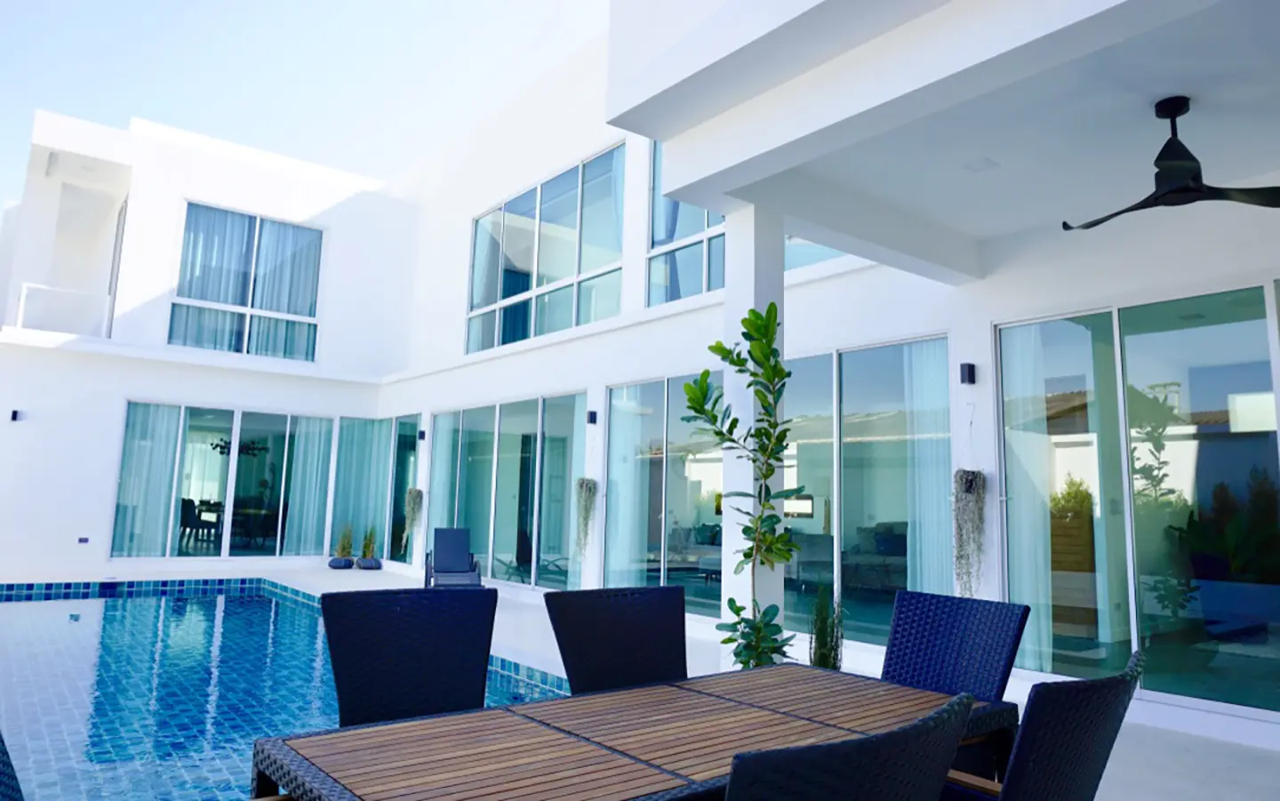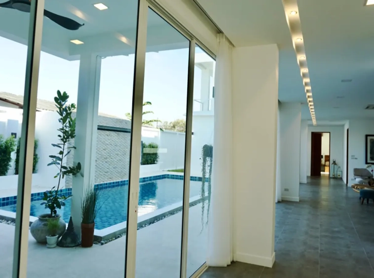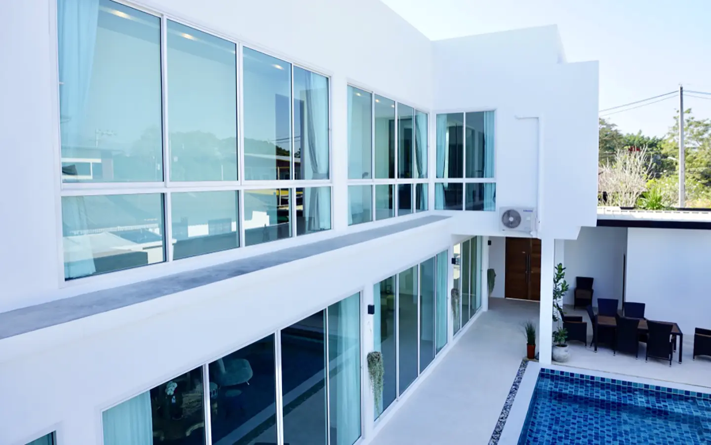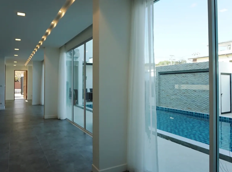 Upon entering the house, there is a hallway with a sitting area and staircase to the second floor. Then there is the living room, which comes with cassette A/C, with all-glass doors open alongside and offering a full view of the pool. The L-shape floor plan leads to the first bedroom, which is en-suite with a shower, then to the large fully fitted Western kitchen with dining table, all still with a view of the pool.