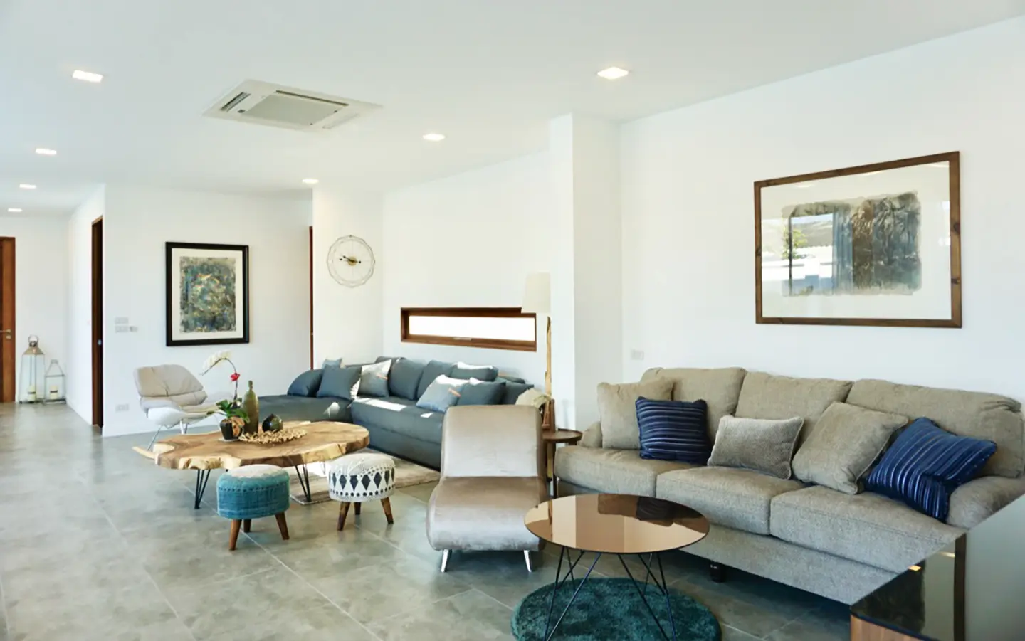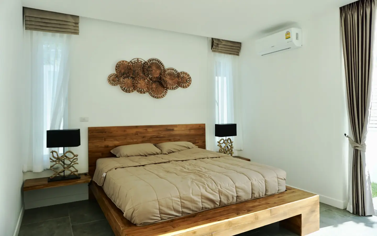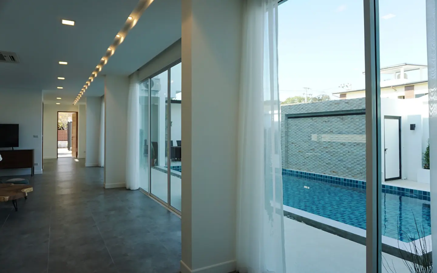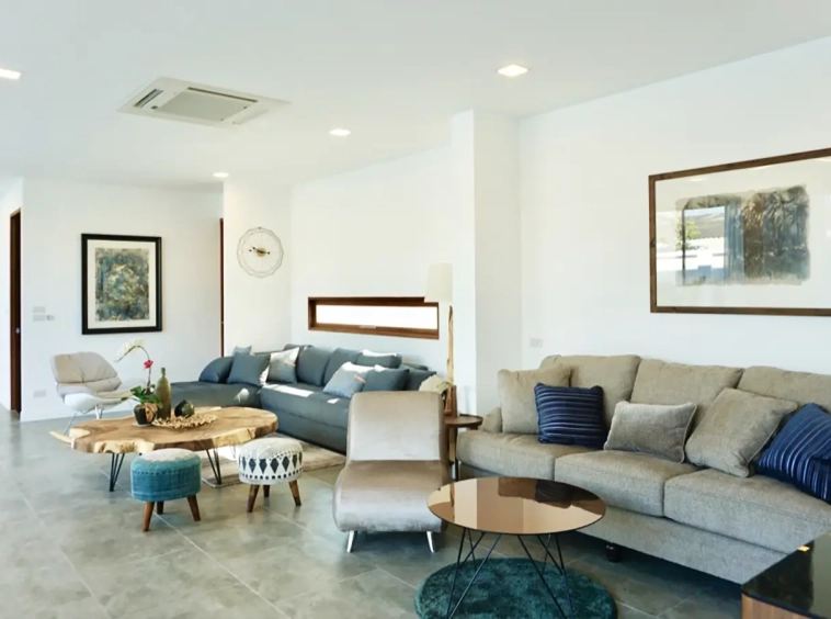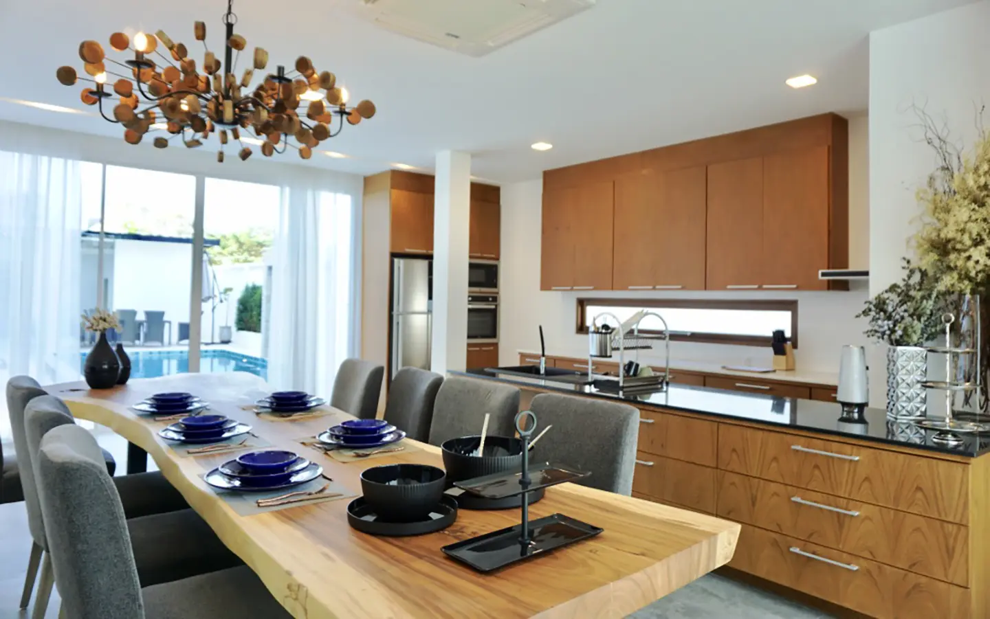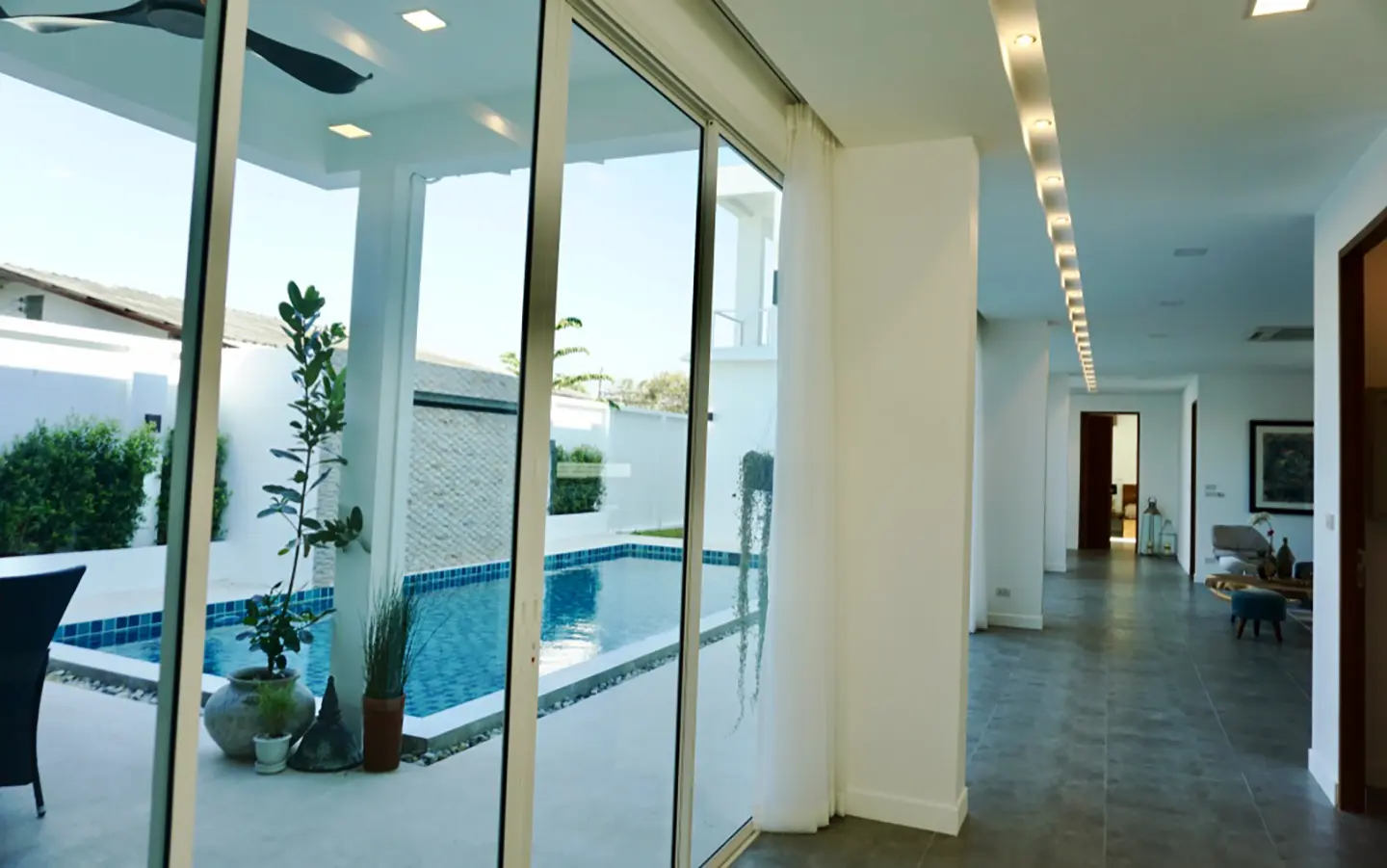 Upon entering the house, there is a hallway with a sitting area and staircase to the second floor. Then there is the living room, which comes with cassette A/C, with all-glass doors open alongside and offering a full view of the pool. The L-shape floor plan leads to the first bedroom, which is en-suite with a shower, then to the large fully fitted Western kitchen with dining table, all still with a view of the pool.