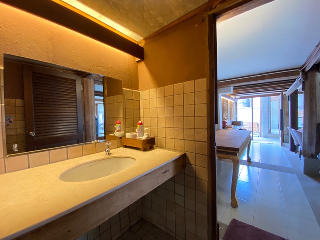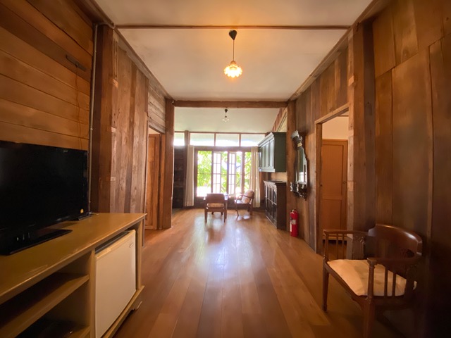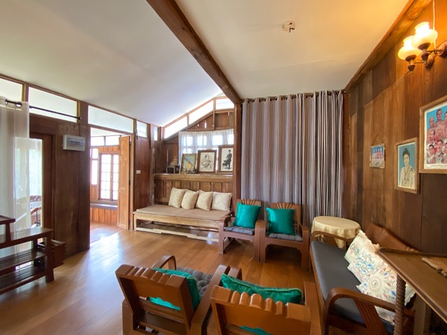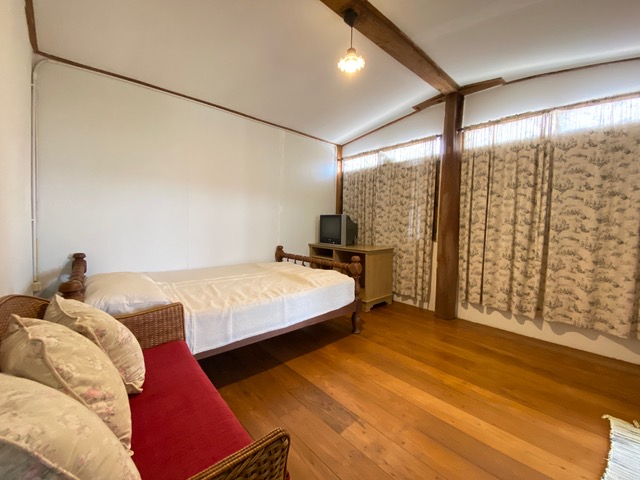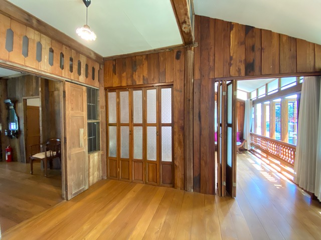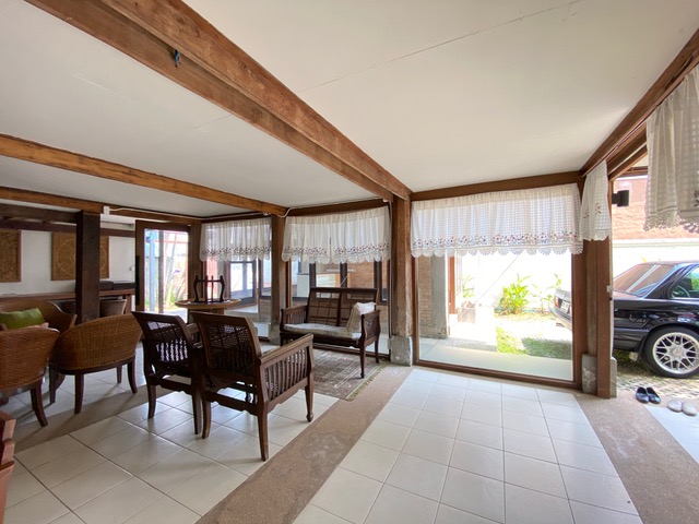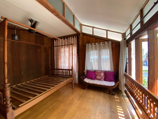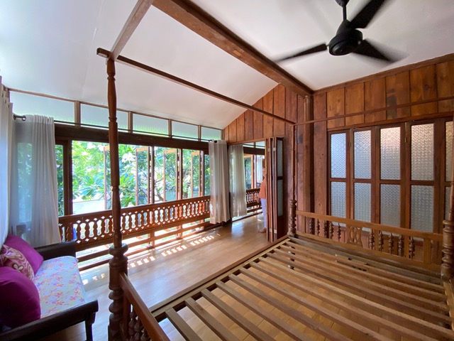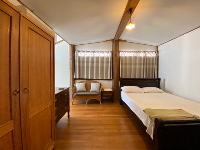 Outside, just beneath the stairs, there is a cosy outside sitting area with a well. A wooden staircase leads to the second floor with a large sitting porch. On the second floor, there is a room that can be used as a bedroom or a study, two further bedrooms, both ensuite, a sitting area and a pantry for preparing breakfast or a simple snack. The house provides good wind flow and it is almost always cool. Beautiful wooden floor and ceiling beams throughout. Unlike other wooden houses, this house is not dark and gloomy, there are white walls and glass window panes and a lot of open spaces. The garden is mostly a cobblestone lawn and some mature trees providing shade during the day. The house really must be seen to truly appreciate its charm and practicality.