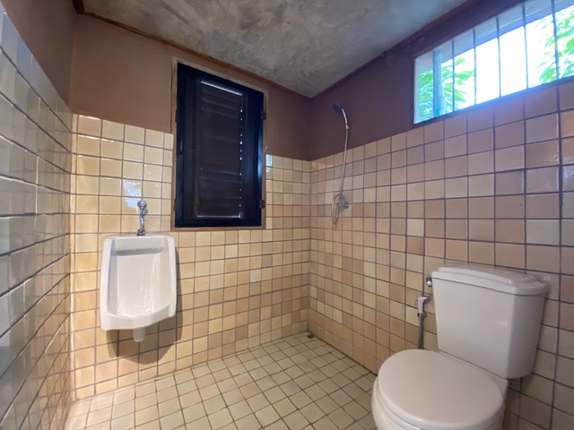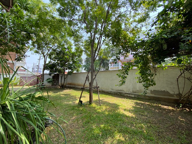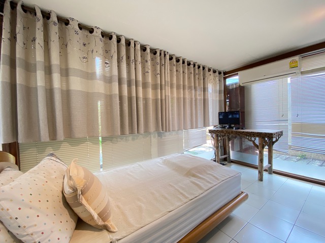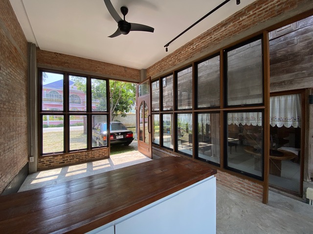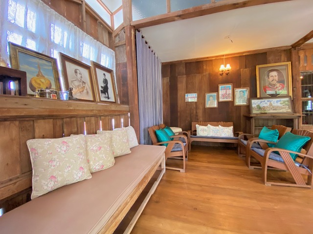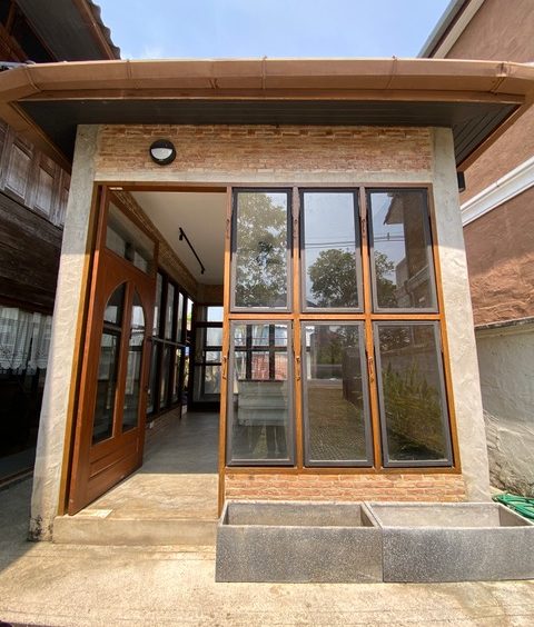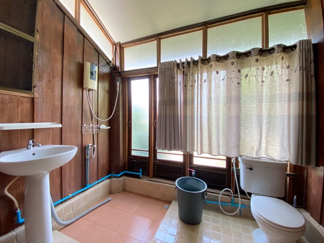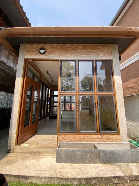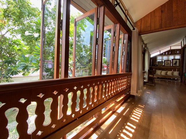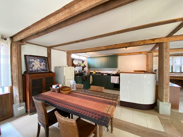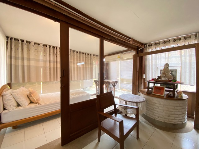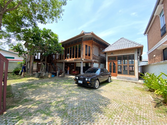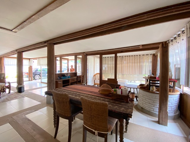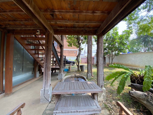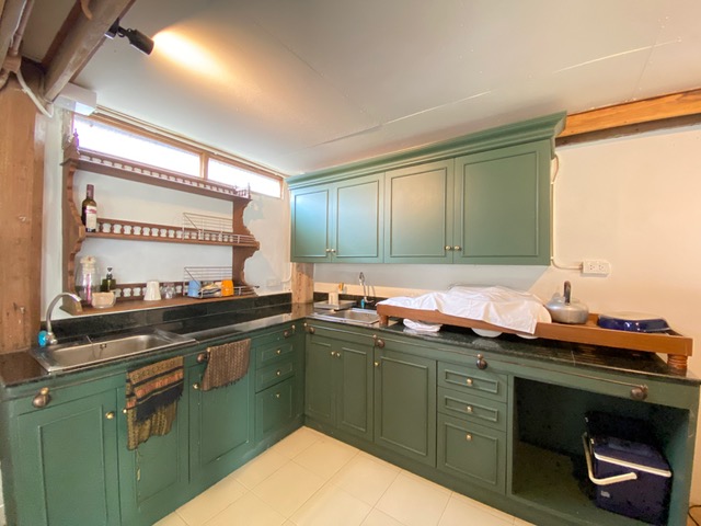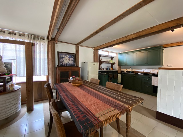 The house occupies just under 100 sqw of land, it is fenced in with a lovely hedge to hide the wall and cosy cobblestone-style ground. A cute new building in a similar style has been added that can be used as a cafe or a small bakery, it is fully a/c and ceiling fan. The main house is open on the ground floor as in normal Thai style, however, most parts now have glass walls so still provides a sense of being 'open'. Inside, there are beautiful wood beams ceilings and a large open area. There is a sitting area, guest bathroom, dining area and a lovely Western kitchen. A small day room is here as well.