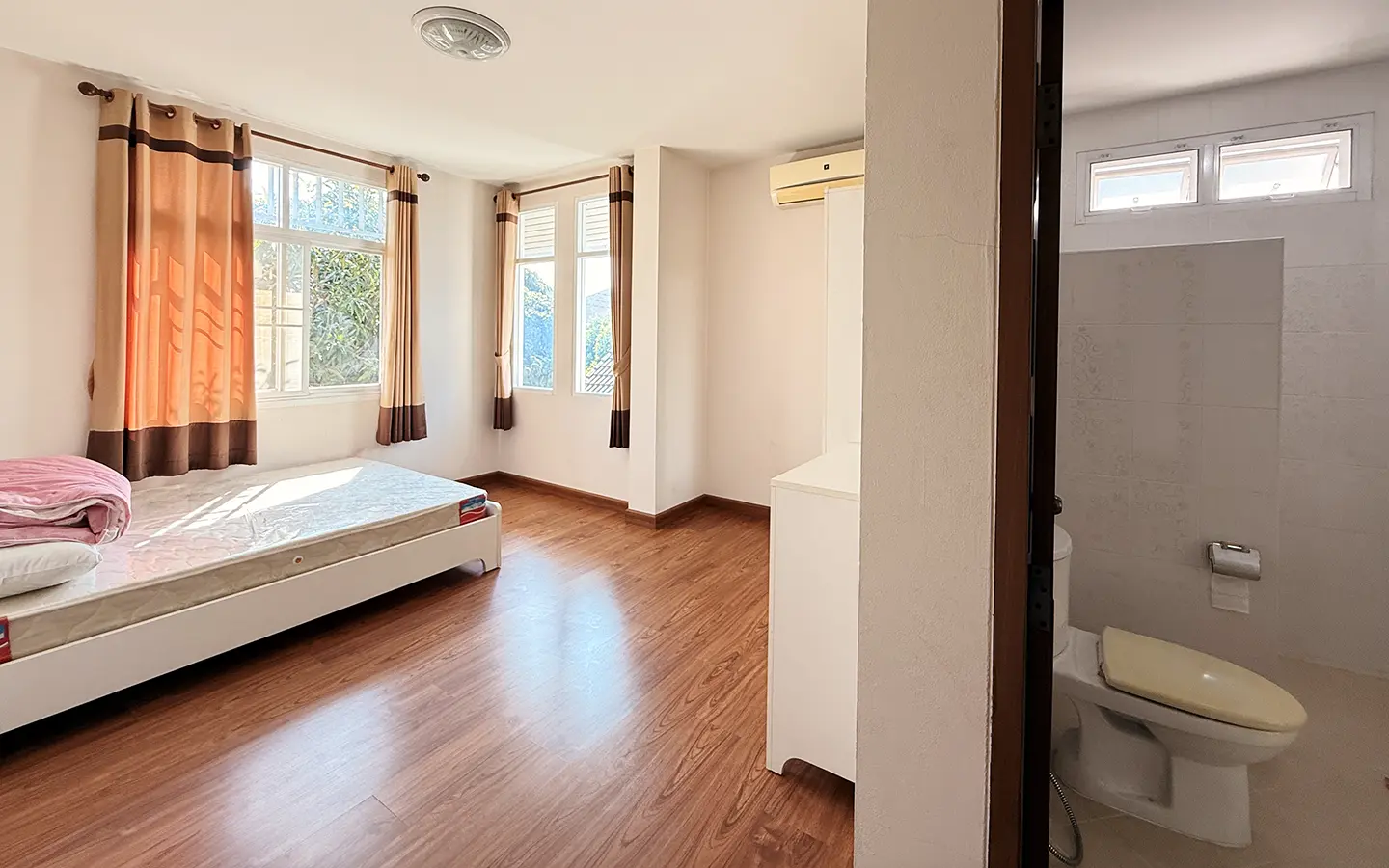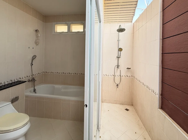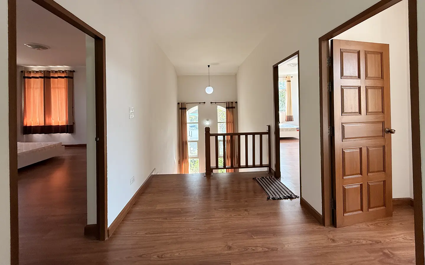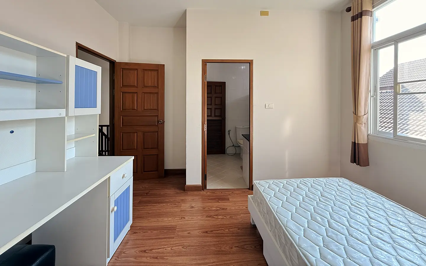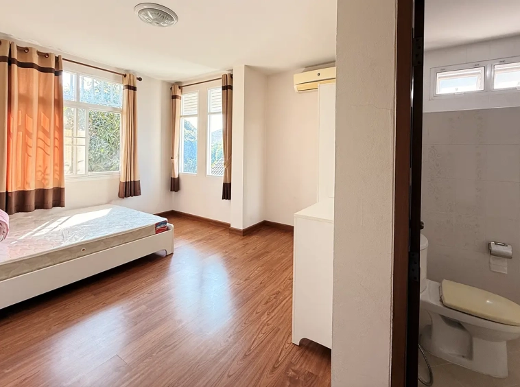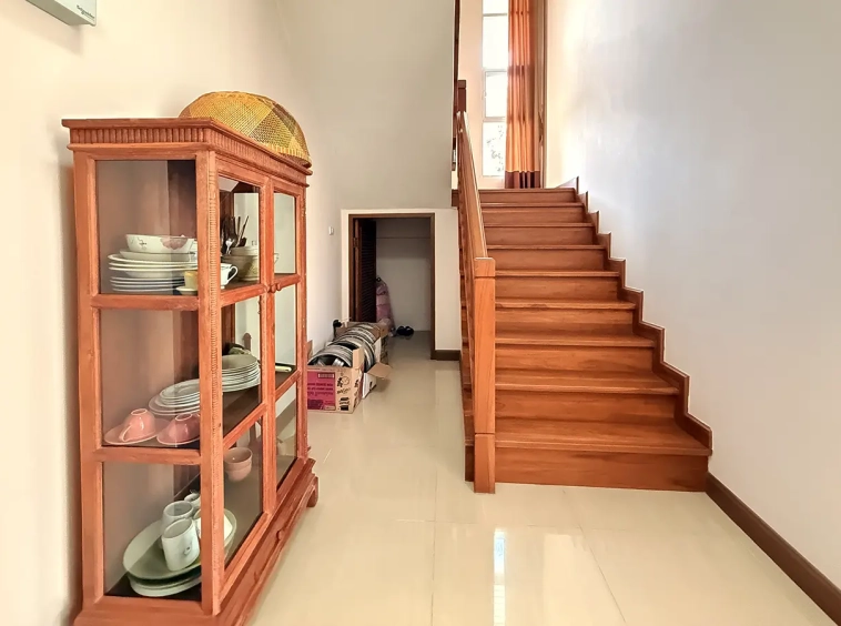 Upstairs, a solid teakwood staircase leads to the second floor. All bedroom doors and frames are crafted from genuine teakwood, adding warmth and elegance. The upper landing provides a versatile sitting area that can be used as a workspace or reading corner, complemented by large windows that bring in abundant natural light. To the left is the master bedroom, featuring space to create a walk-in closet, an en-suite bathroom, an outdoor shower, and a private balcony ideal for relaxing and enjoying outdoor living. To the right of the staircase are two additional bedrooms sharing one bathroom.