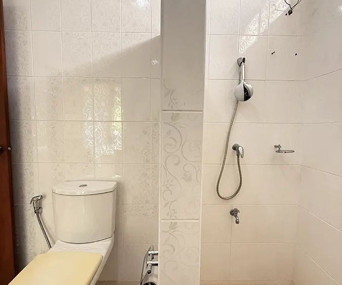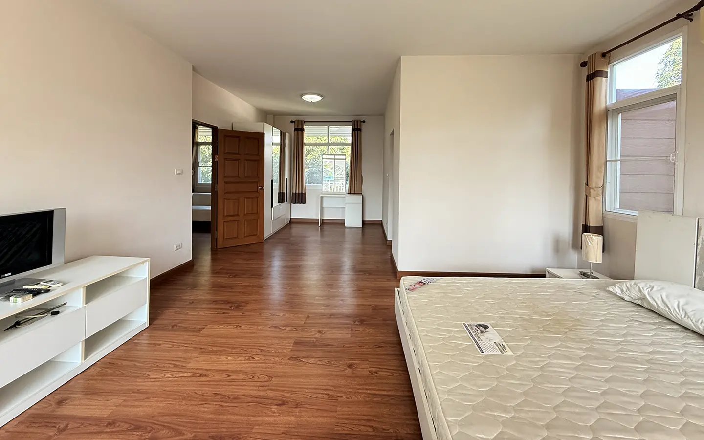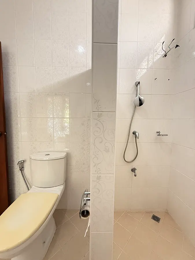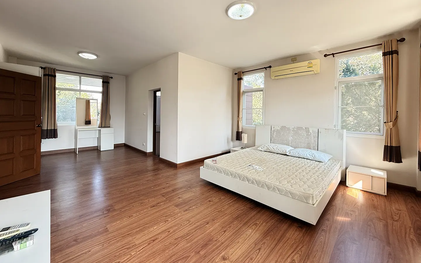 Upstairs, a solid teakwood staircase leads to the second floor. All bedroom doors and frames are crafted from genuine teakwood, adding warmth and elegance. The upper landing provides a versatile sitting area that can be used as a workspace or reading corner, complemented by large windows that bring in abundant natural light. To the left is the master bedroom, featuring space to create a walk-in closet, an en-suite bathroom, an outdoor shower, and a private balcony ideal for relaxing and enjoying outdoor living. To the right of the staircase are two additional bedrooms sharing one bathroom.