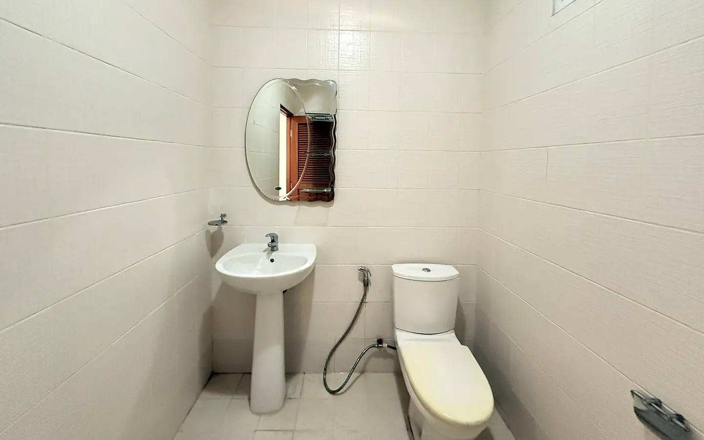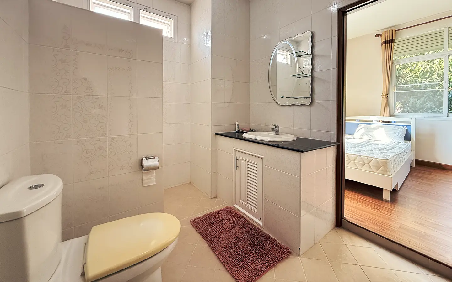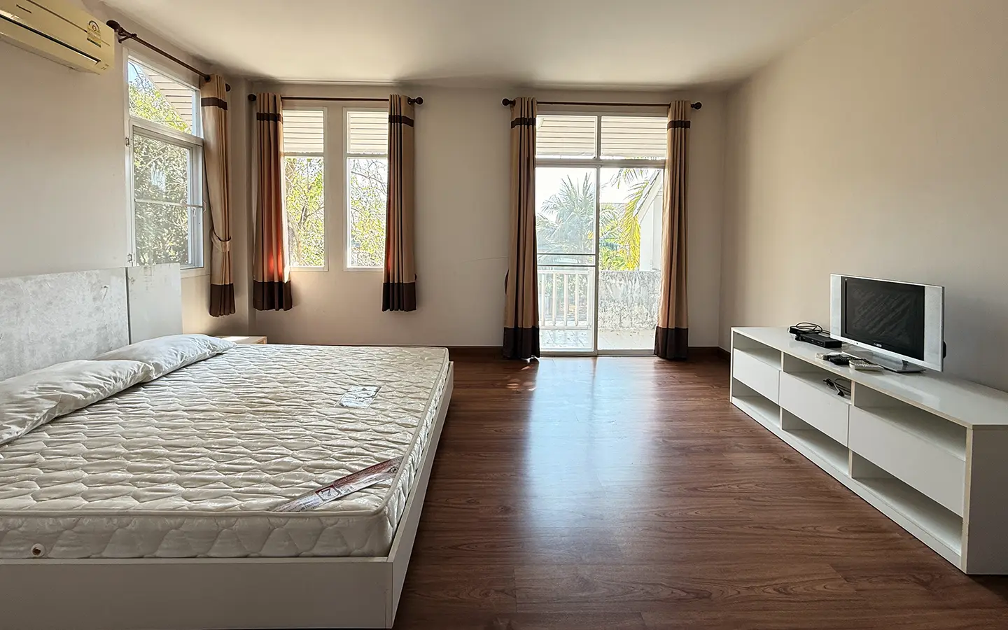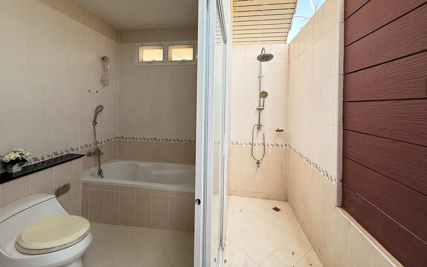Upstairs, a solid teakwood staircase leads to the second floor. All bedroom doors and frames are crafted from genuine teakwood, adding warmth and elegance. The upper landing provides a versatile sitting area that can be used as a workspace or reading corner, complemented by large windows that bring in abundant natural light. To the left is the master bedroom, featuring space to create a walk-in closet, an en-suite bathroom, an outdoor shower, and a private balcony ideal for relaxing and enjoying outdoor living. To the right of the staircase are two additional bedrooms sharing one bathroom.