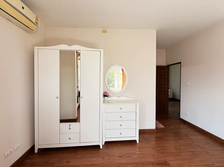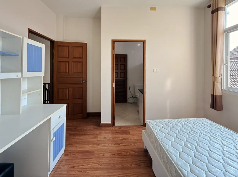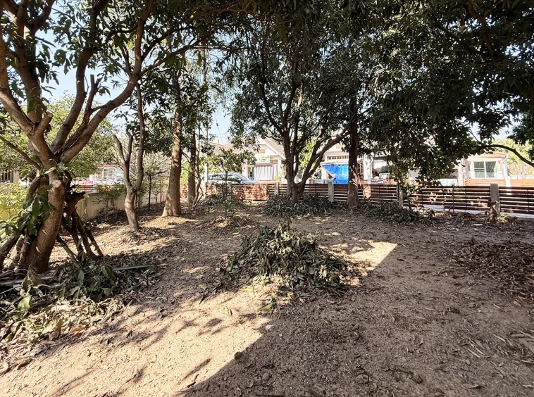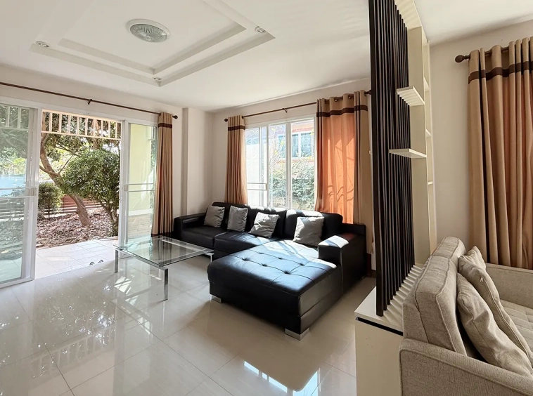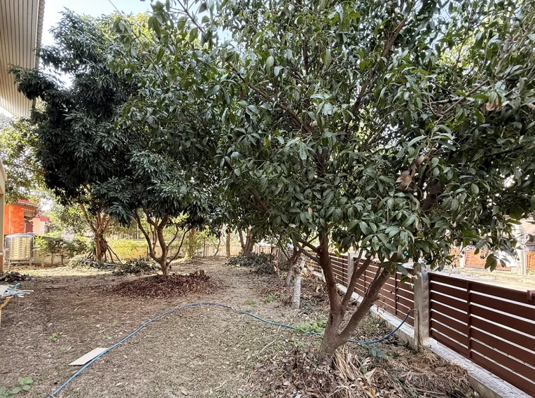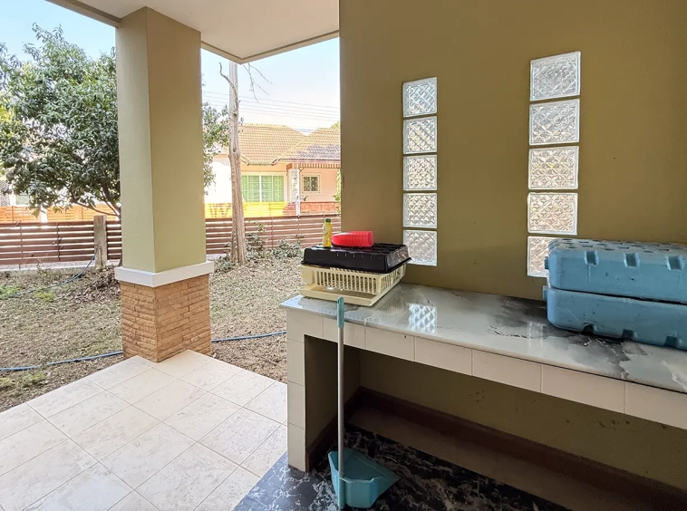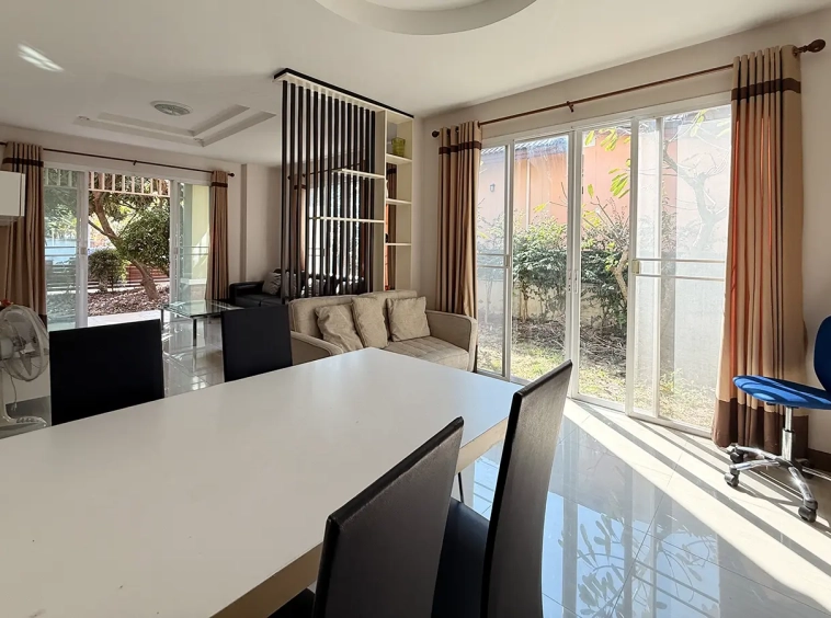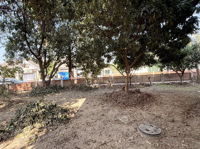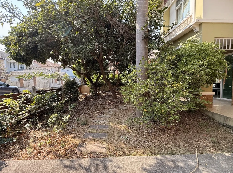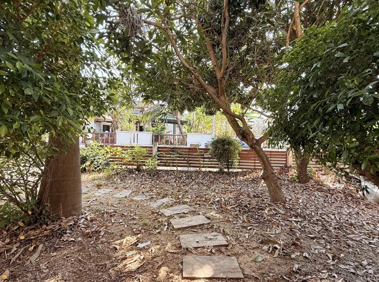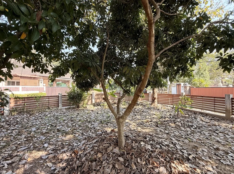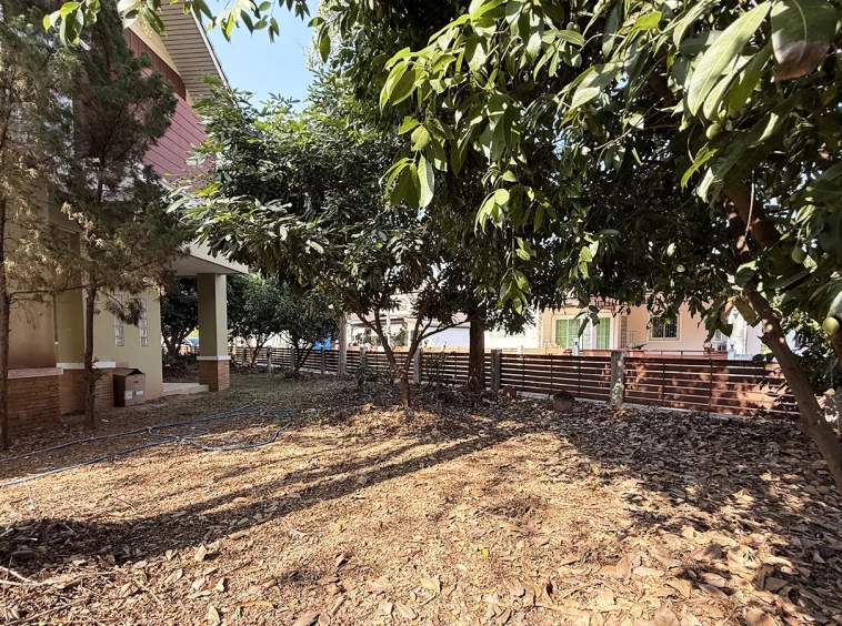 Outside, the garden includes longan trees, enhancing the peaceful atmosphere. As a corner plot with a triangular land shape, the property offers added privacy and character. The common area fee is 16,224 THB per year, and the village provides 24-hour security for your peace of mind.