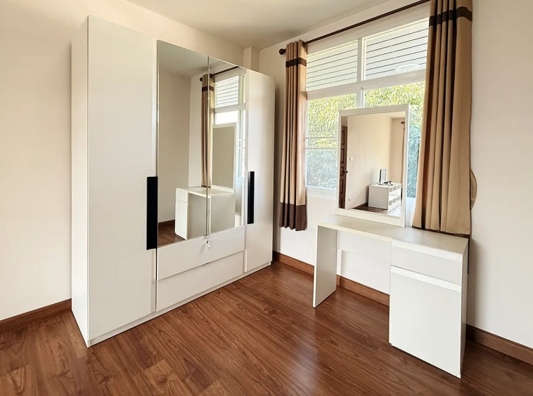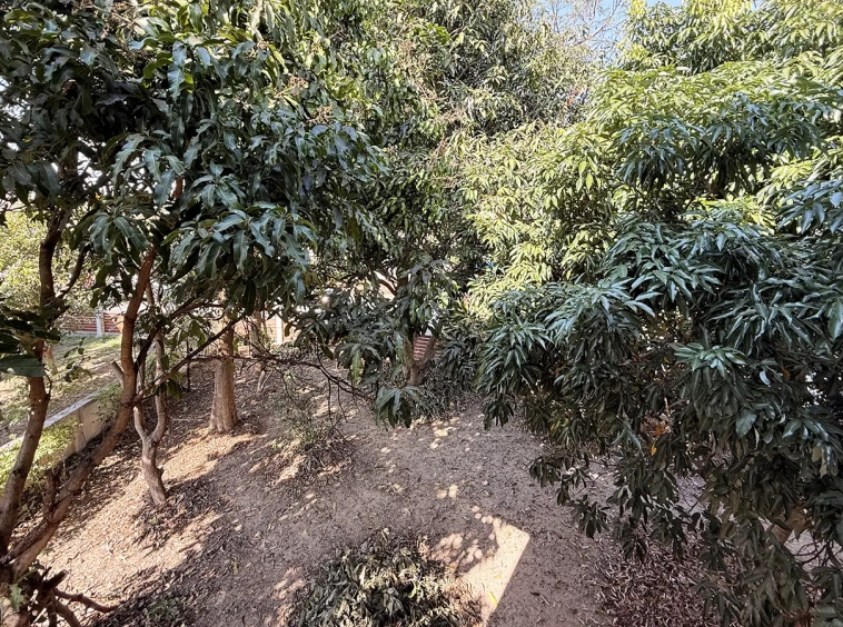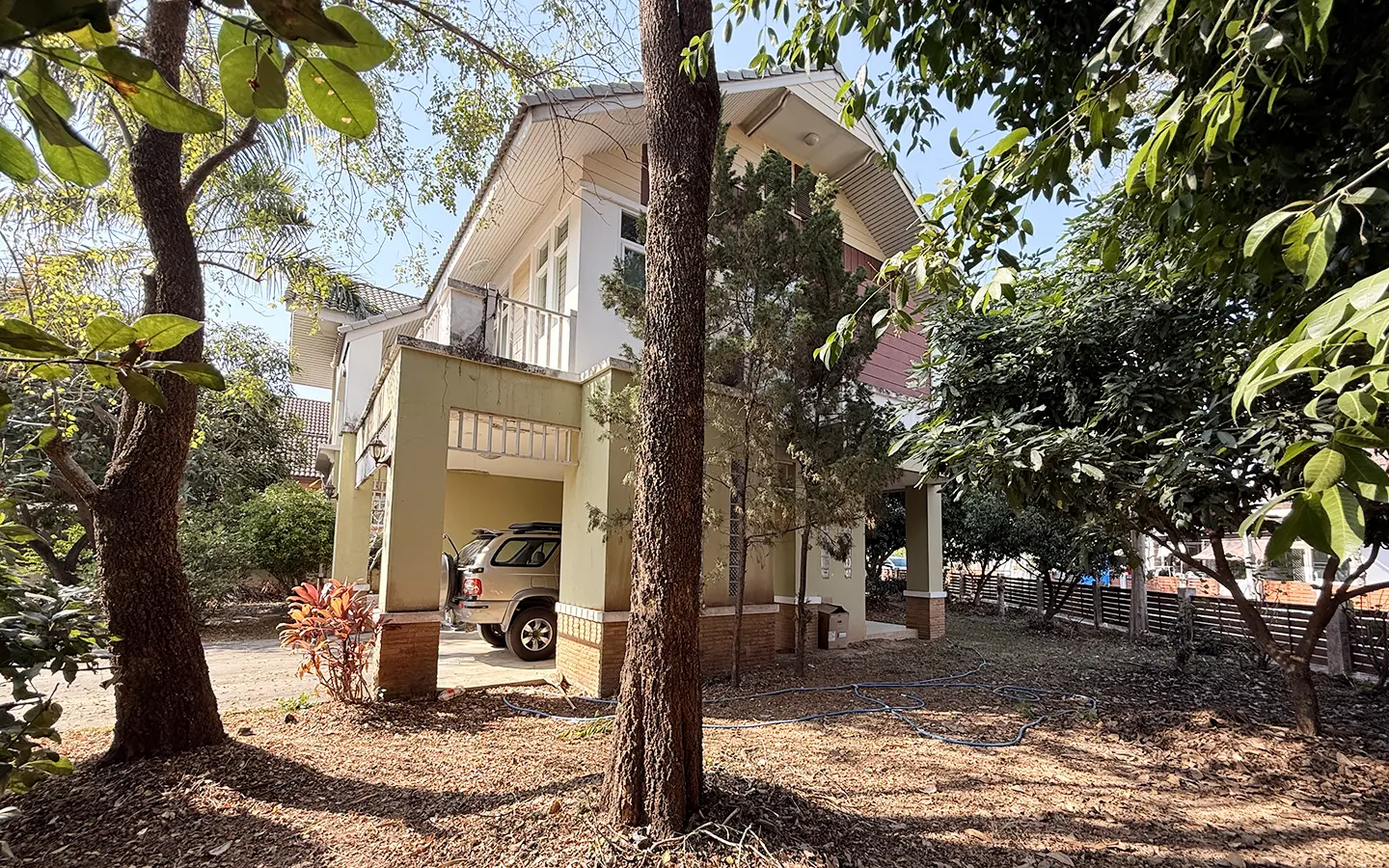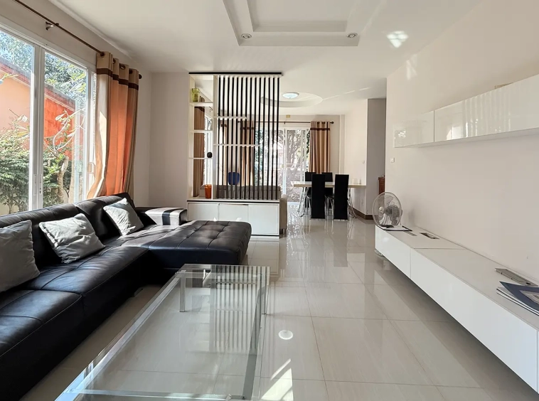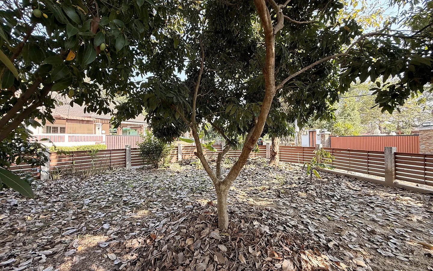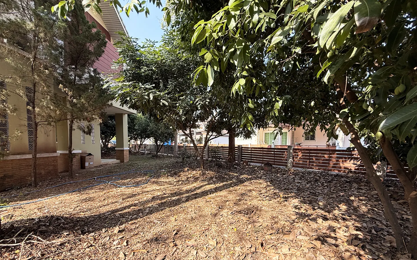 Outside, the garden includes longan trees, enhancing the peaceful atmosphere. As a corner plot with a triangular land shape, the property offers added privacy and character. The common area fee is 16,224 THB per year, and the village provides 24-hour security for your peace of mind.