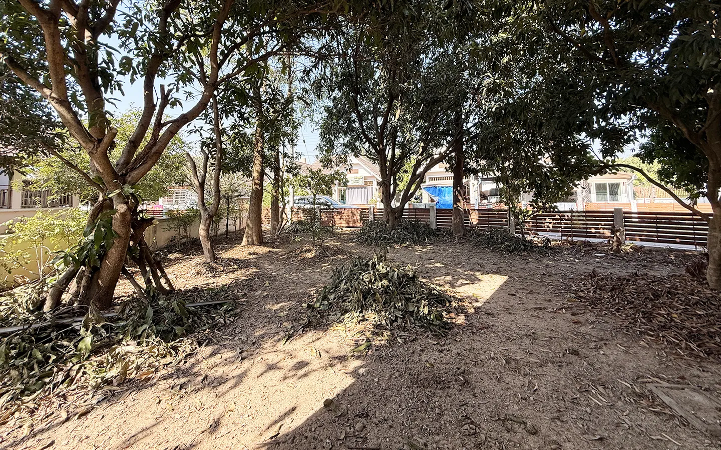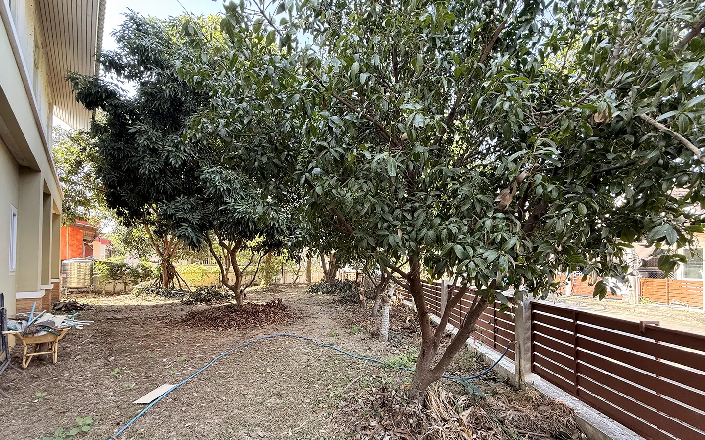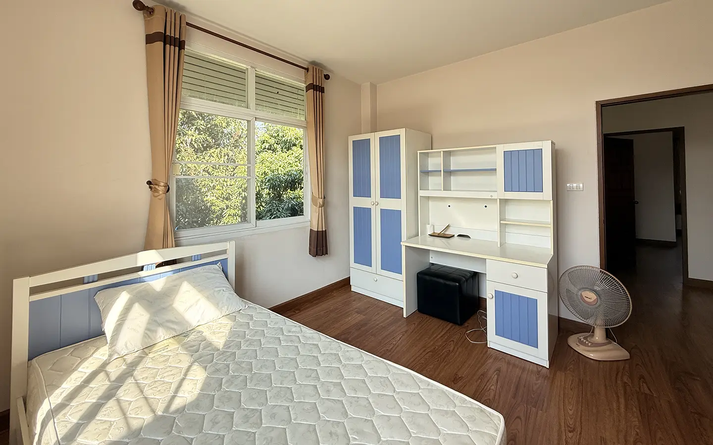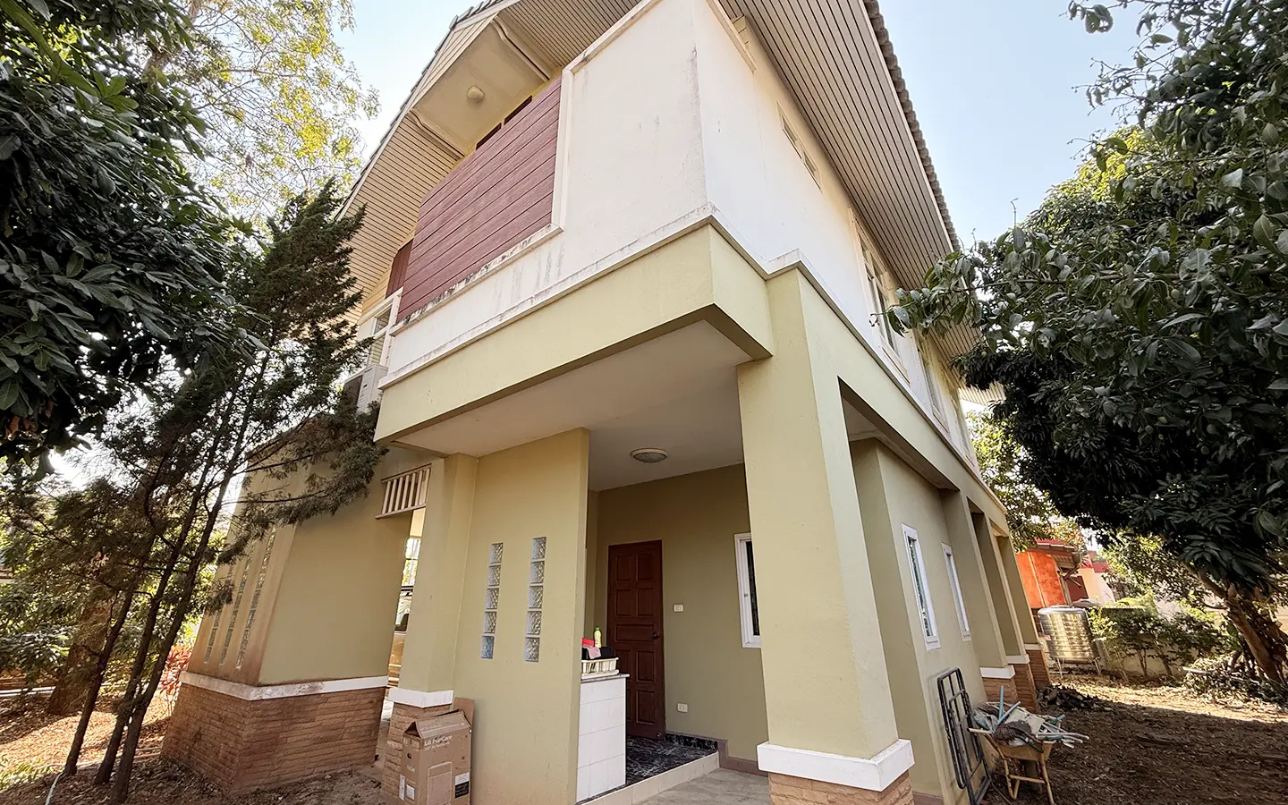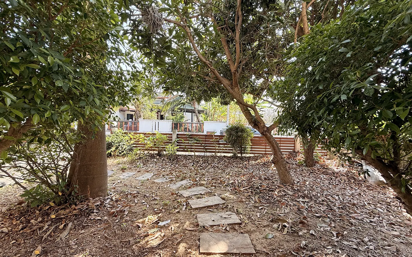 Outside, the garden includes longan trees, enhancing the peaceful atmosphere. As a corner plot with a triangular land shape, the property offers added privacy and character. The common area fee is 16,224 THB per year, and the village provides 24-hour security for your peace of mind.