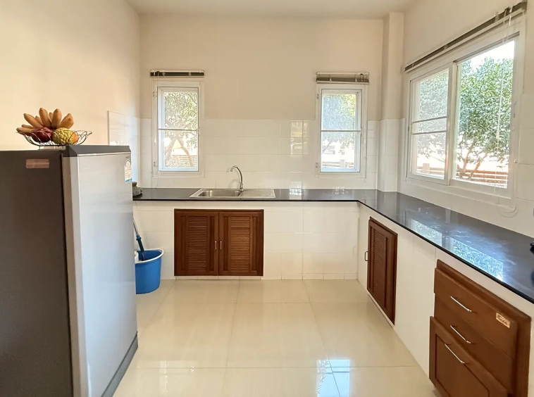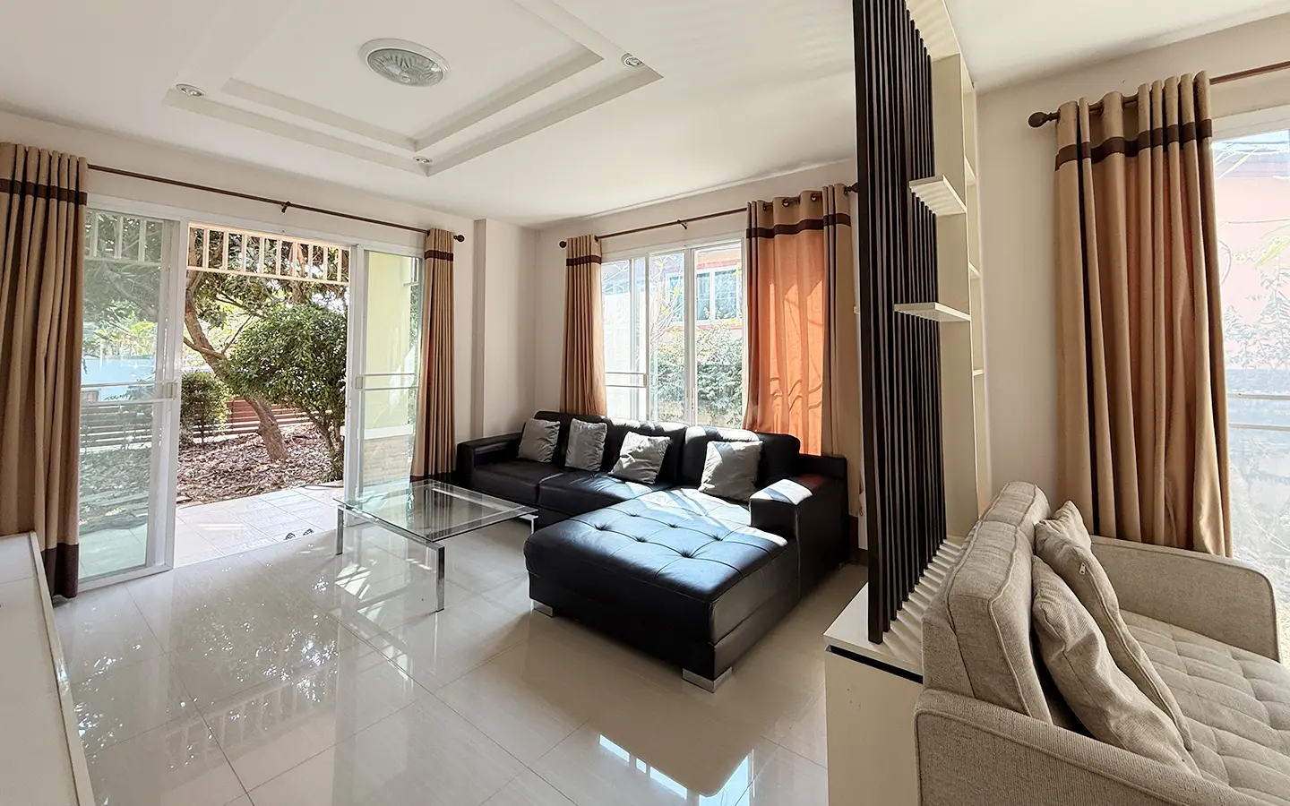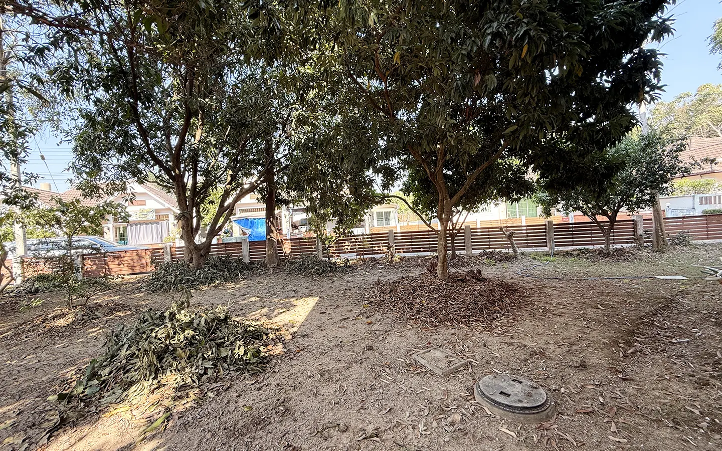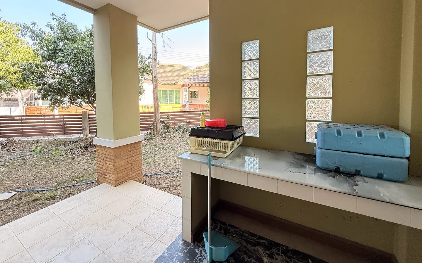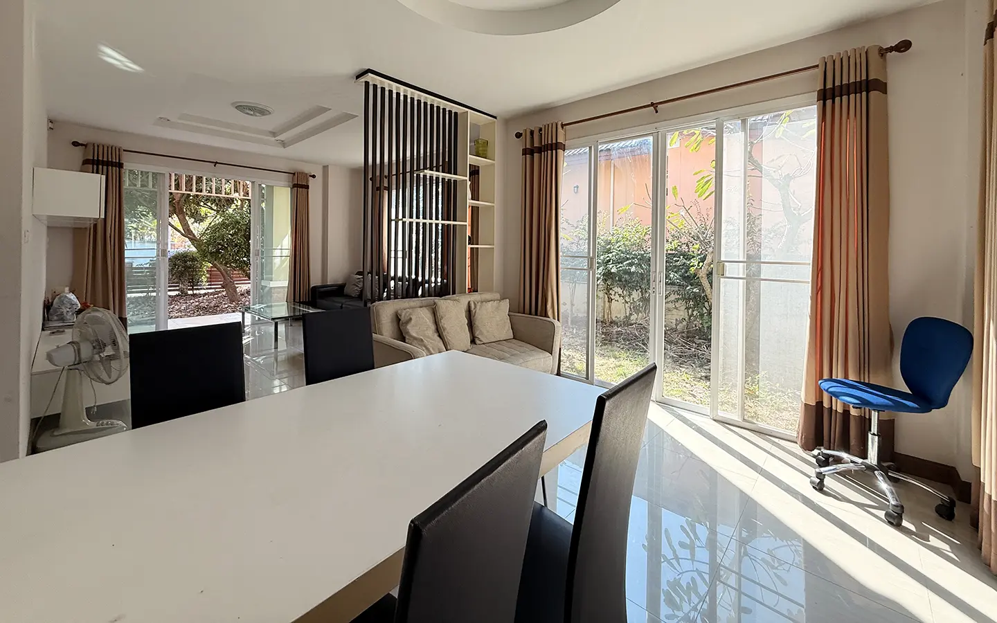 Outside, the garden includes longan trees, enhancing the peaceful atmosphere. As a corner plot with a triangular land shape, the property offers added privacy and character. The common area fee is 16,224 THB per year, and the village provides 24-hour security for your peace of mind.
