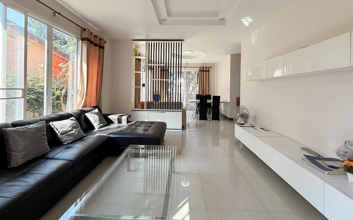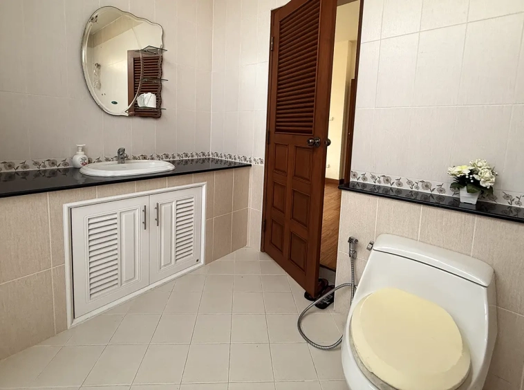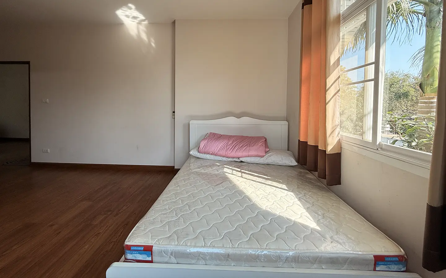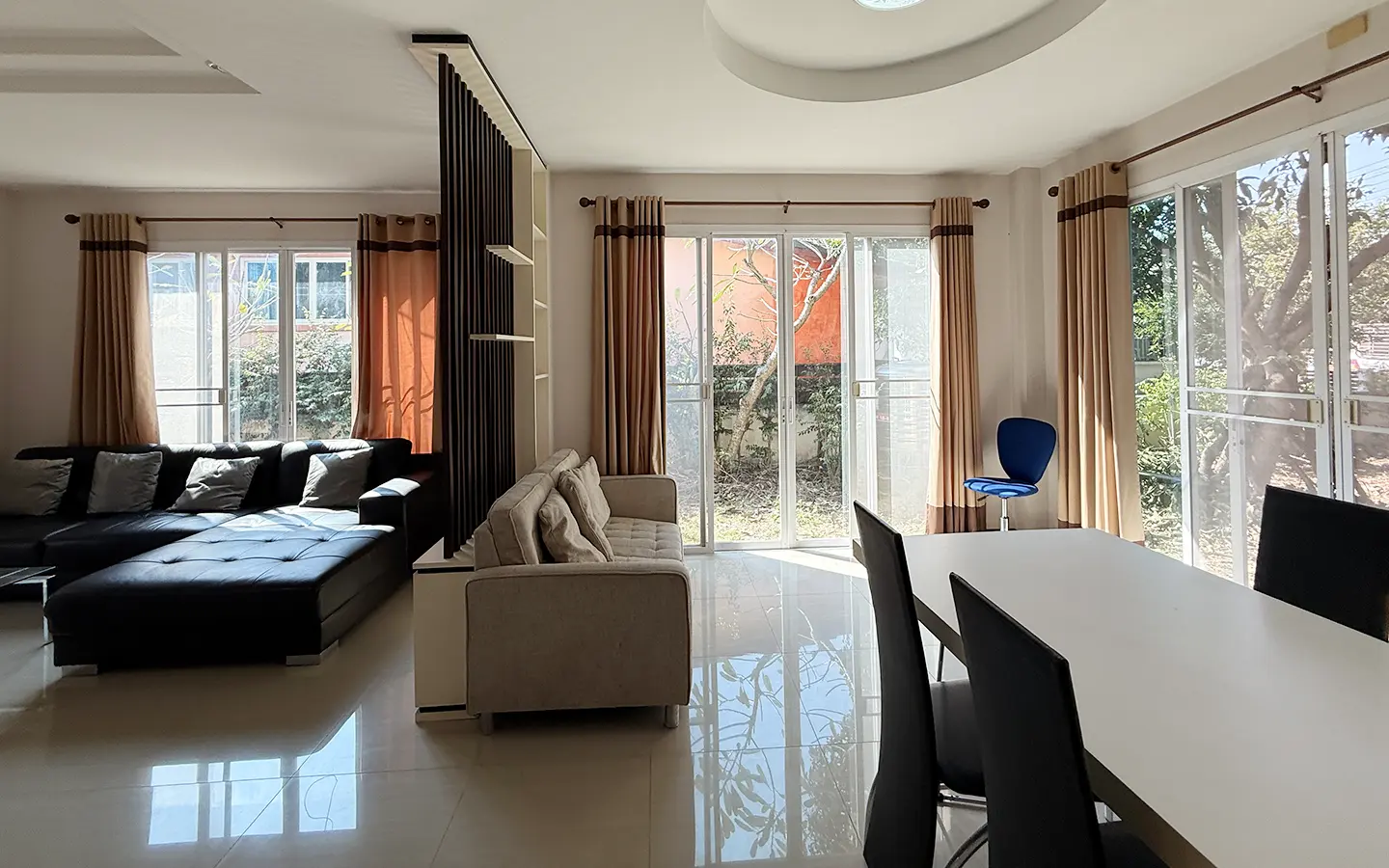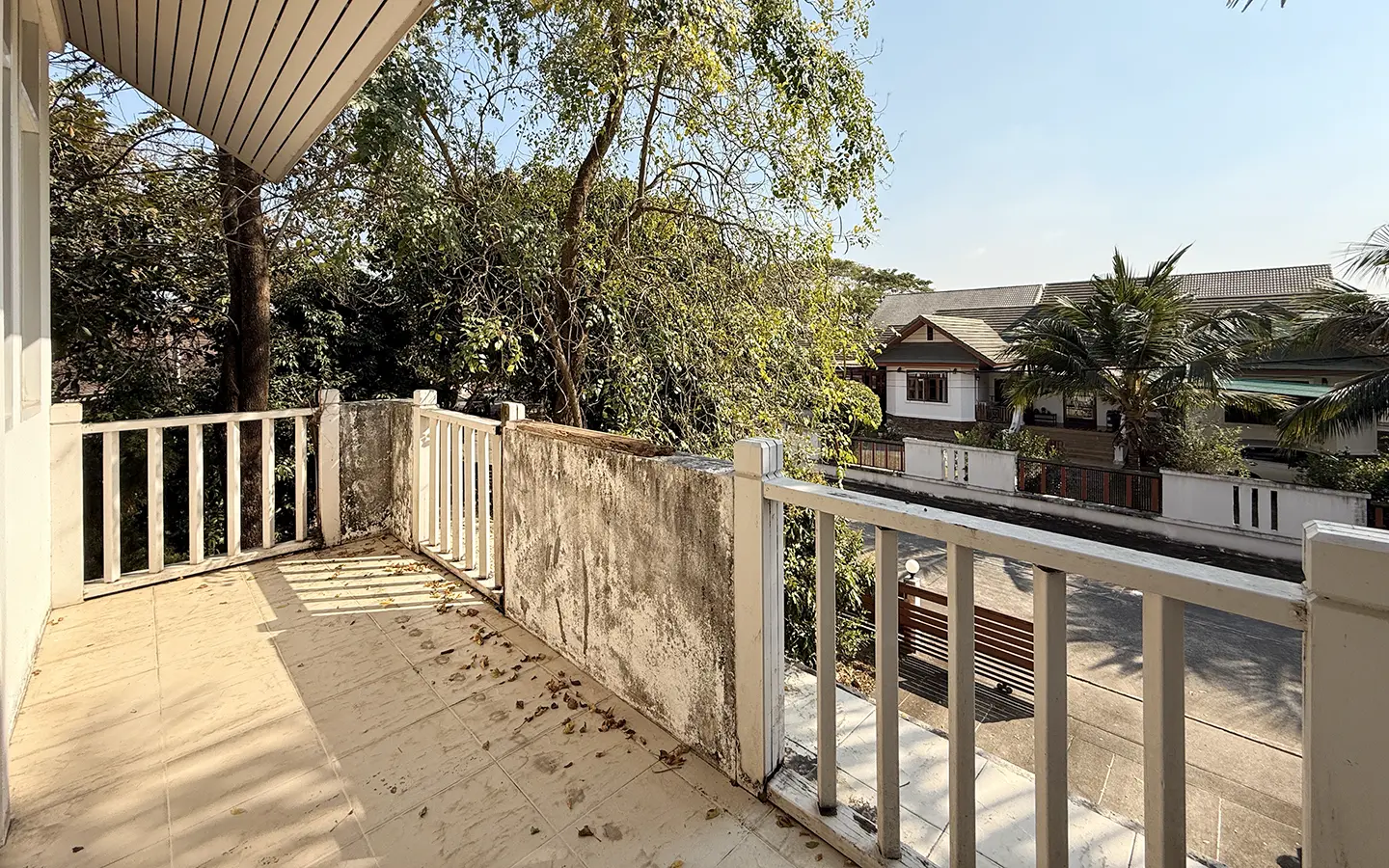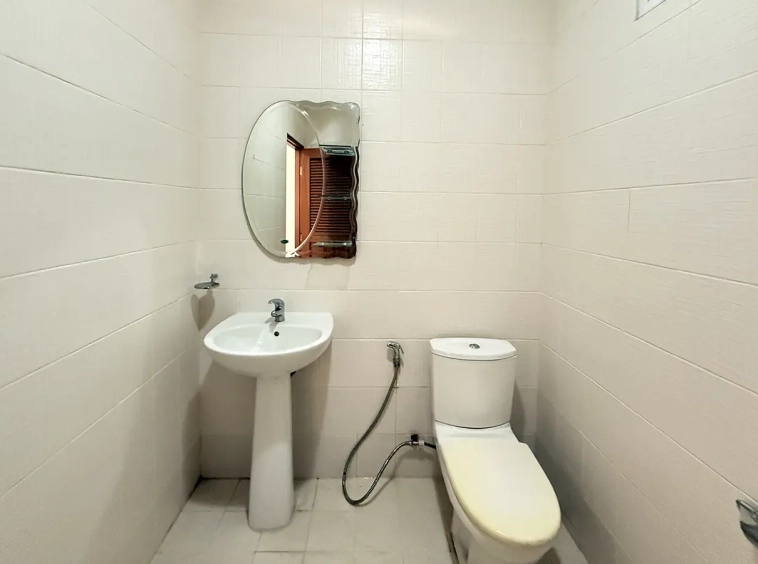 Outside, the garden includes longan trees, enhancing the peaceful atmosphere. As a corner plot with a triangular land shape, the property offers added privacy and character. The common area fee is 16,224 THB per year, and the village provides 24-hour security for your peace of mind.