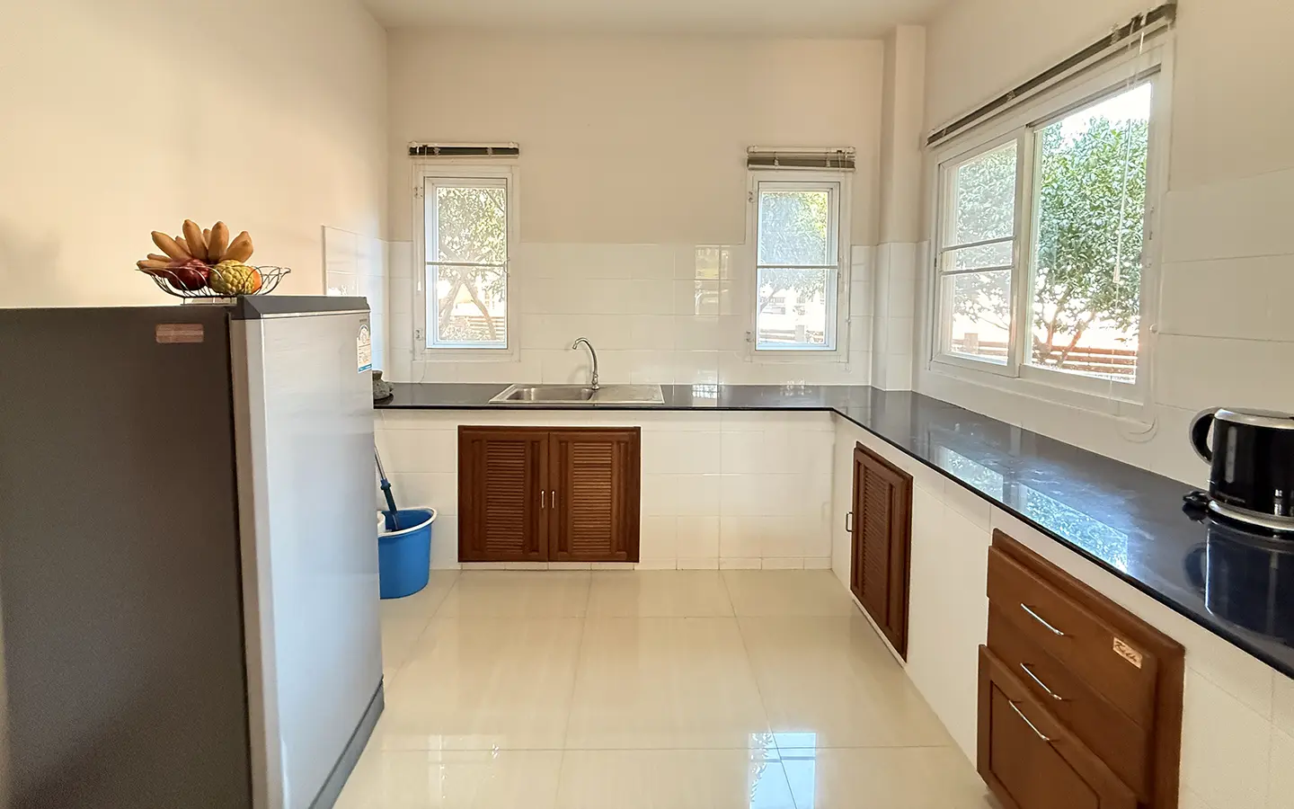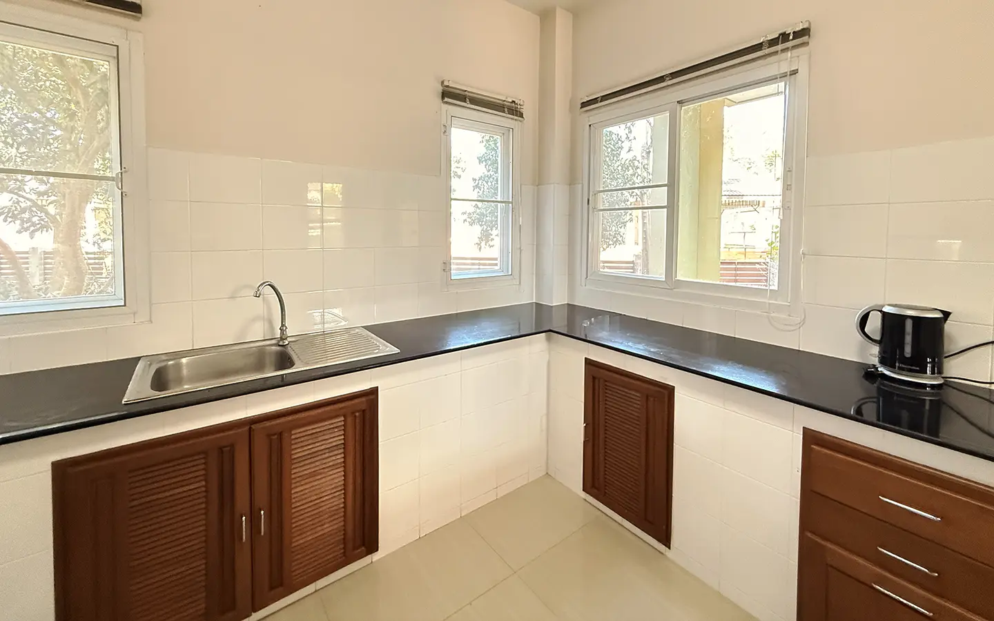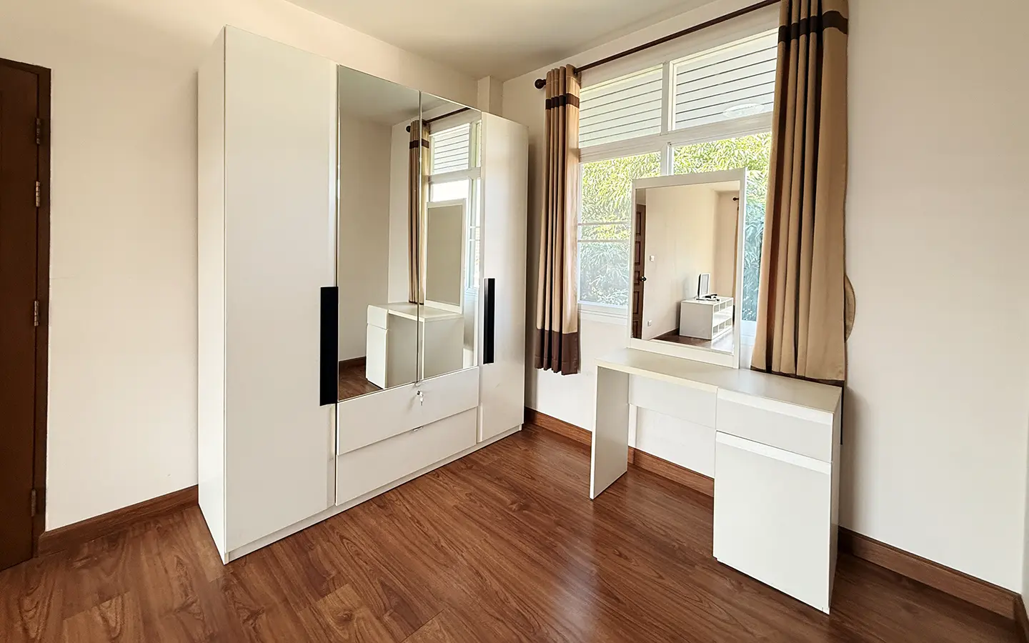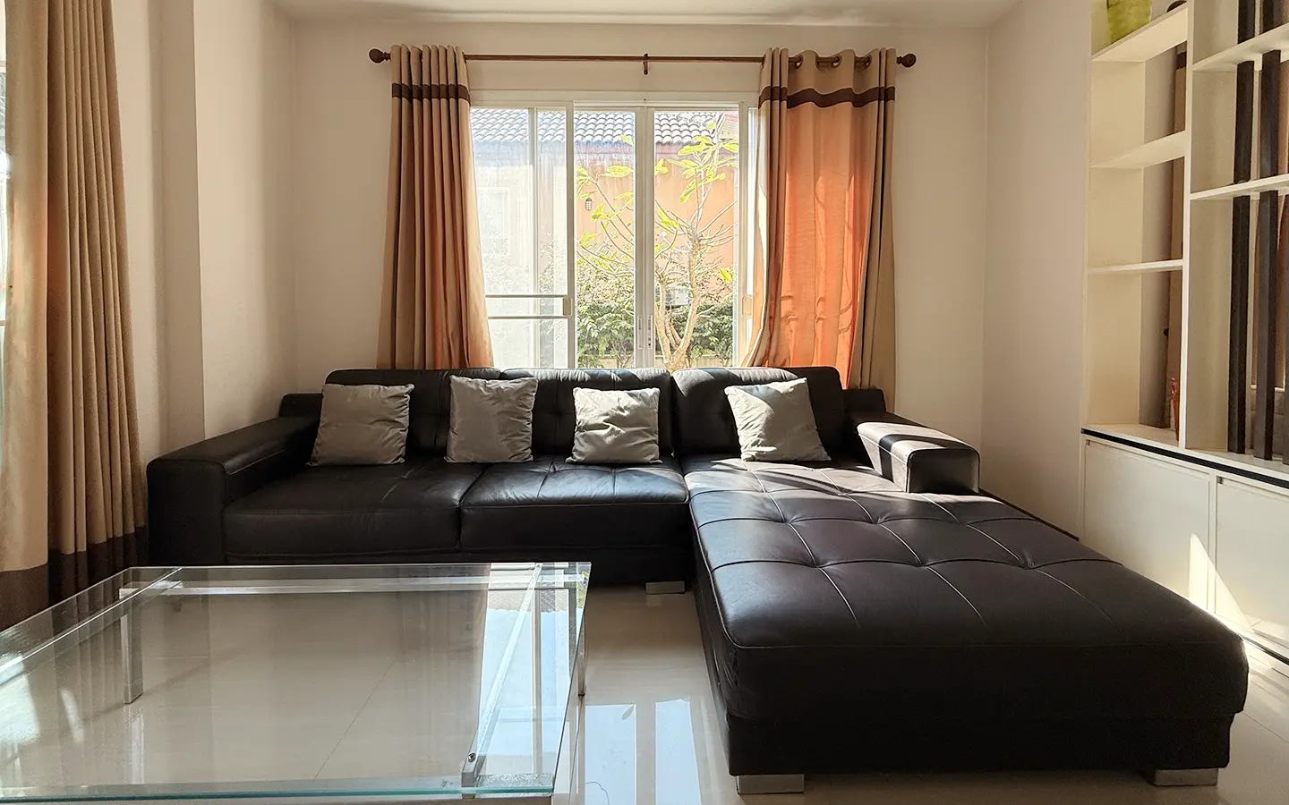Outside, the garden includes longan trees, enhancing the peaceful atmosphere. As a corner plot with a triangular land shape, the property offers added privacy and character. The common area fee is 16,224 THB per year, and the village provides 24-hour security for your peace of mind.