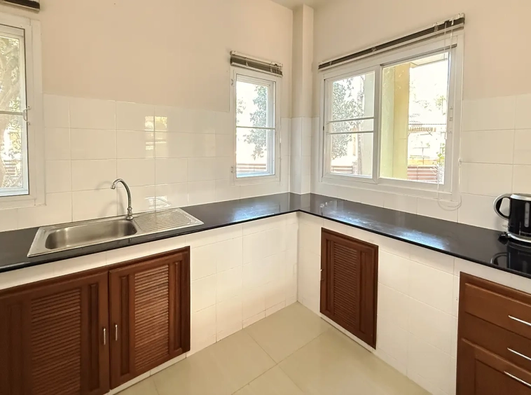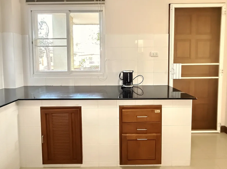 On the ground floor, the layout is thoughtfully designed with a welcoming living area, a dining space, and a storage room under the stairs. The spacious kitchen allows for additional built-in cabinetry to suit your lifestyle. A walkway leads to the back of the house, where you can create a separate Thai kitchen and laundry area for practical daily use.