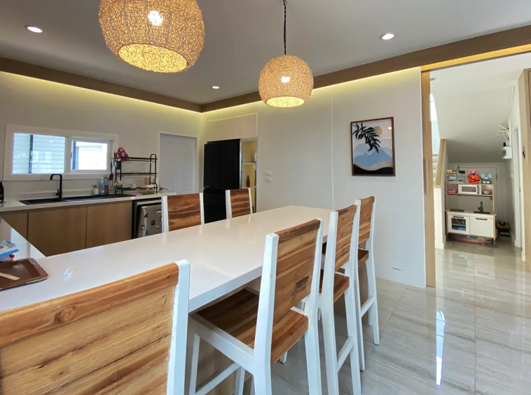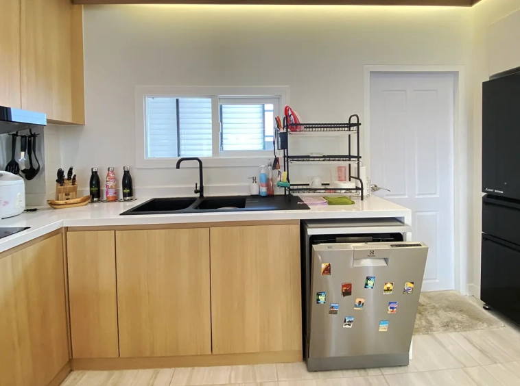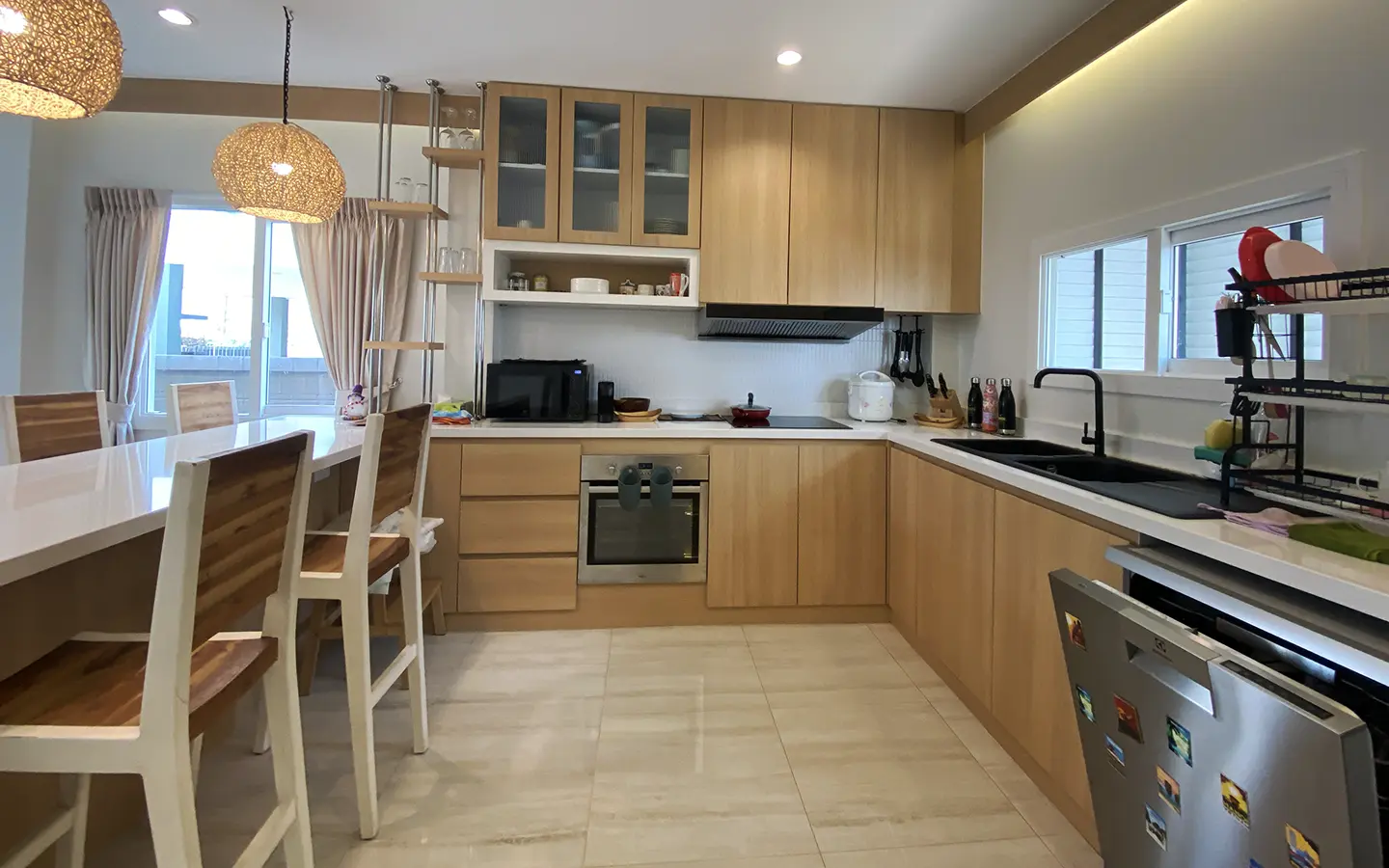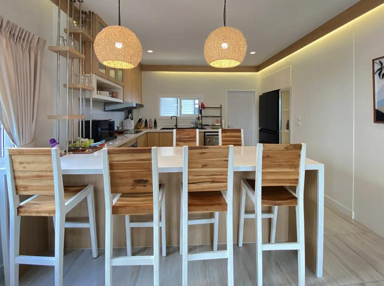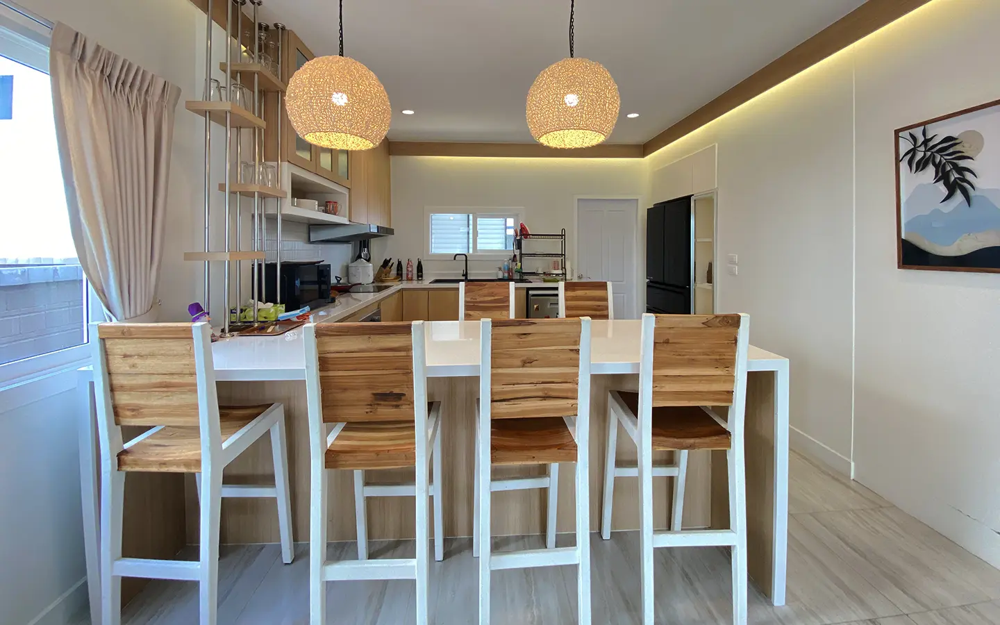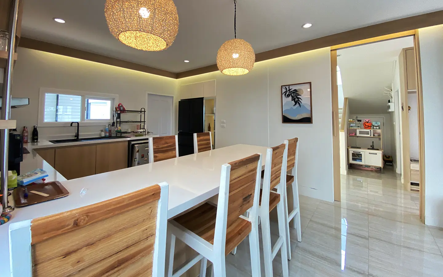 The house has an open-plan living area with beautiful flooring and ceiling skirts, all in natural tones. There is a sofa and TV area then there is a fully fitted Western kitchen with a built-in oven dishwasher and counter bar for dining. There is access from here to the washing area outside where the washing machine is located. A guest bathroom comes with a spacious walk-in shower. A room with a sliding door is located here on the ground floor which can be utilised as a guest bedroom as a Murphy bed is already put in as well as built-in wall shelves and a working desk. There is also a storage room underneath the stairs.