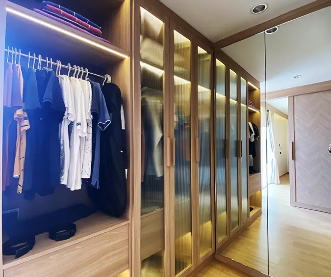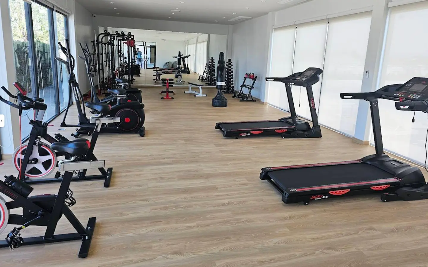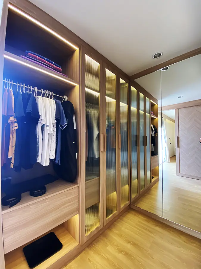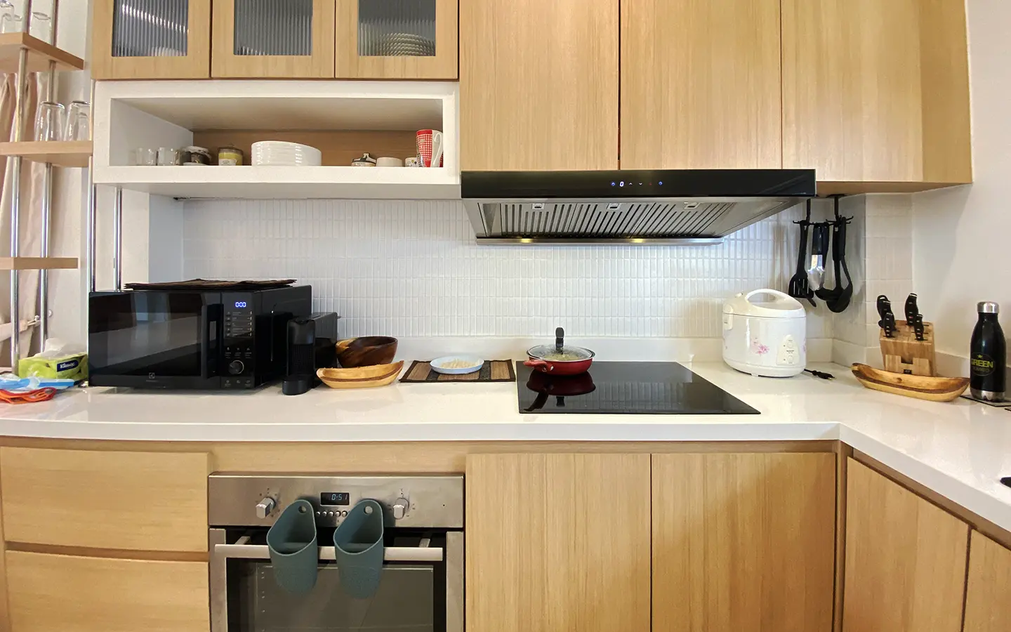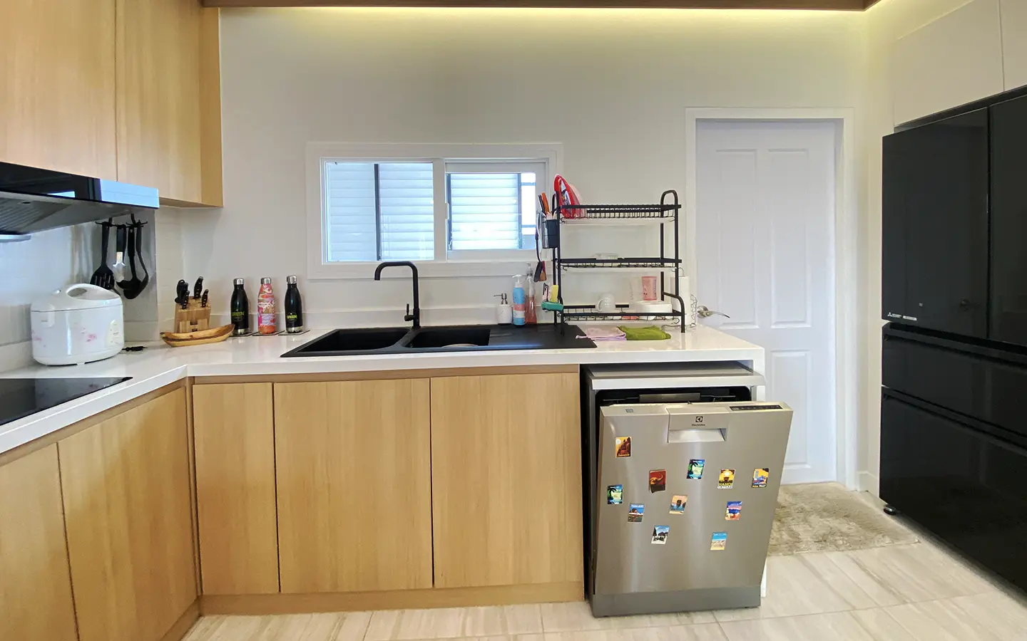 The house has an open-plan living area with beautiful flooring and ceiling skirts, all in natural tones. There is a sofa and TV area then there is a fully fitted Western kitchen with a built-in oven dishwasher and counter bar for dining. There is access from here to the washing area outside where the washing machine is located. A guest bathroom comes with a spacious walk-in shower. A room with a sliding door is located here on the ground floor which can be utilised as a guest bedroom as a Murphy bed is already put in as well as built-in wall shelves and a working desk. There is also a storage room underneath the stairs.