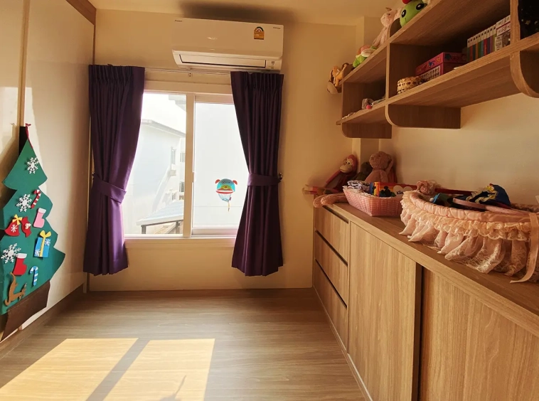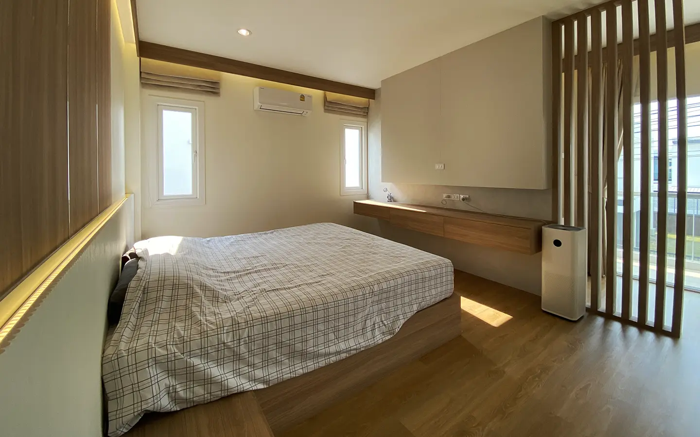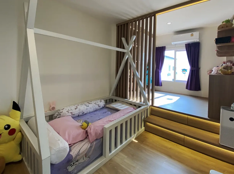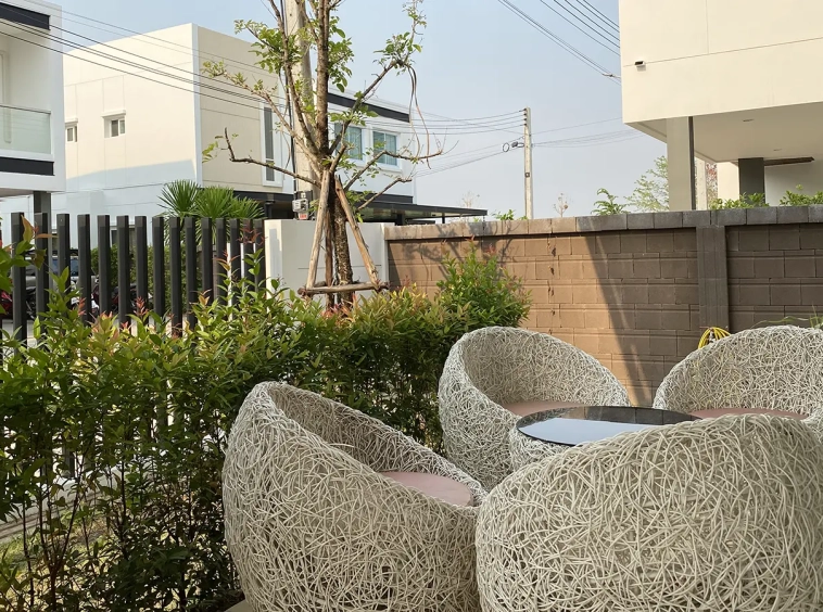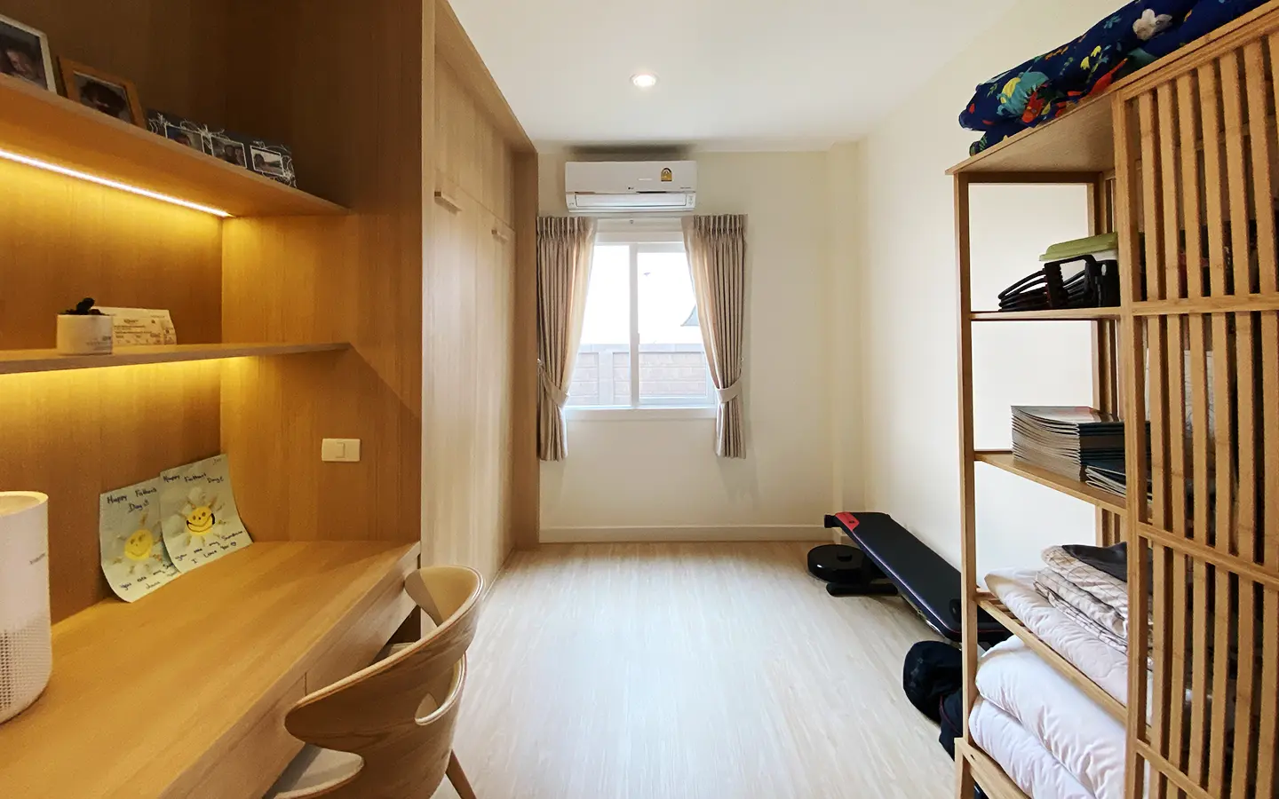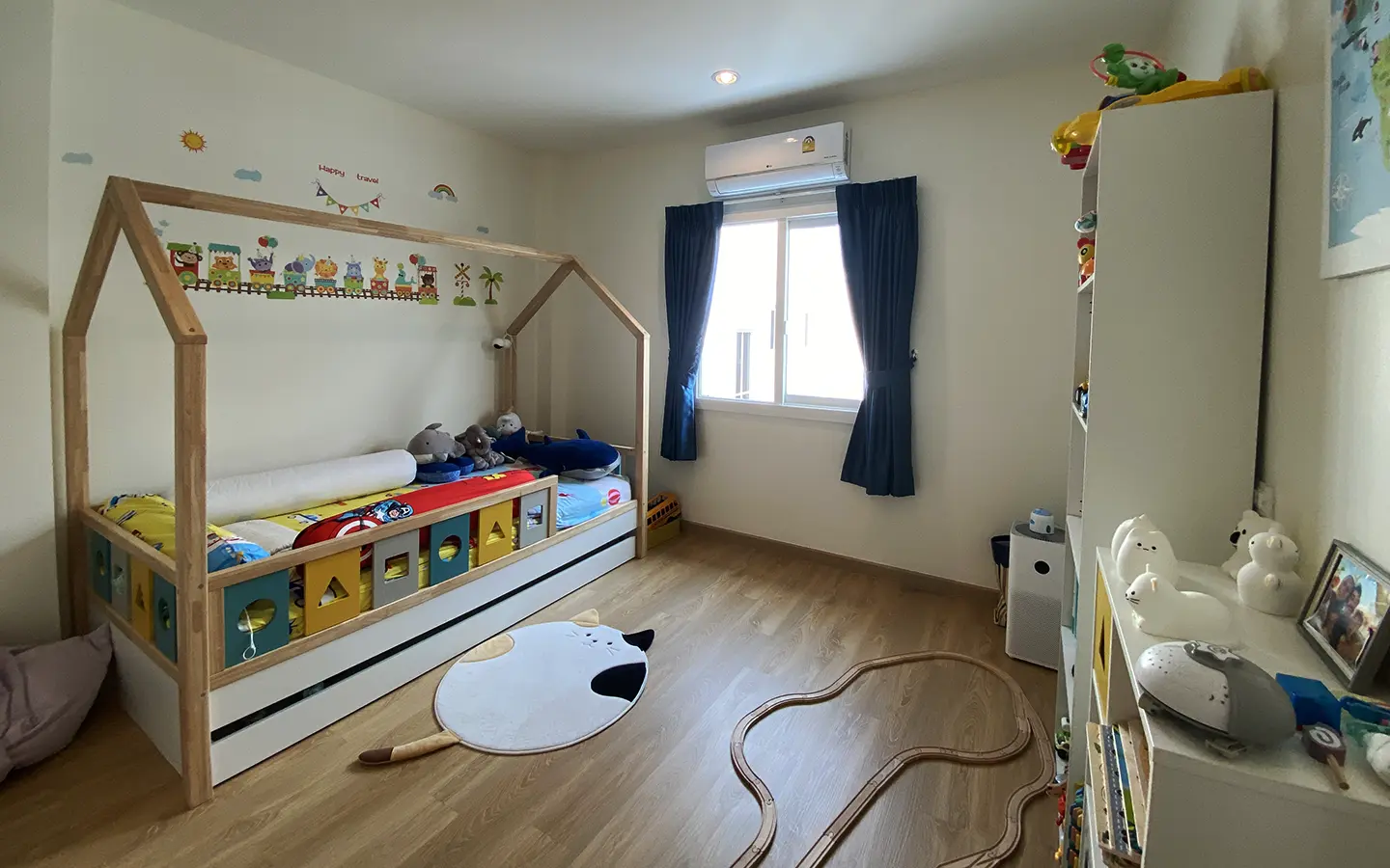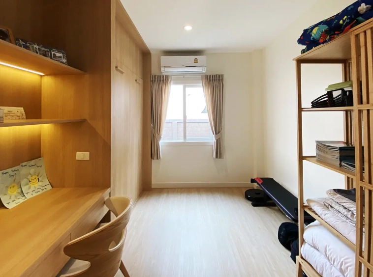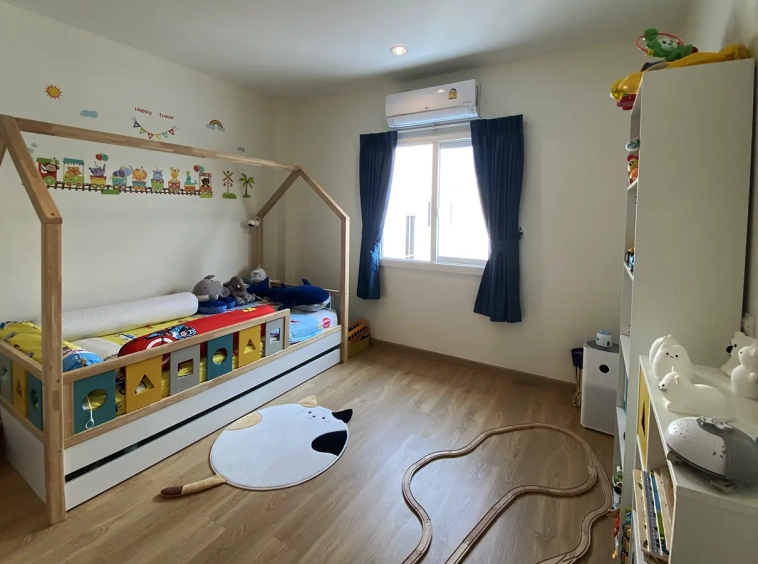 On the second floor, there are 3 bedrooms. The master bedroom comes complete with a walk-through dressing room, a study corner and an ensuite with a shower. Two further bedrooms share a family bathroom. All the rooms are meticulously decorated with natural tone color offering a clean, fresh and light vibe and fitted with high-quality fittings. Outside there is a playground corner and a sitting area in a garden that is easy to maintain. The estate facilities include a resort-style swimming pool with a clubhouse, a gym, a playground and 24hrs security.