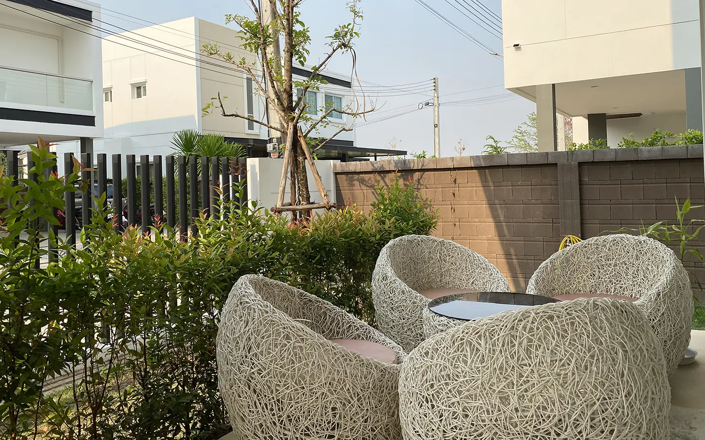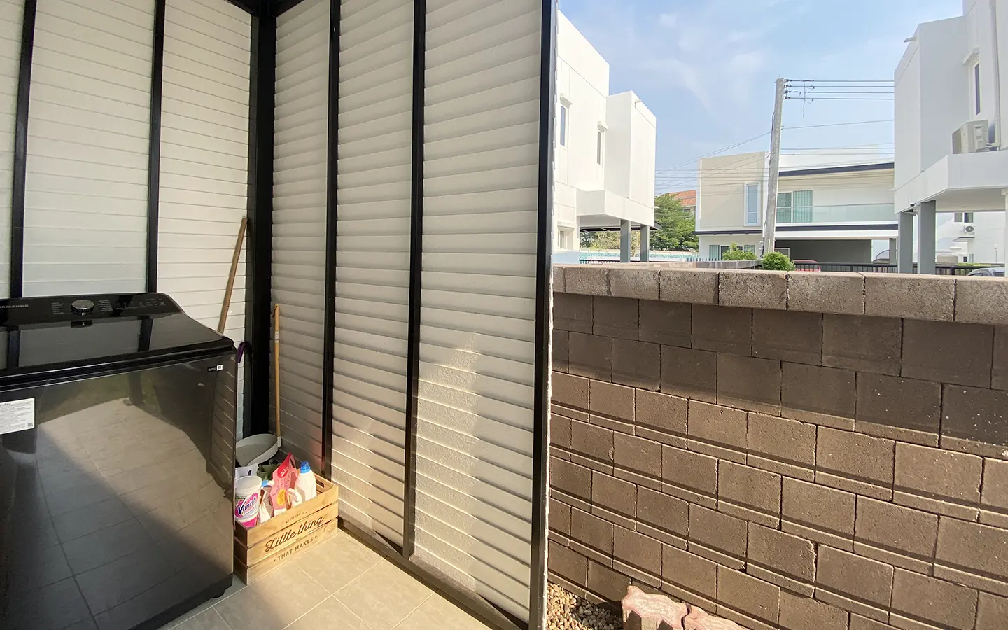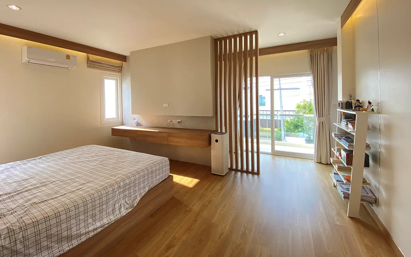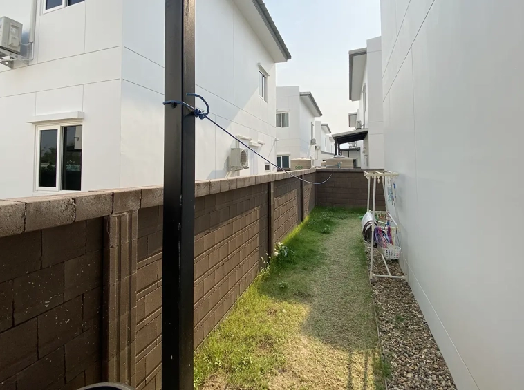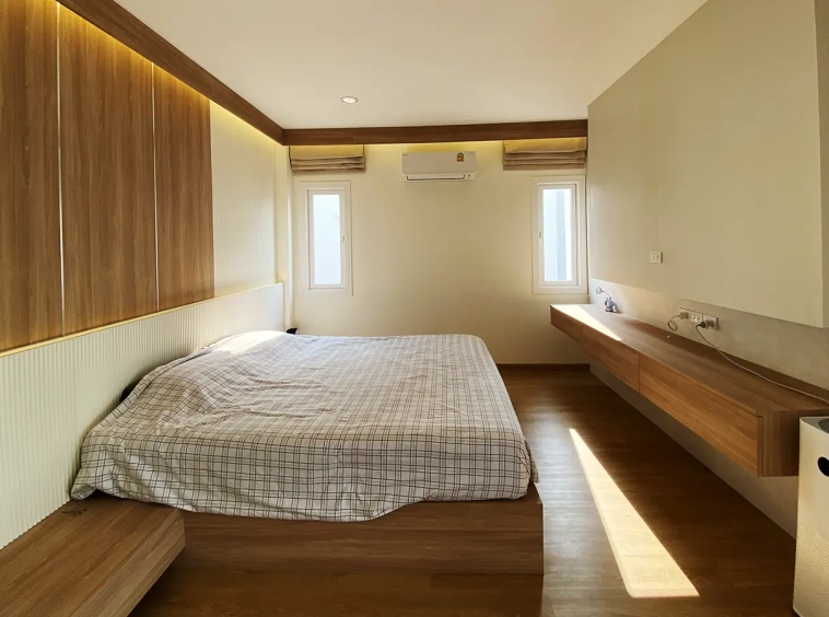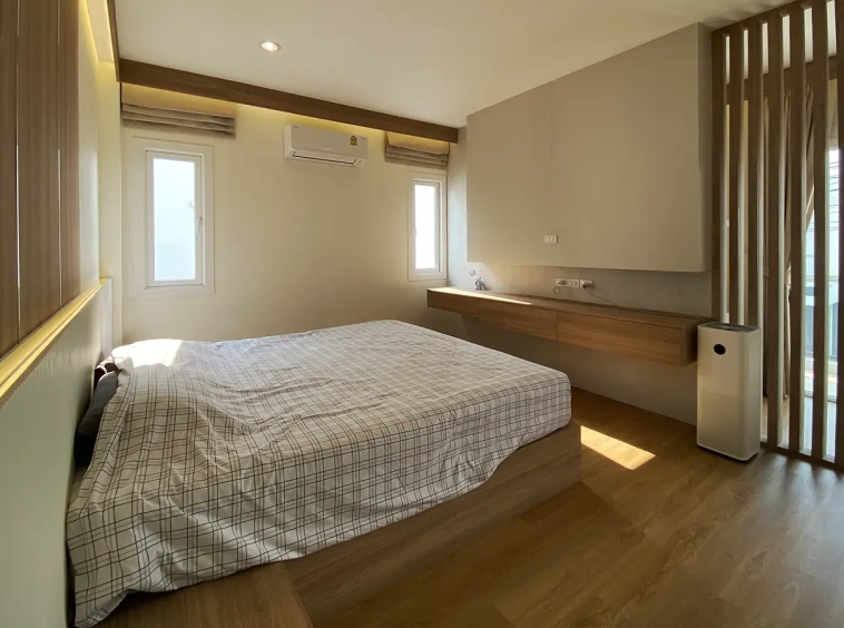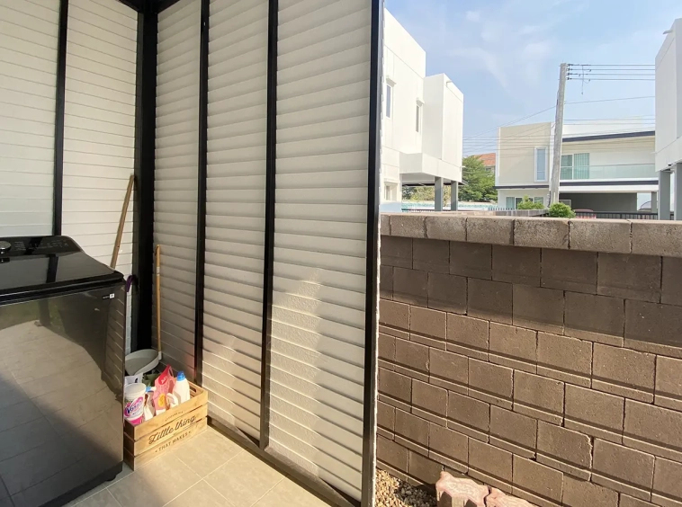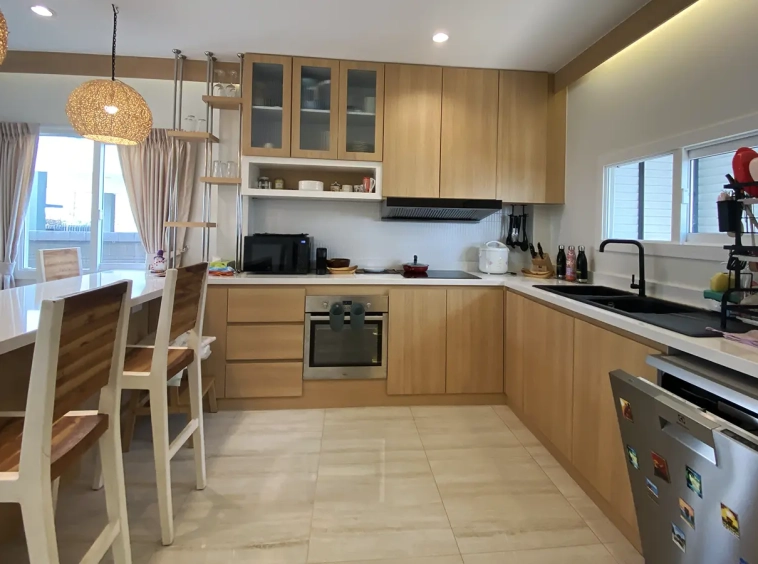 On the second floor, there are 3 bedrooms. The master bedroom comes complete with a walk-through dressing room, a study corner and an ensuite with a shower. Two further bedrooms share a family bathroom. All the rooms are meticulously decorated with natural tone color offering a clean, fresh and light vibe and fitted with high-quality fittings. Outside there is a playground corner and a sitting area in a garden that is easy to maintain. The estate facilities include a resort-style swimming pool with a clubhouse, a gym, a playground and 24hrs security.