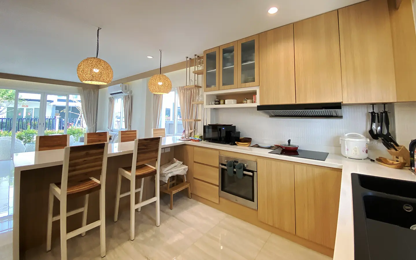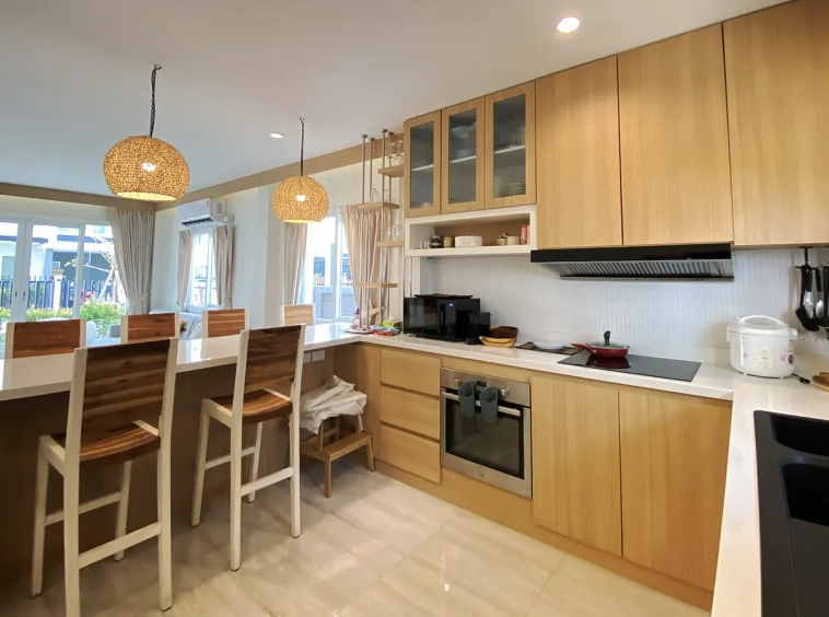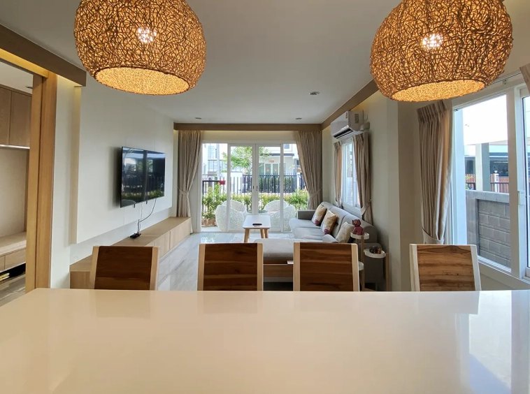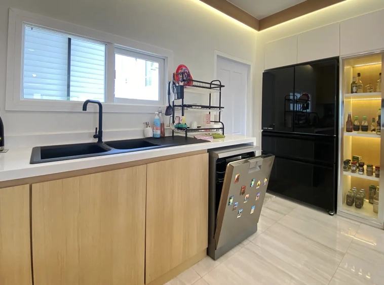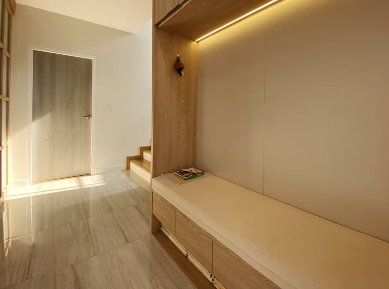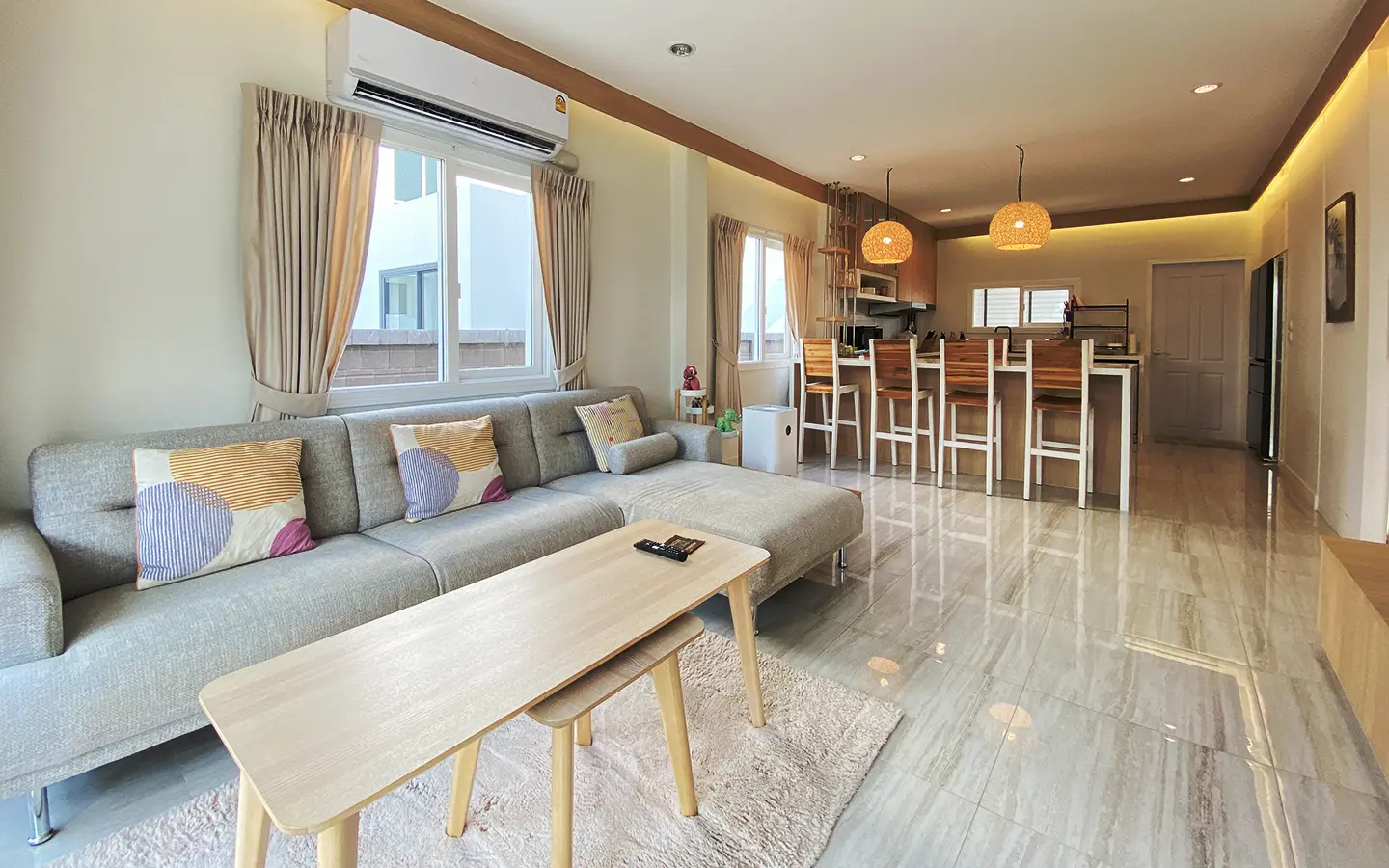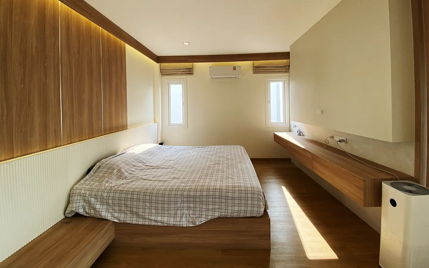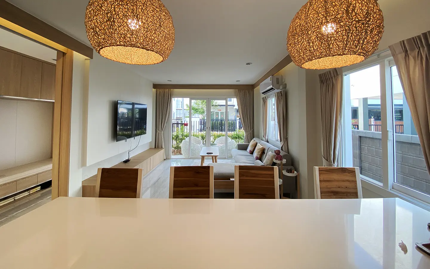 On the second floor, there are 3 bedrooms. The master bedroom comes complete with a walk-through dressing room, a study corner and an ensuite with a shower. Two further bedrooms share a family bathroom. All the rooms are meticulously decorated with natural tone color offering a clean, fresh and light vibe and fitted with high-quality fittings. Outside there is a playground corner and a sitting area in a garden that is easy to maintain. The estate facilities include a resort-style swimming pool with a clubhouse, a gym, a playground and 24hrs security.