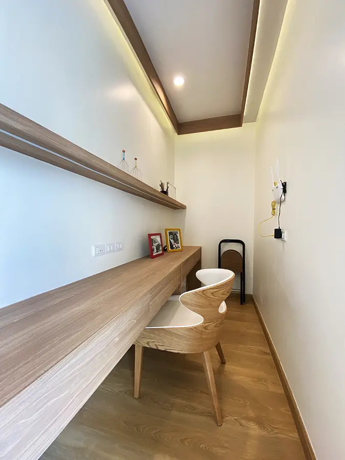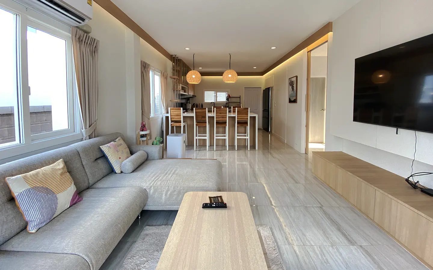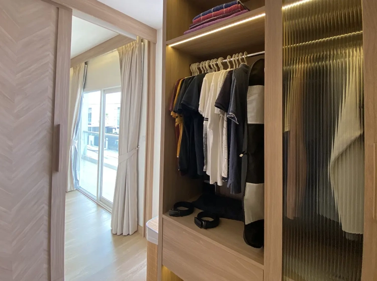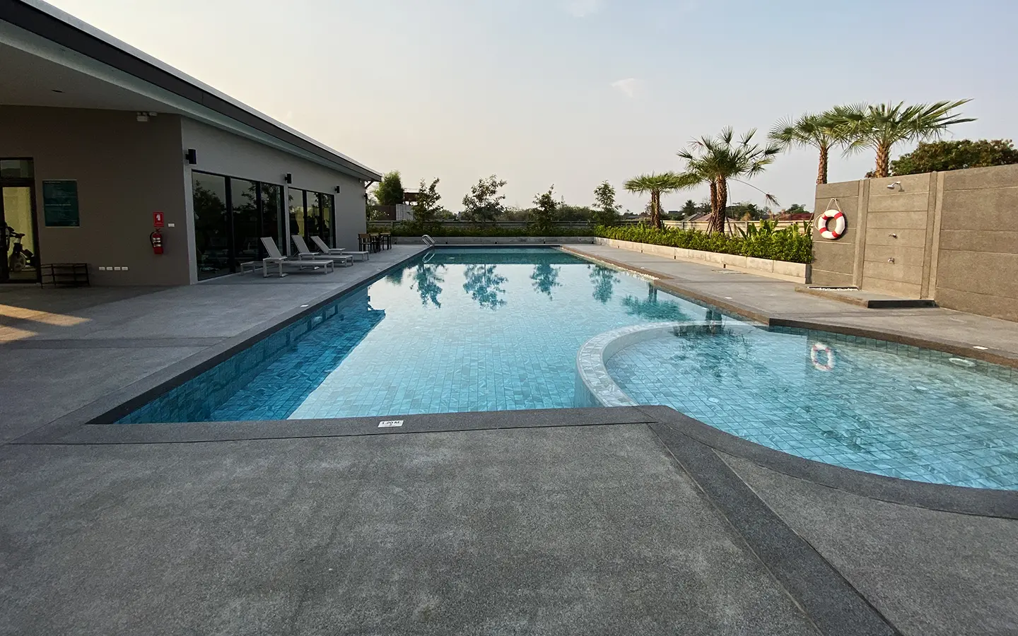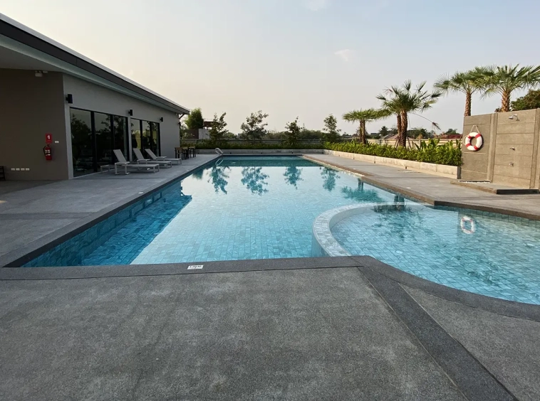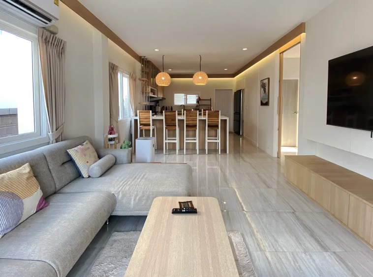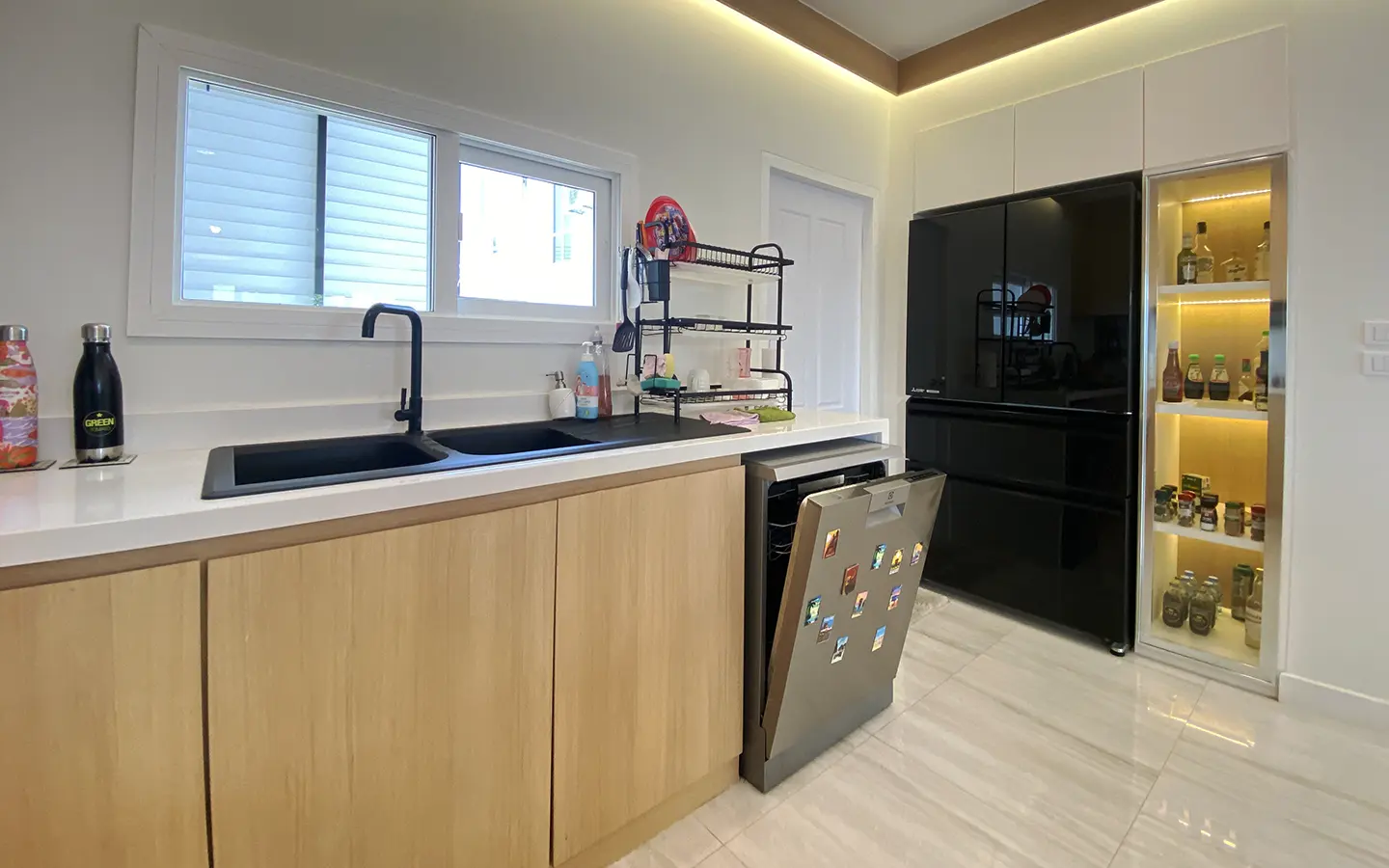 On the second floor, there are 3 bedrooms. The master bedroom comes complete with a walk-through dressing room, a study corner and an ensuite with a shower. Two further bedrooms share a family bathroom. All the rooms are meticulously decorated with natural tone color offering a clean, fresh and light vibe and fitted with high-quality fittings. Outside there is a playground corner and a sitting area in a garden that is easy to maintain. The estate facilities include a resort-style swimming pool with a clubhouse, a gym, a playground and 24hrs security.