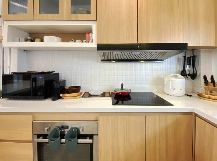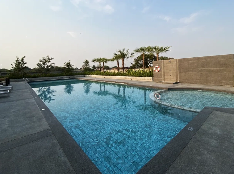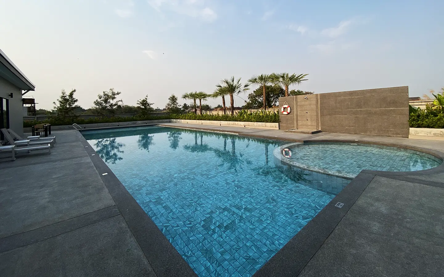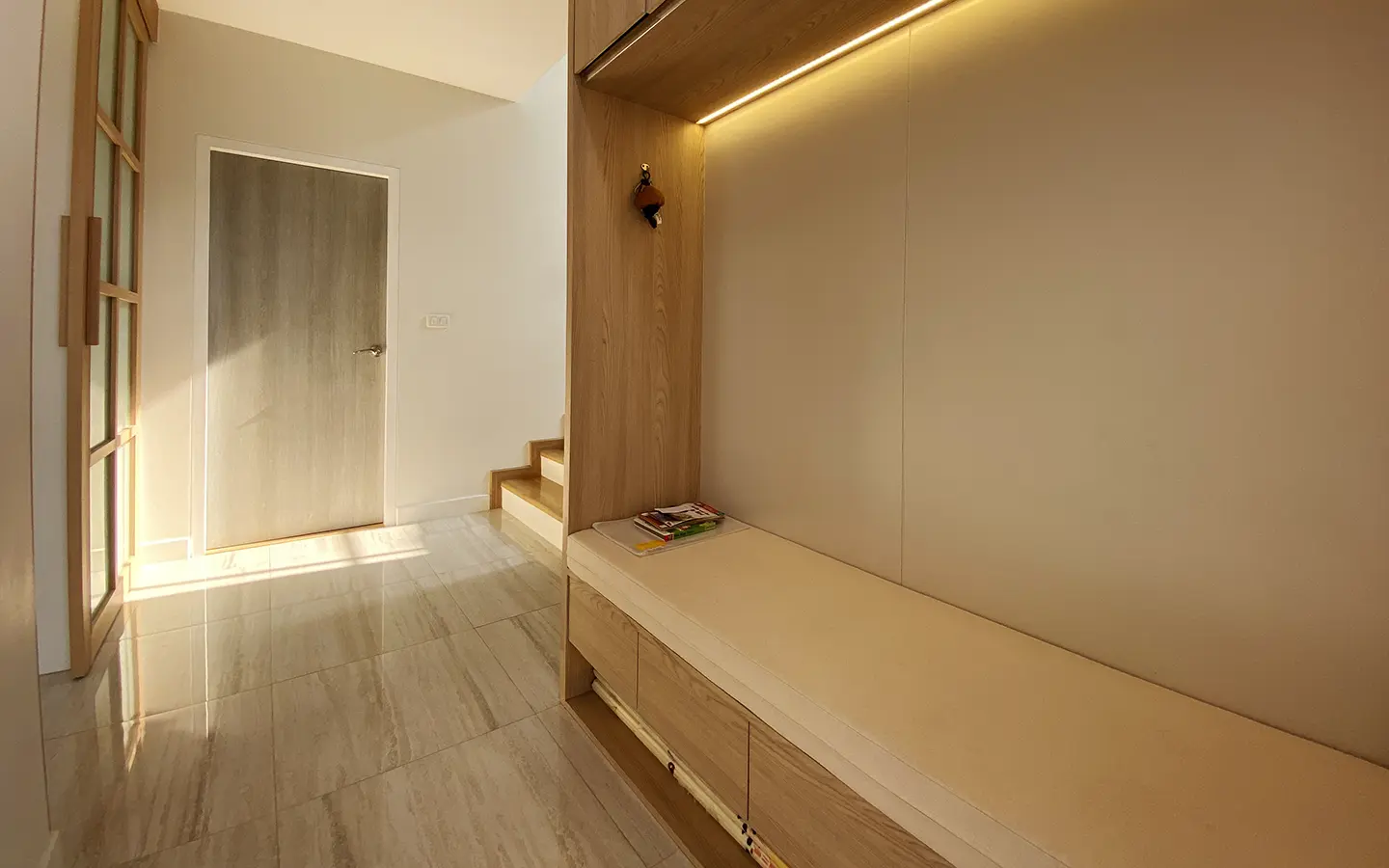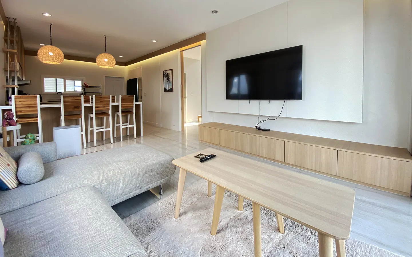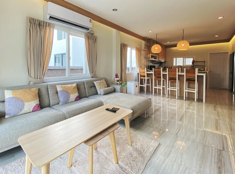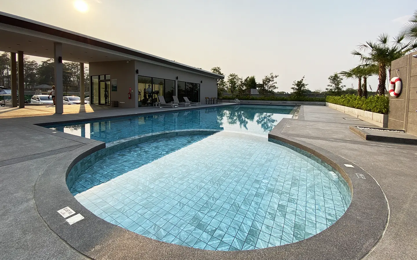 On the second floor, there are 3 bedrooms. The master bedroom comes complete with a walk-through dressing room, a study corner and an ensuite with a shower. Two further bedrooms share a family bathroom. All the rooms are meticulously decorated with natural tone color offering a clean, fresh and light vibe and fitted with high-quality fittings. Outside there is a playground corner and a sitting area in a garden that is easy to maintain. The estate facilities include a resort-style swimming pool with a clubhouse, a gym, a playground and 24hrs security.
