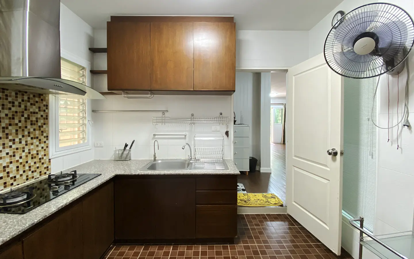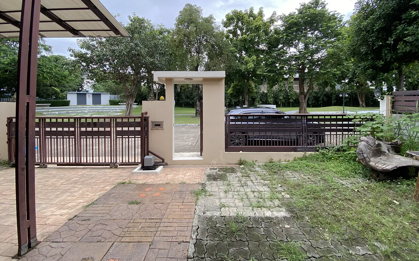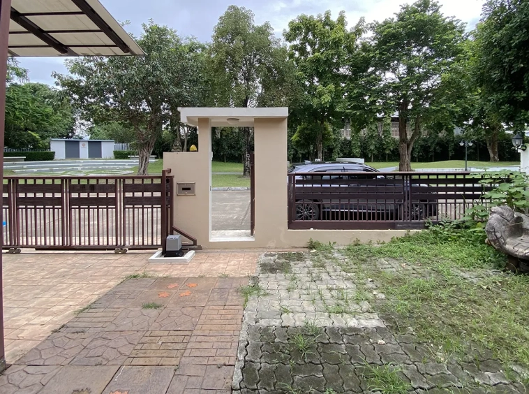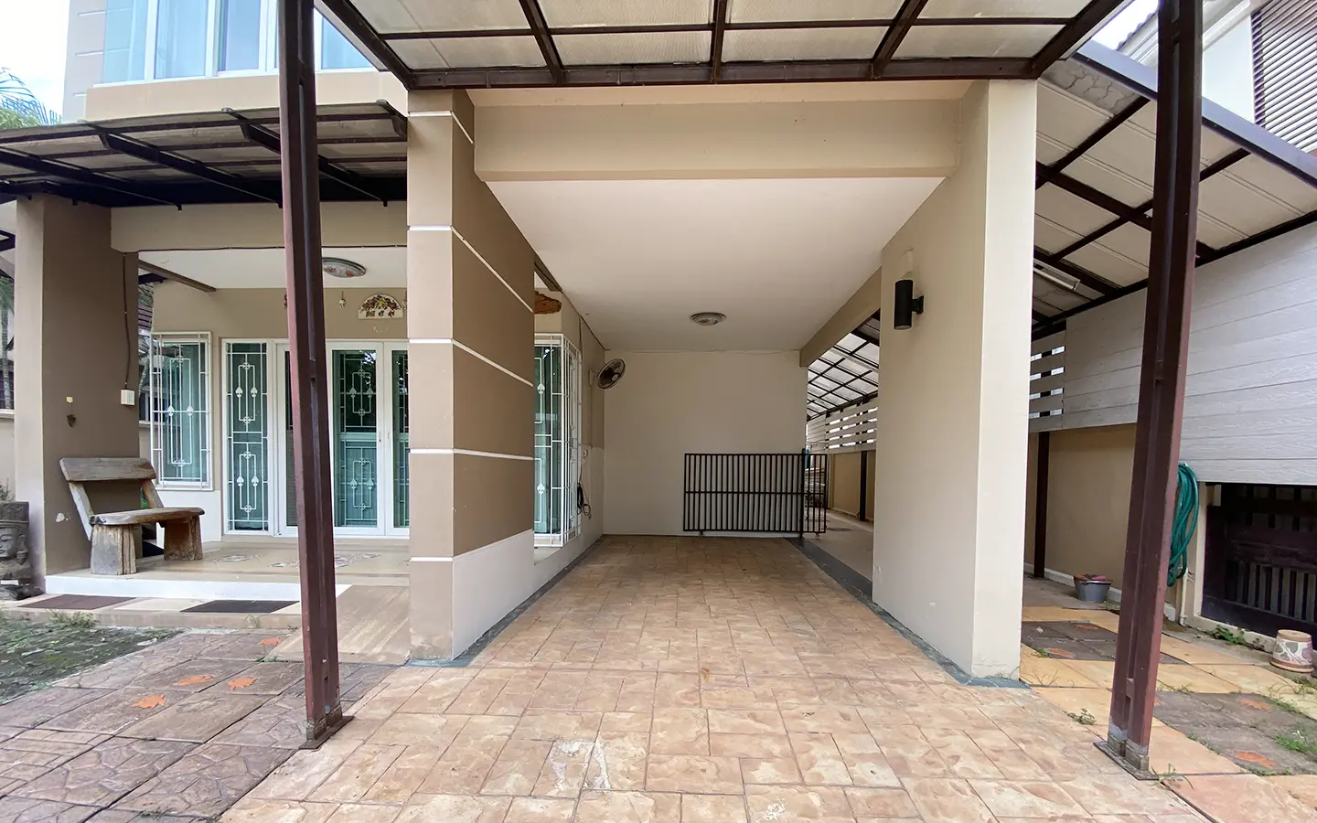 The house has a fantastic location with the small park right opposite. It comes with an automated gate, 4 bedrooms and 3 bathrooms and parking space for 2 cars. There is a sitting area in the front yard with a lawn, the side of the house has the covered extension for washing and storing area. Inside, the open plan living room is spacious and has a tall ceiling. There is an additional room that can be accessed from outside and can be used either as an office, a play room or an extra bedroom. There is a bedroom on this floor, a guest bathroom, a Western style kitchen with access to the rear and side.
