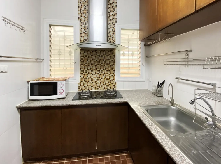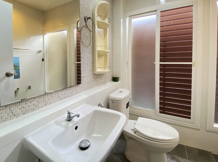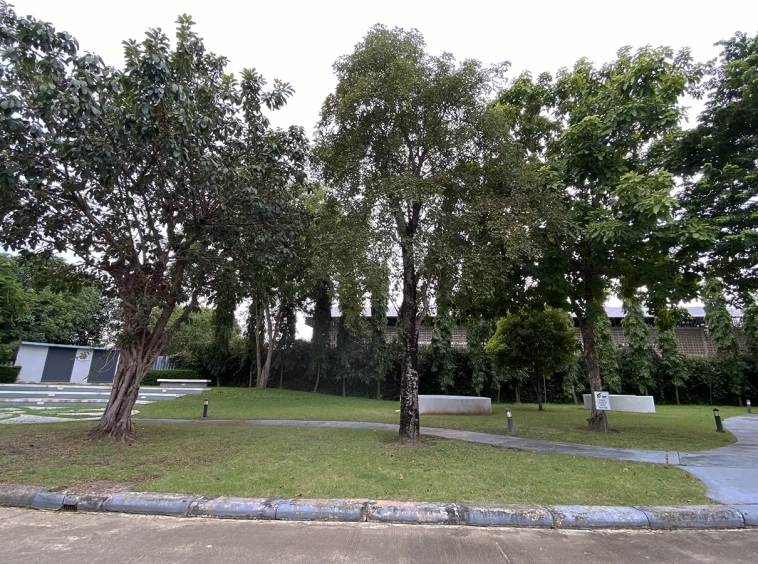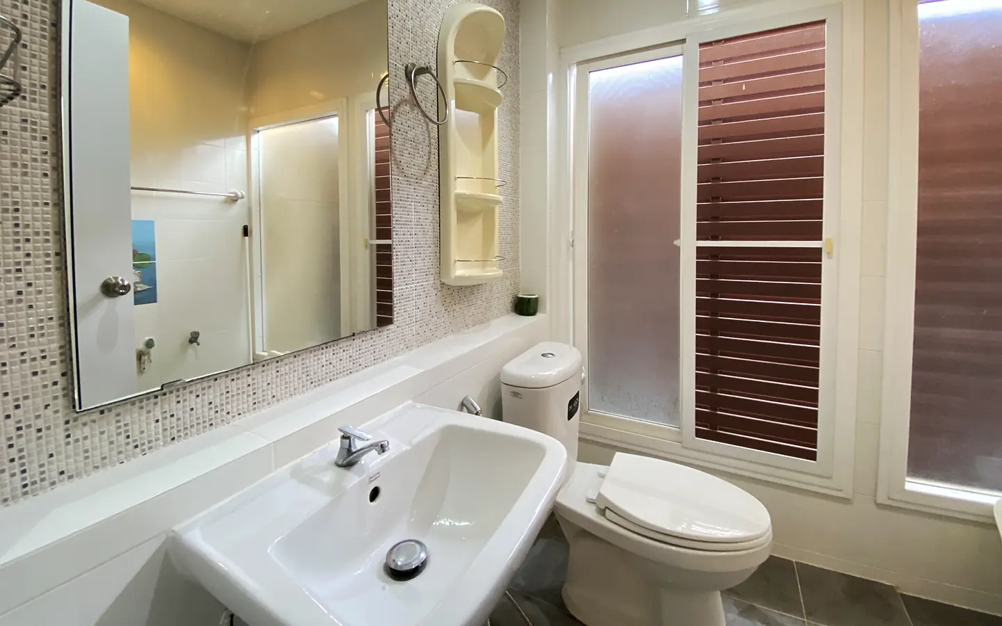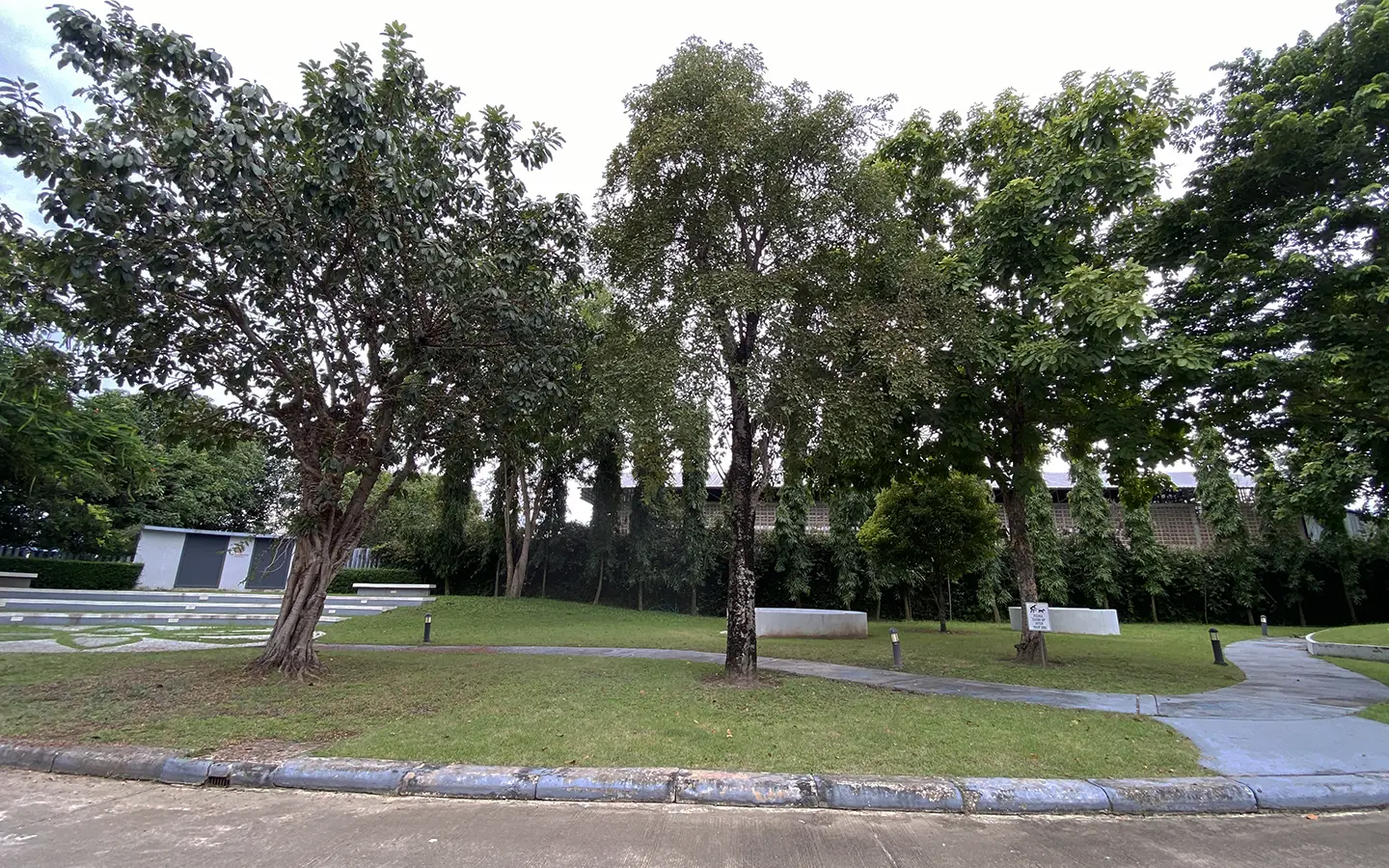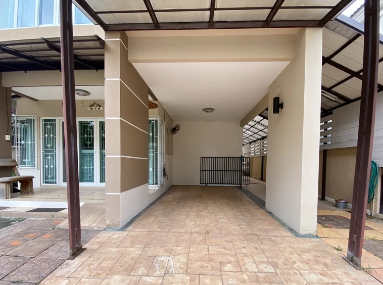 The house has a fantastic location with the small park right opposite. It comes with an automated gate, 4 bedrooms and 3 bathrooms and parking space for 2 cars. There is a sitting area in the front yard with a lawn, the side of the house has the covered extension for washing and storing area. Inside, the open plan living room is spacious and has a tall ceiling. There is an additional room that can be accessed from outside and can be used either as an office, a play room or an extra bedroom. There is a bedroom on this floor, a guest bathroom, a Western style kitchen with access to the rear and side.