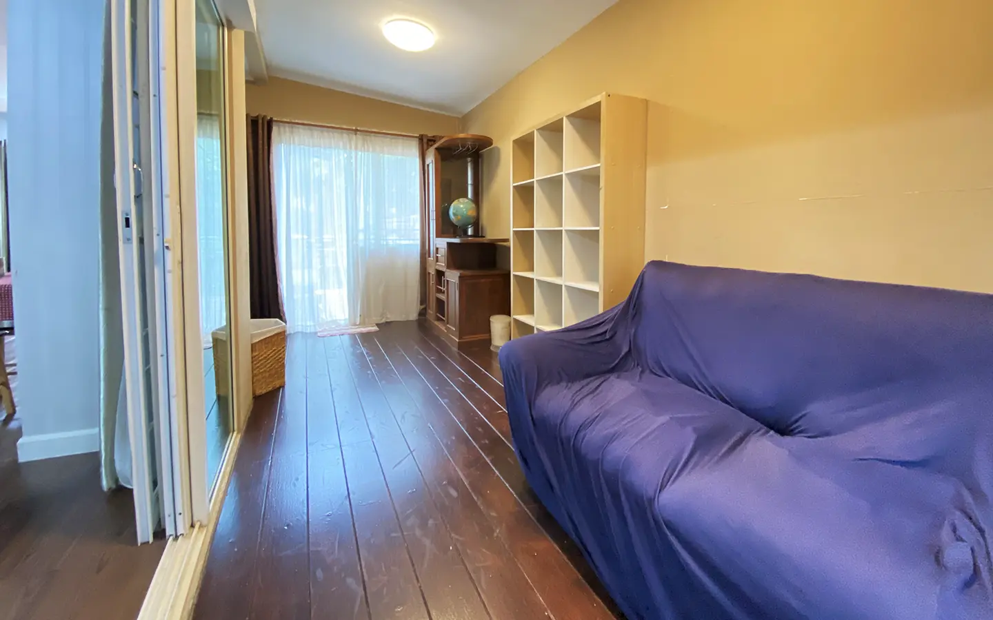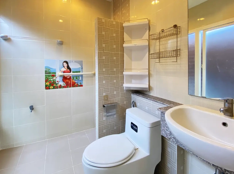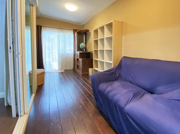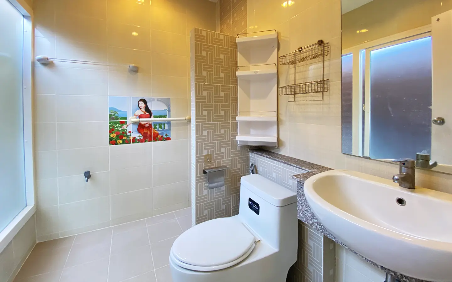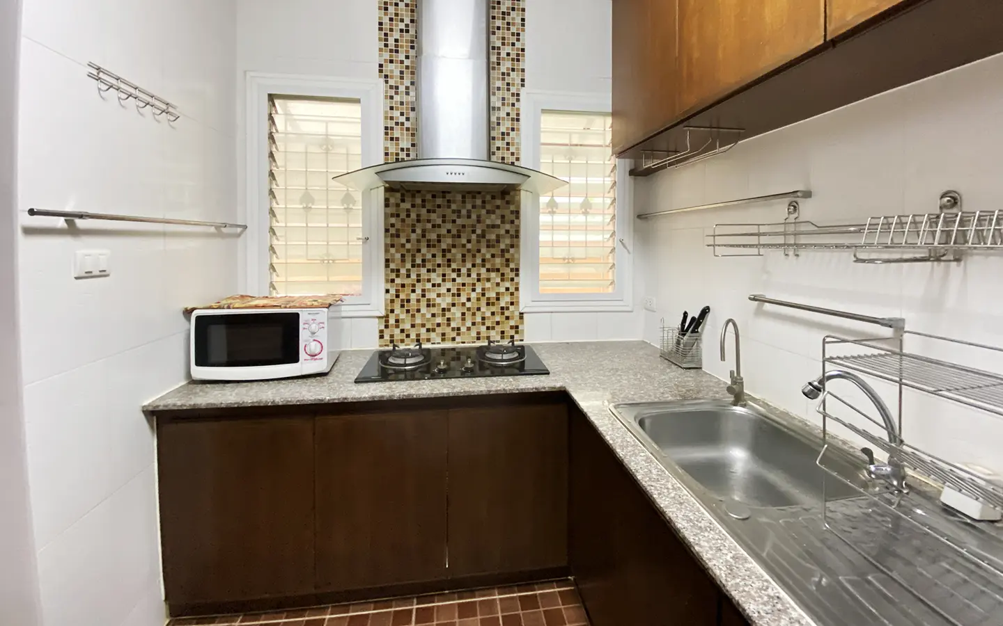 The house has a fantastic location with the small park right opposite. It comes with an automated gate, 4 bedrooms and 3 bathrooms and parking space for 2 cars. There is a sitting area in the front yard with a lawn, the side of the house has the covered extension for washing and storing area. Inside, the open plan living room is spacious and has a tall ceiling. There is an additional room that can be accessed from outside and can be used either as an office, a play room or an extra bedroom. There is a bedroom on this floor, a guest bathroom, a Western style kitchen with access to the rear and side.
