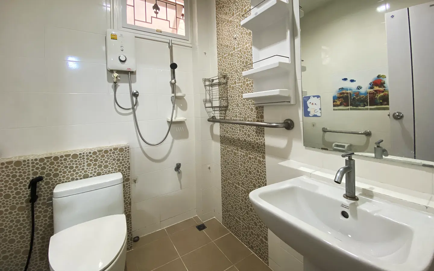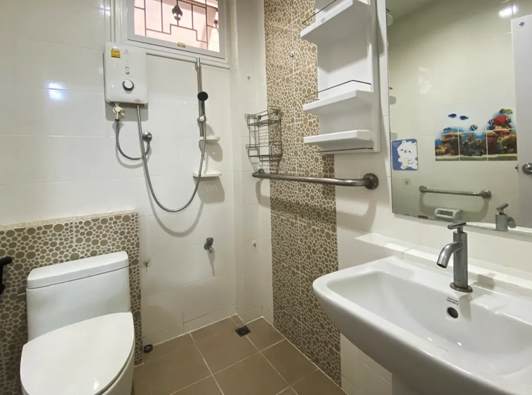 The second floor consists of 3 bedrooms. The master bedroom is ensuite with a shower while the other two bedrooms share a family bathroom. All bedrooms are equipped with a/c and wardrobes. This is a great home for families with children as there is a park opposite. The estate also has a large playground, bicycle lanes, walk path around the lake with gorgeous mountain views as well as a swimming pool and sauna! And of course 24hrs security guard entry point.