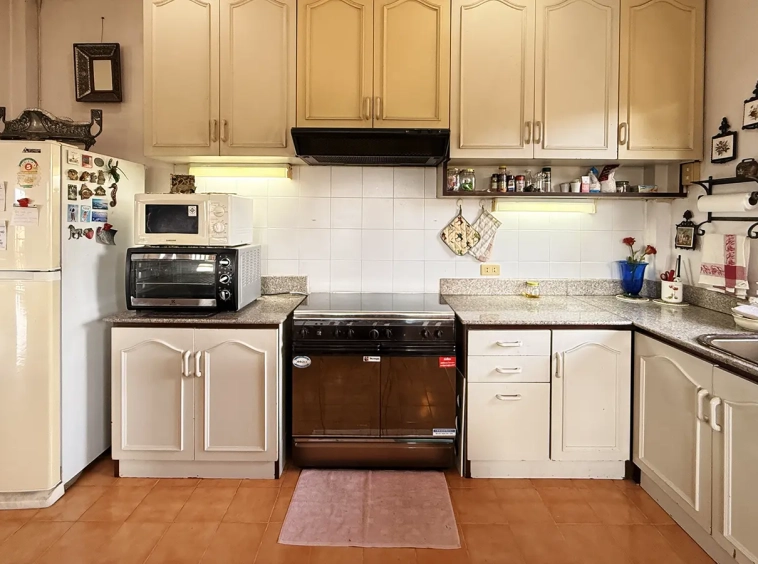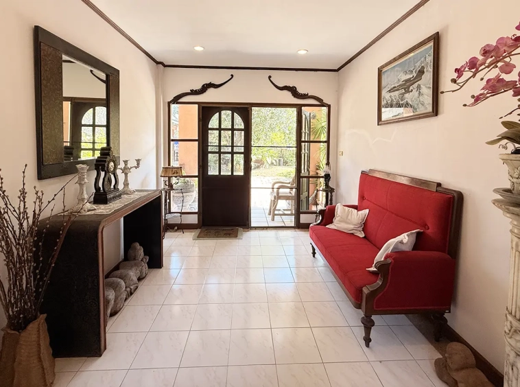 Entering from the front door, the left wing features a welcoming living room and a cozy reading corner, with access to a side terrace. The home is designed in a Norwegian style, featuring extra-thick double walls that provide excellent insulation and keep the interior cool. From the living area, stairs lead down to a spacious basement currently used for storage.