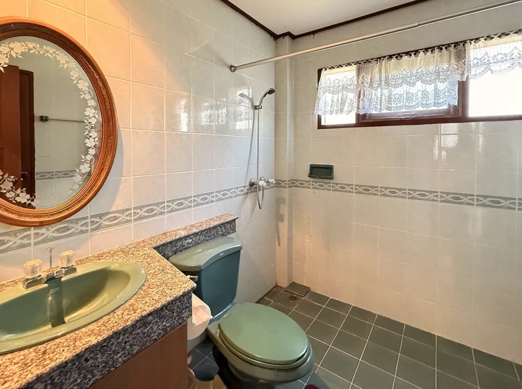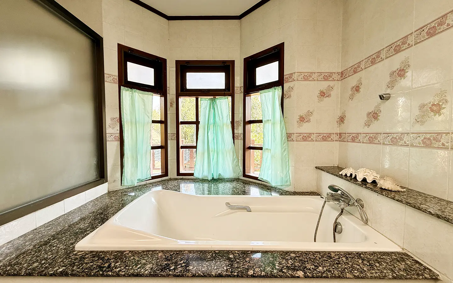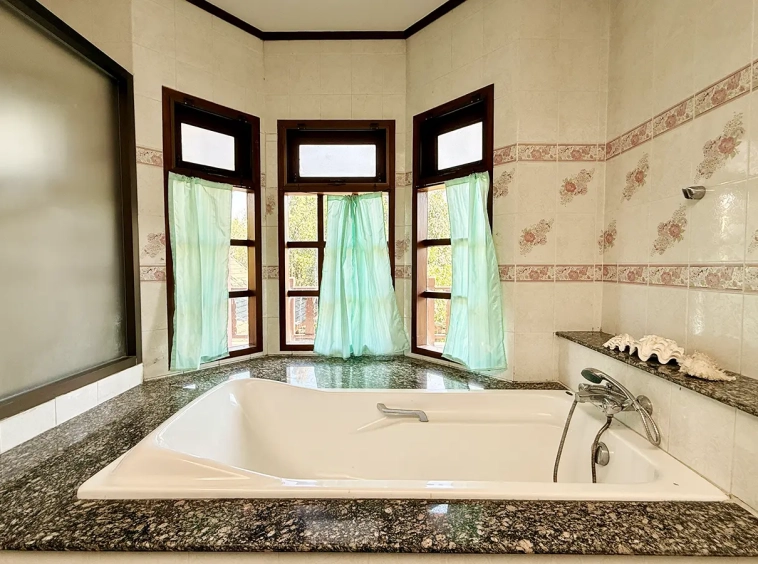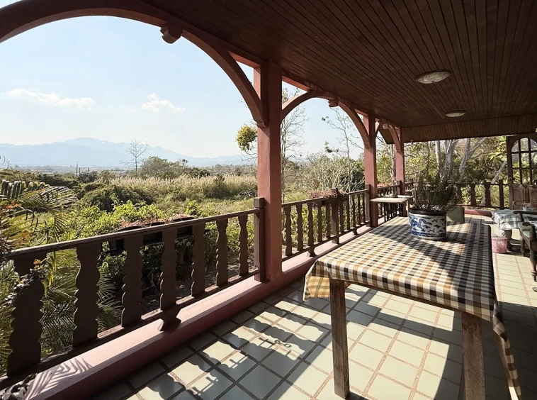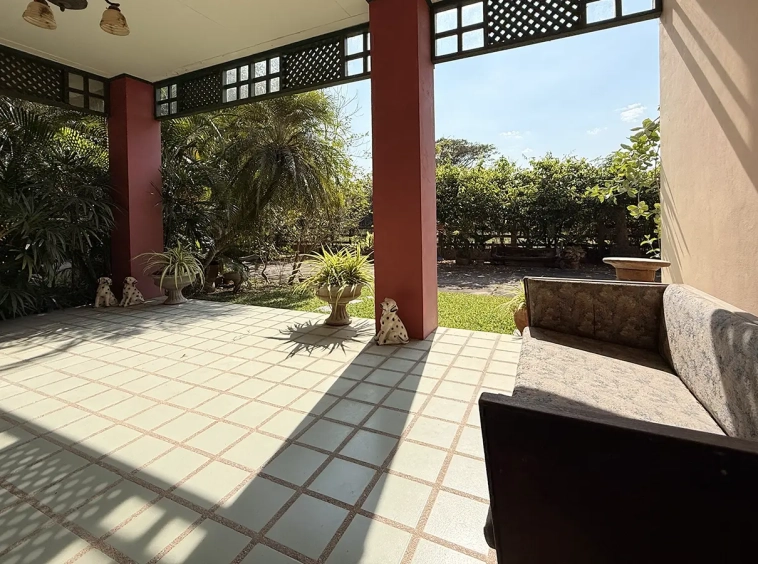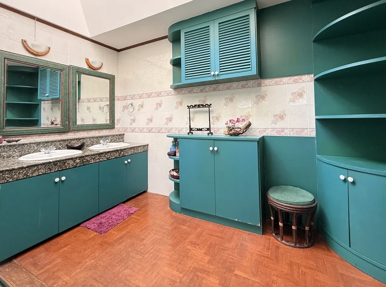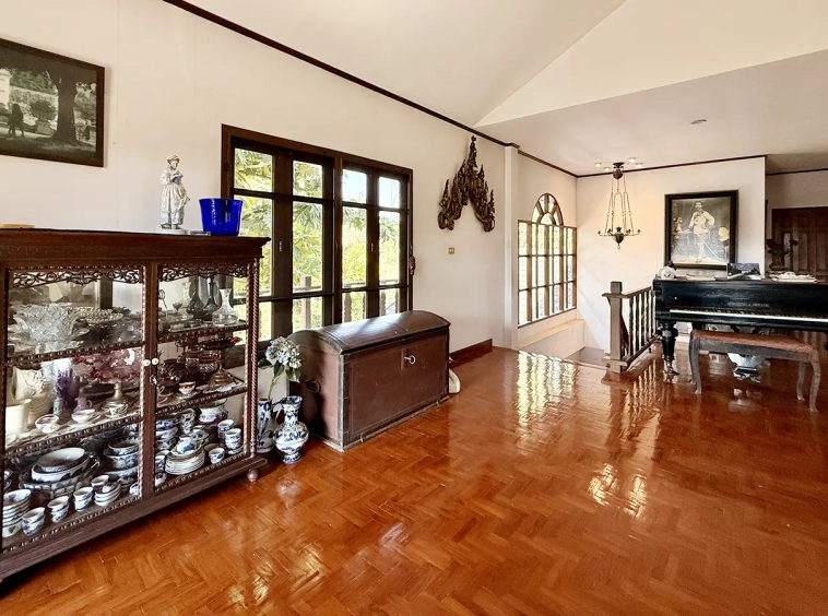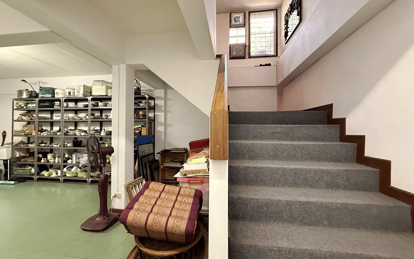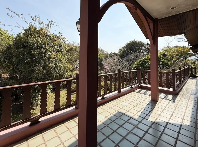 A wide teakwood staircase with natural light panels creates a bright and airy atmosphere. Upstairs, you’ll find a dining area and a European-style kitchen with built-in cabinetry. The elevated ceiling enhances the sense of space and elegance. A wooden door to a generous wraparound balcony that connects around the house. At the far left end of the balcony is a private prayer room.