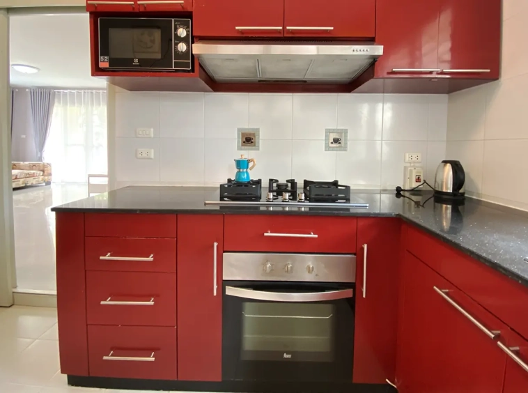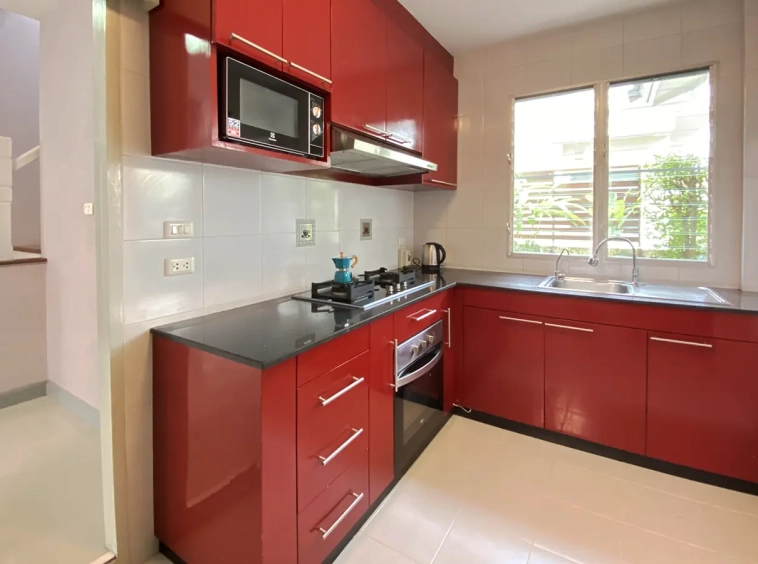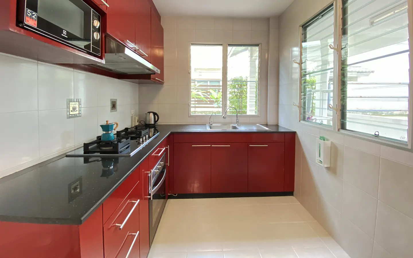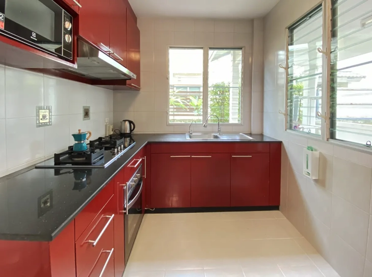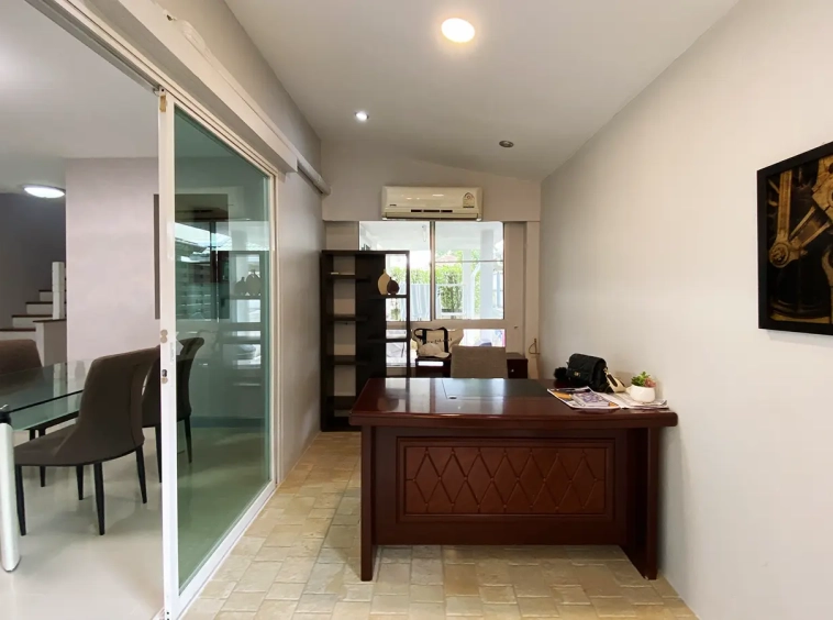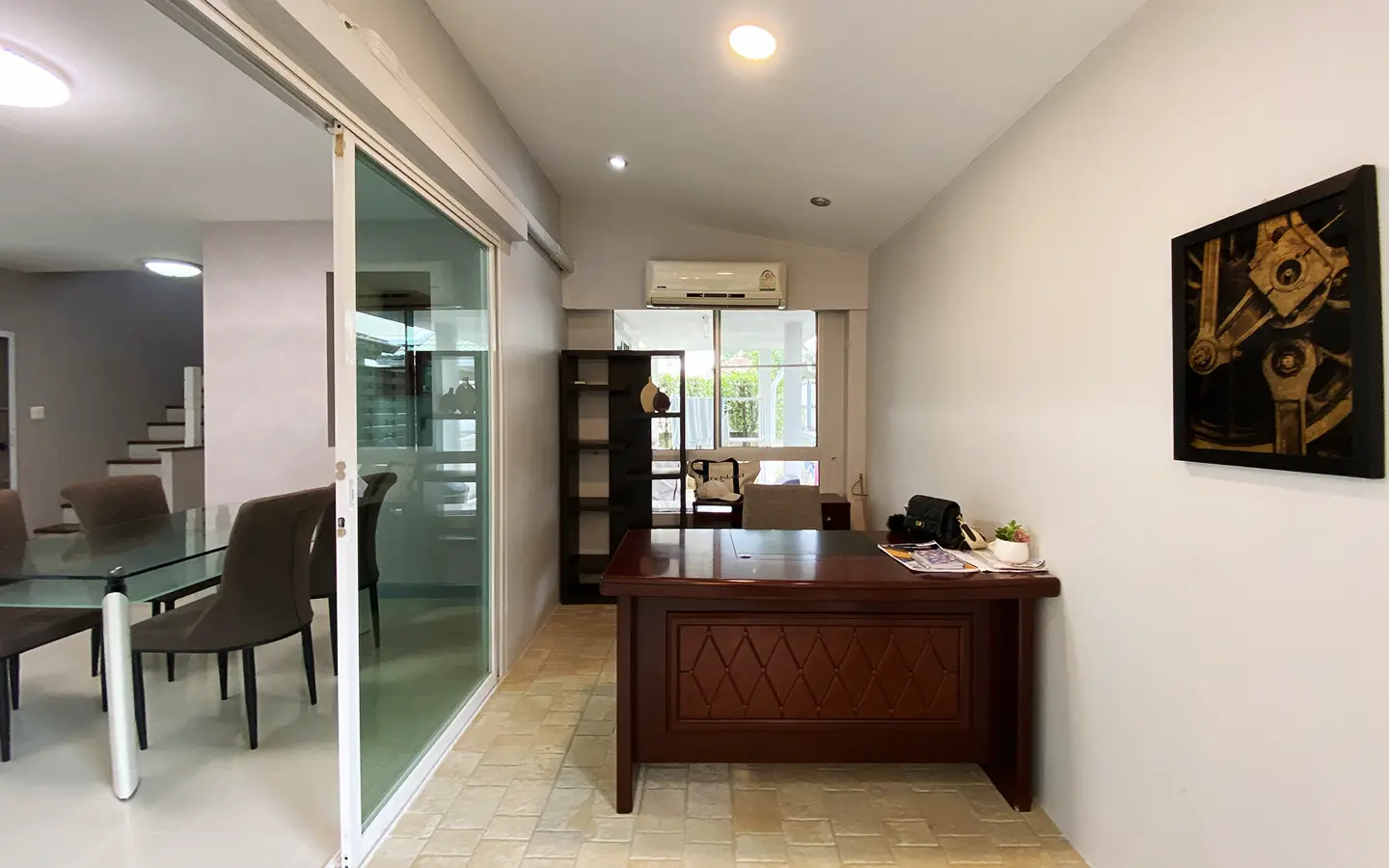 It is well maintained, and on entering the property, there is an open plan living and dining area, with access to a veranda, a guest bathroom, a fully fitted Western-style kitchen with built-in cabinets and drawers, an extension room which is currently used as an office, another living area, and a covered utility area.