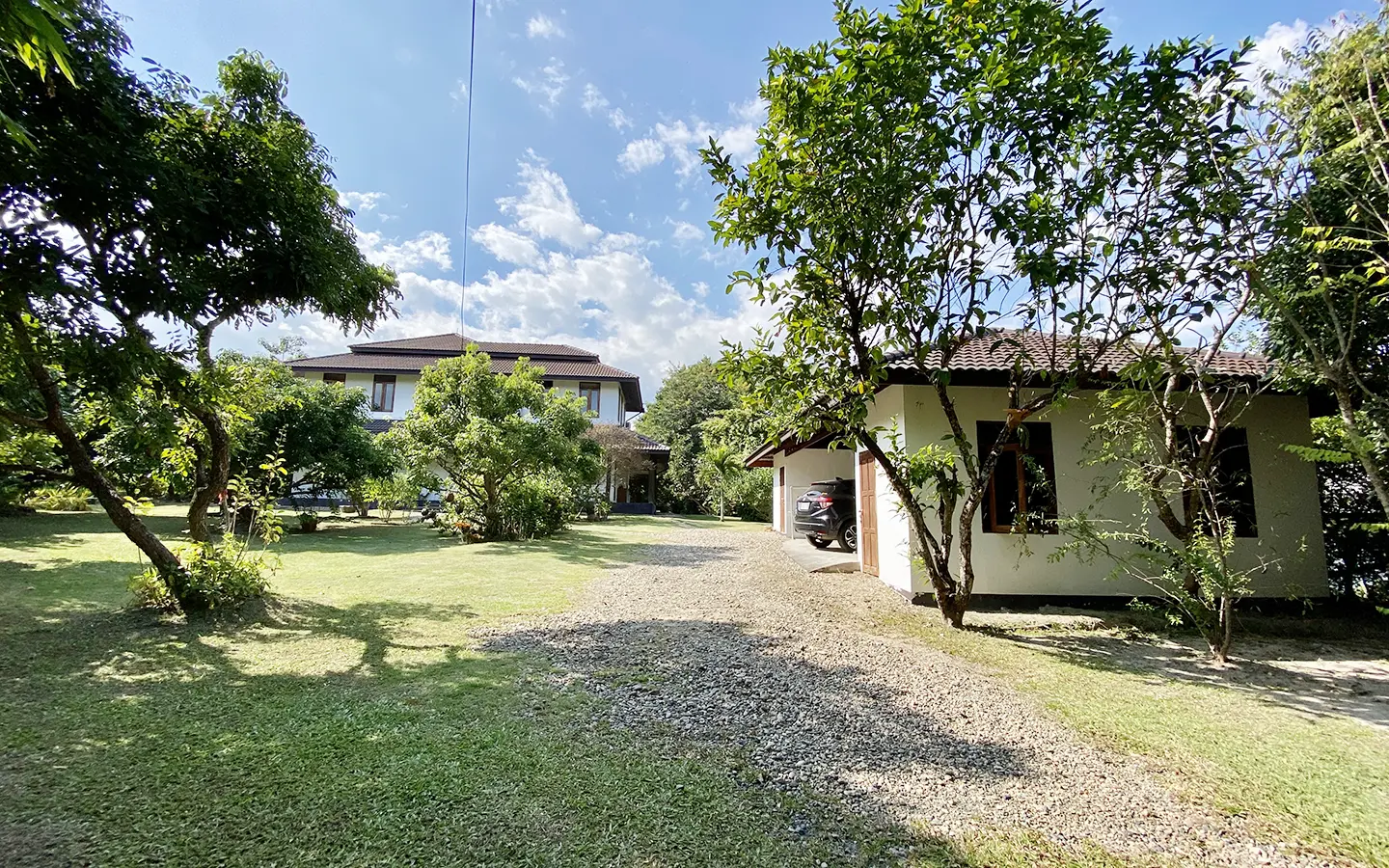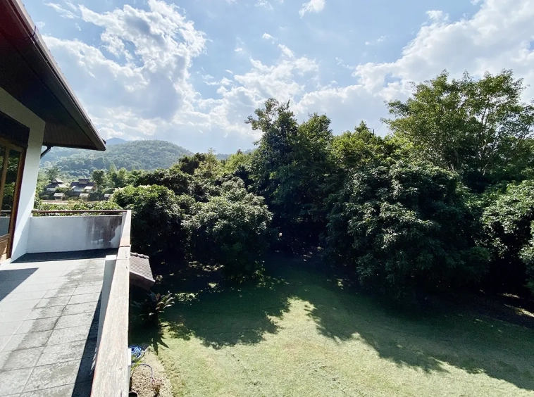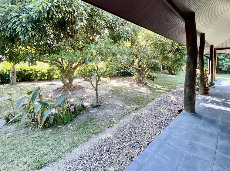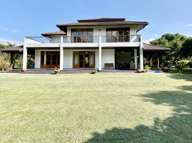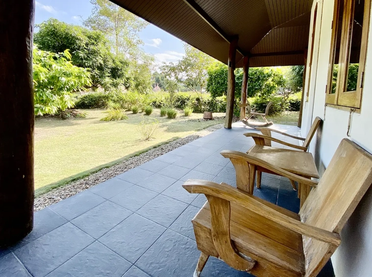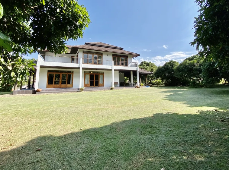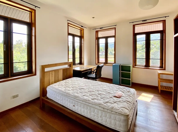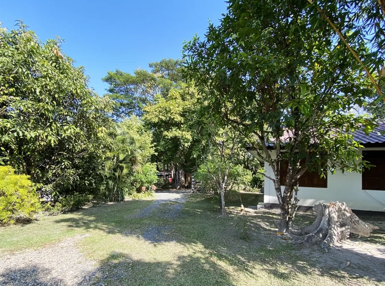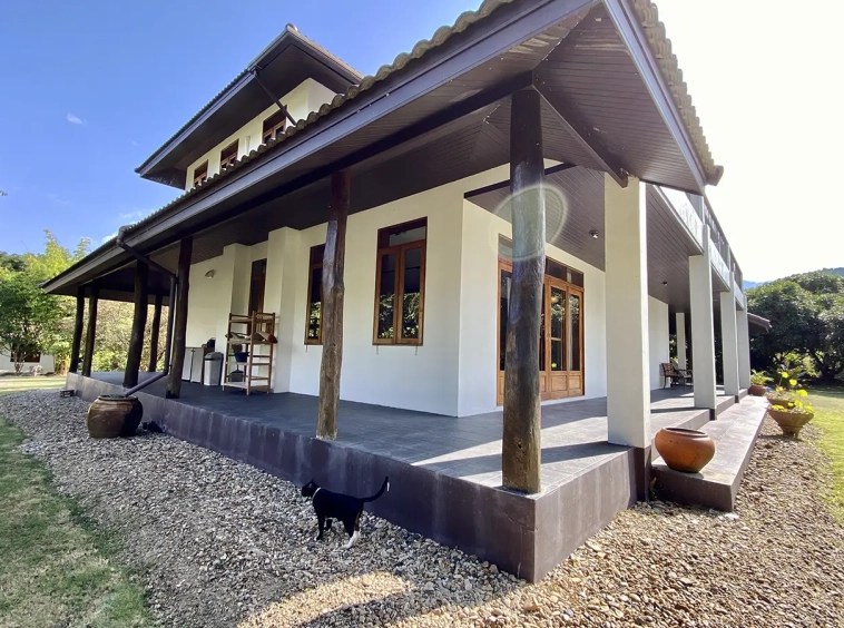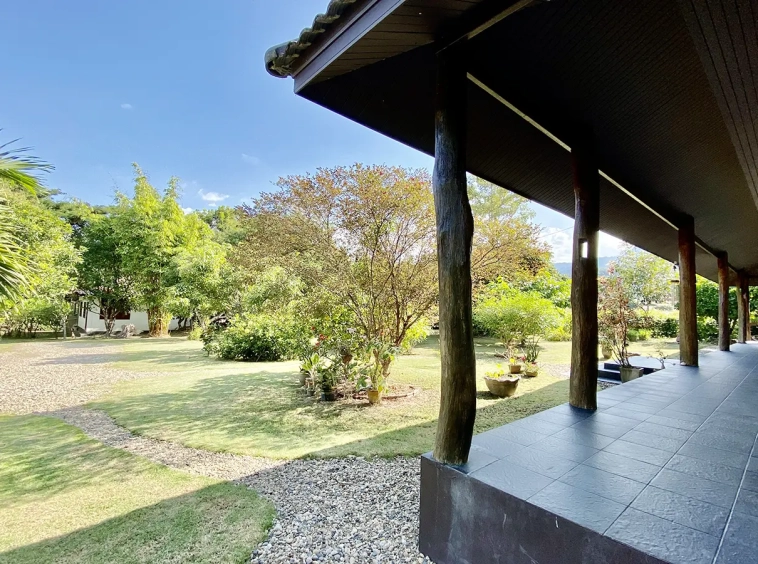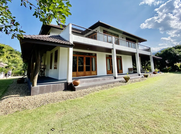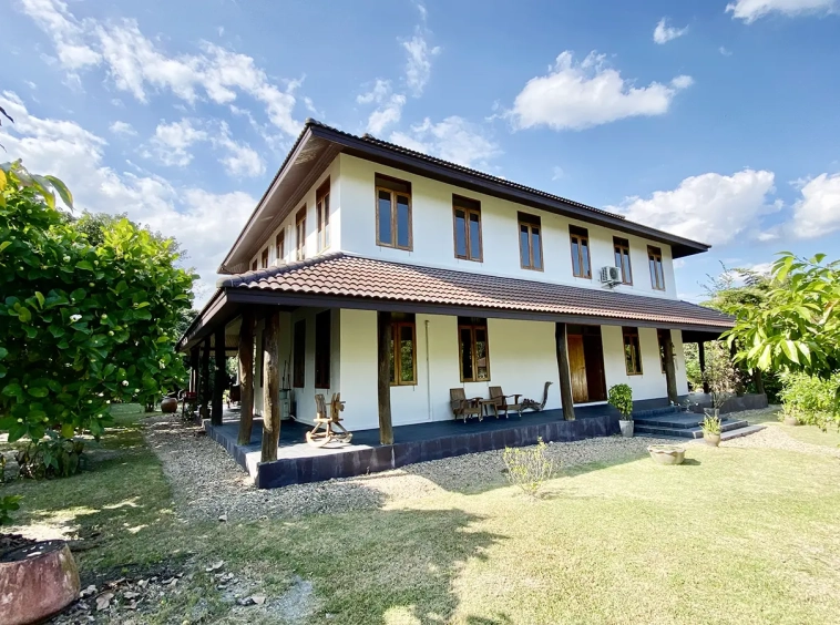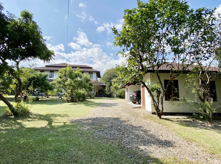 The property sits on a whopping almost 4 rais of land with a fruit trees orchard, a large lawn garden, and backs onto a creek. There is a separate garage with storage rooms, and onto the main house which is slightly elevated and has a wrapped-around covered porch for plenty of natural light and air. On the ground floor to the left is a storage room, an ensuite guest bedroom, a guest bathroom, an open plan living/dining room, and a large fully equipped Western kitchen with a food preparation island and access to the rear. The floor both on the ground floor and first floor is of wide teakwood, double isolation, 3 meters tall ceiling, and several folding doors with access to the porch for energy-saving and outdoor living. Large terrace for outdoor dining and entertaining.