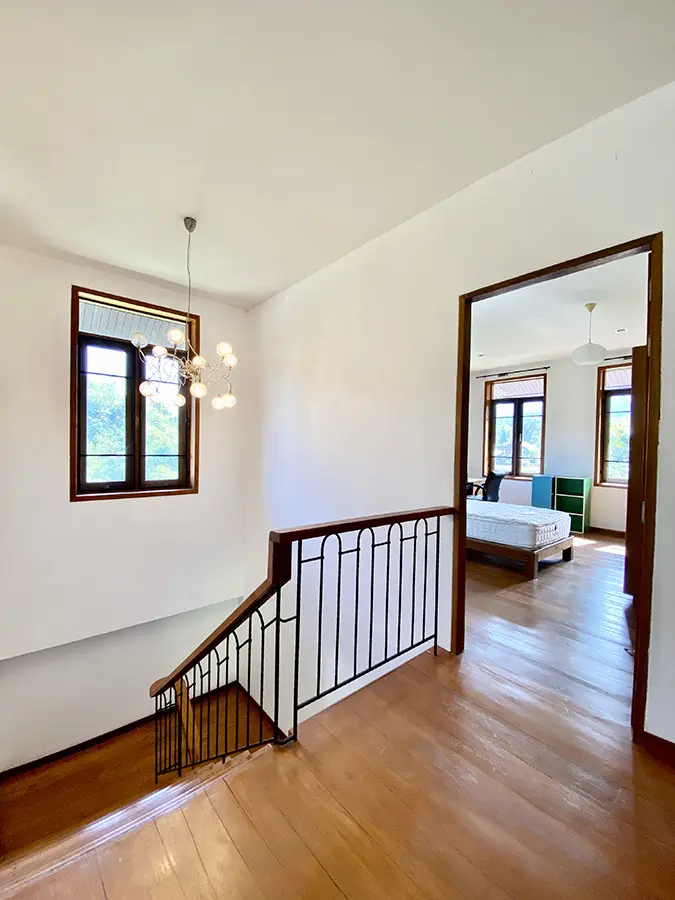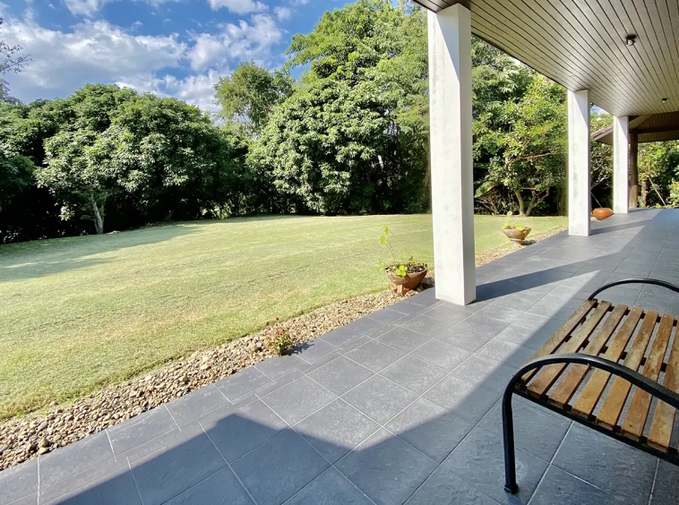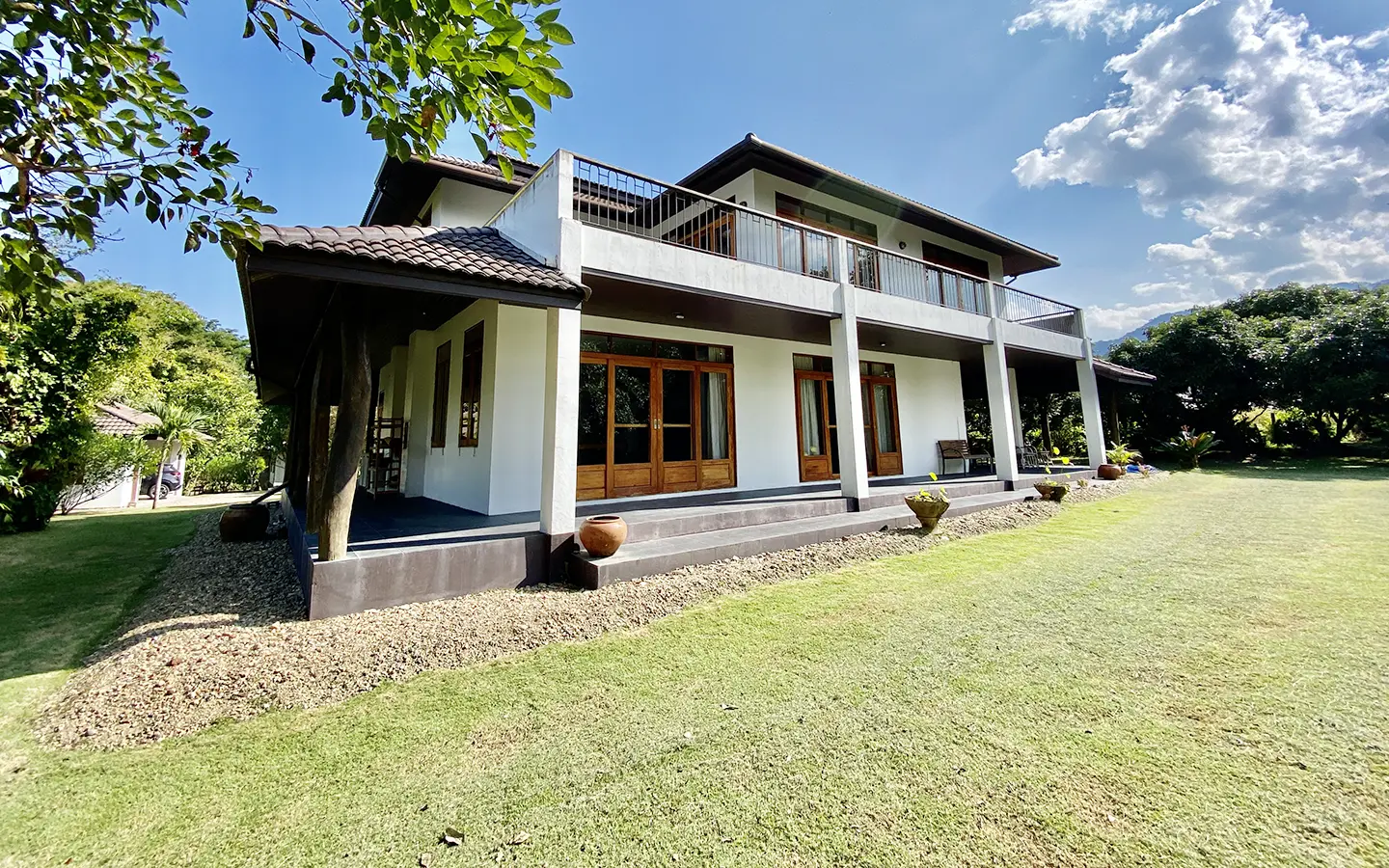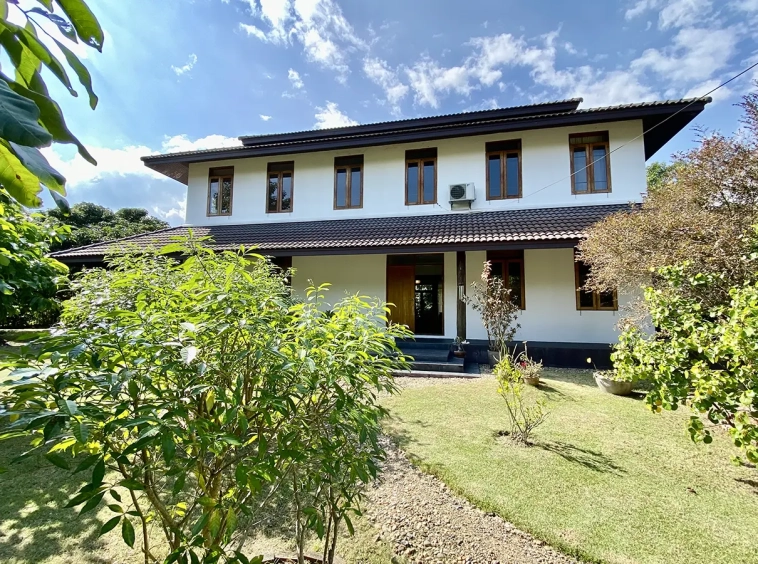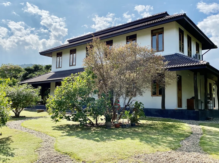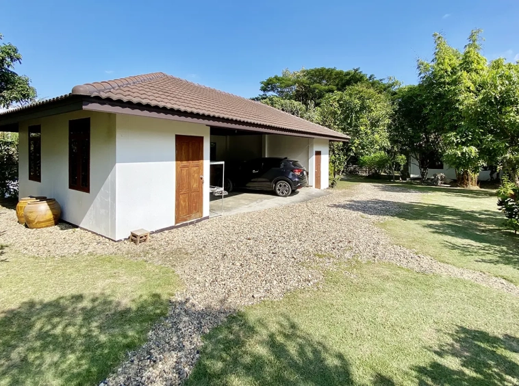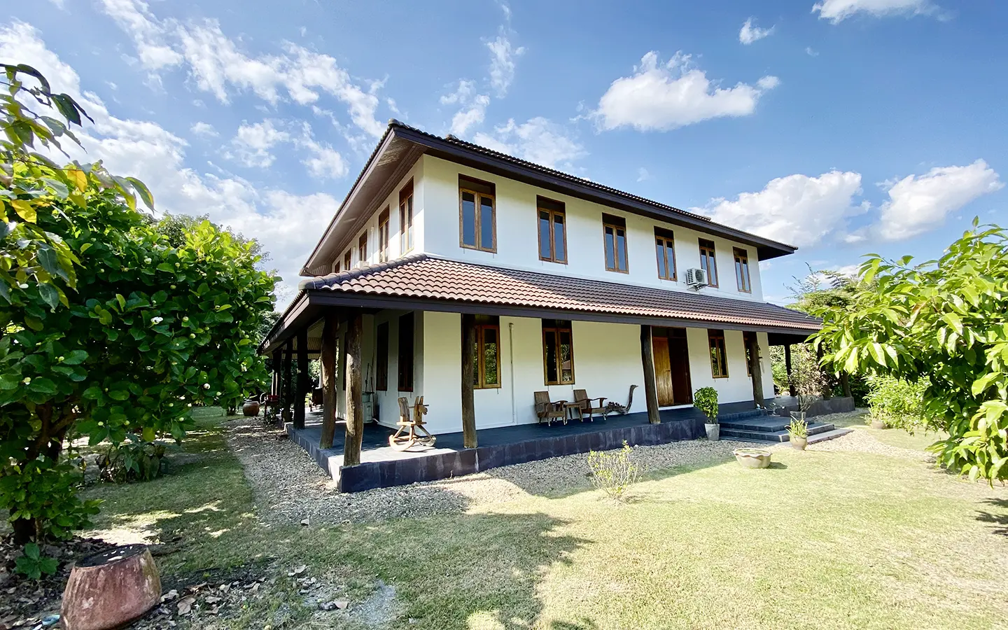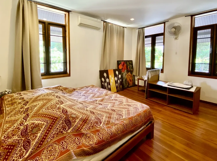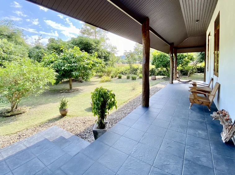 The property sits on a whopping almost 4 rais of land with a fruit trees orchard, a large lawn garden, and backs onto a creek. There is a separate garage with storage rooms, and onto the main house which is slightly elevated and has a wrapped-around covered porch for plenty of natural light and air. On the ground floor to the left is a storage room, an ensuite guest bedroom, a guest bathroom, an open plan living/dining room, and a large fully equipped Western kitchen with a food preparation island and access to the rear. The floor both on the ground floor and first floor is of wide teakwood, double isolation, 3 meters tall ceiling, and several folding doors with access to the porch for energy-saving and outdoor living. Large terrace for outdoor dining and entertaining.