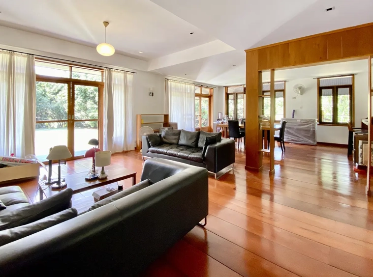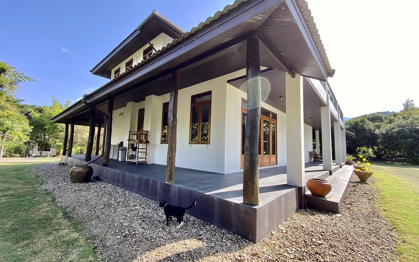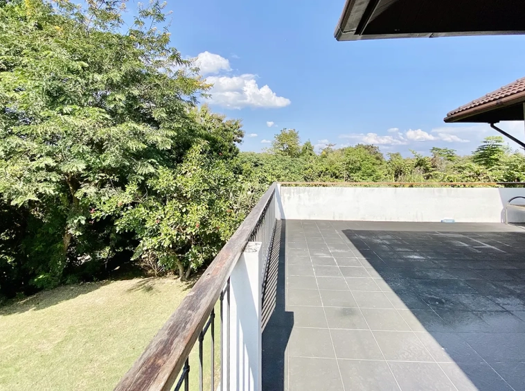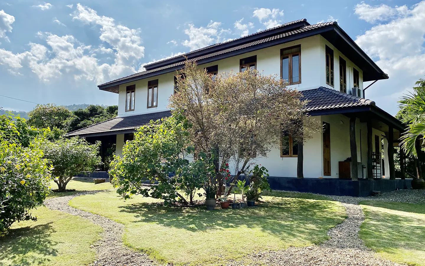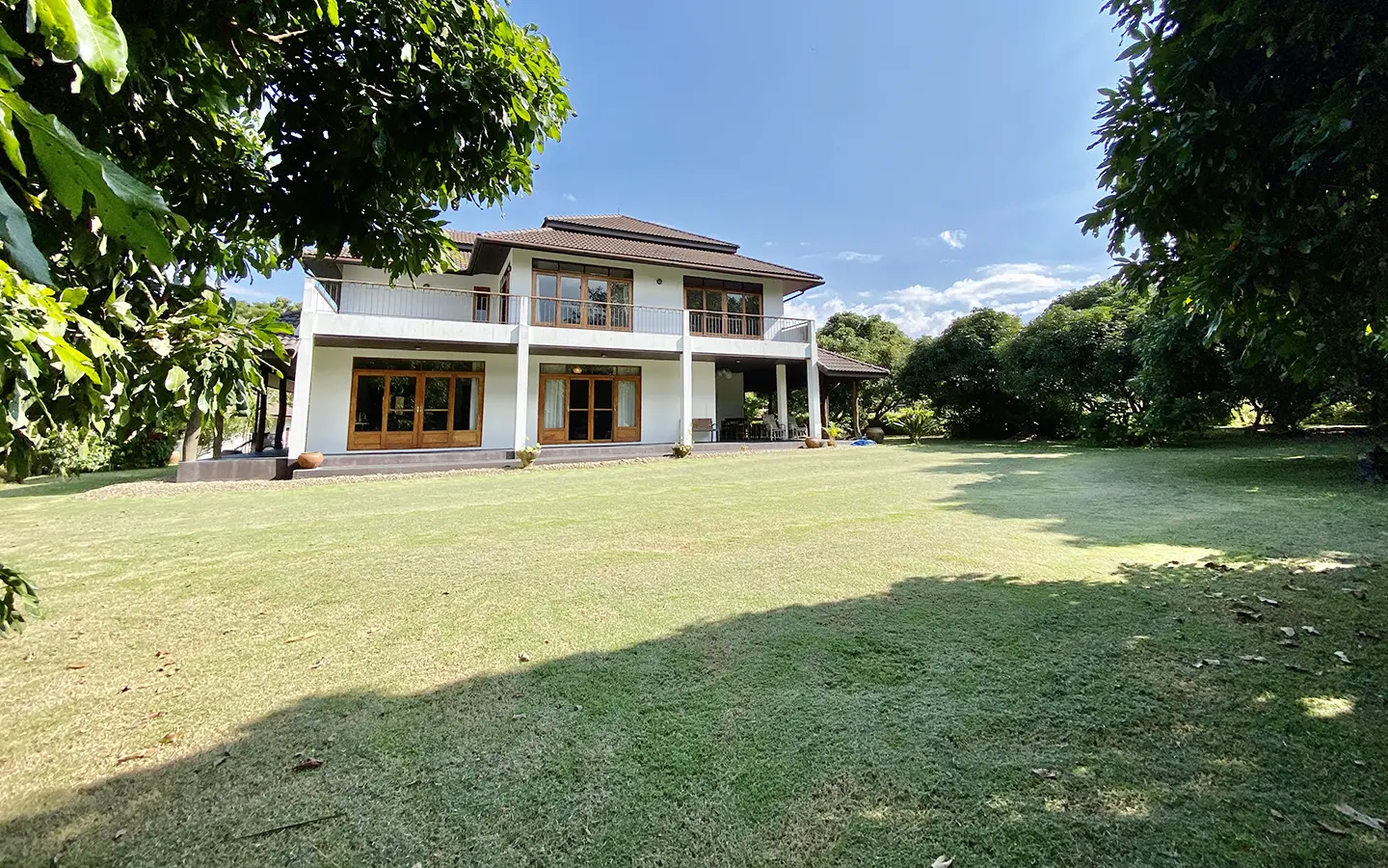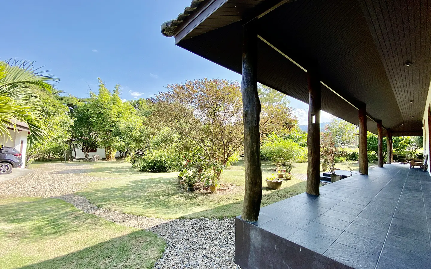 The property sits on a whopping almost 4 rais of land with a fruit trees orchard, a large lawn garden, and backs onto a creek. There is a separate garage with storage rooms, and onto the main house which is slightly elevated and has a wrapped-around covered porch for plenty of natural light and air. On the ground floor to the left is a storage room, an ensuite guest bedroom, a guest bathroom, an open plan living/dining room, and a large fully equipped Western kitchen with a food preparation island and access to the rear. The floor both on the ground floor and first floor is of wide teakwood, double isolation, 3 meters tall ceiling, and several folding doors with access to the porch for energy-saving and outdoor living. Large terrace for outdoor dining and entertaining.