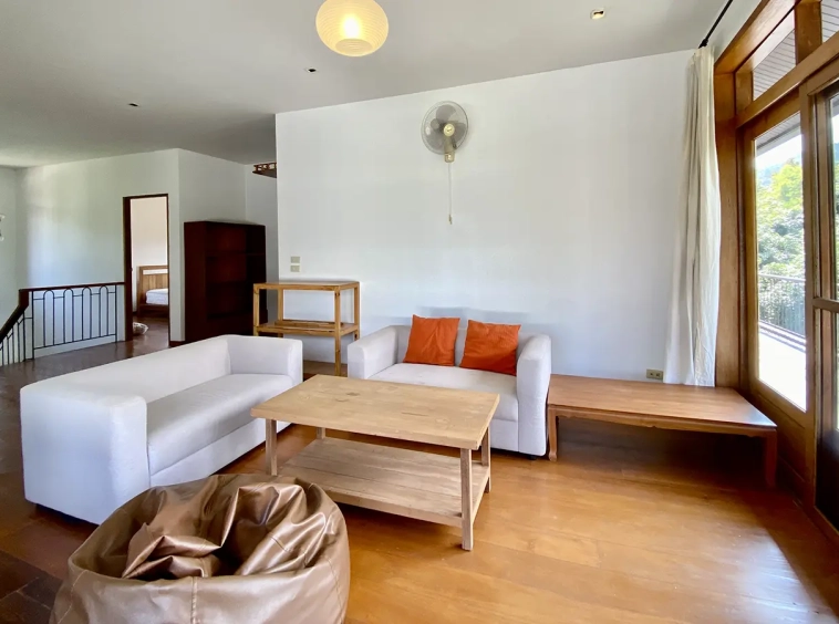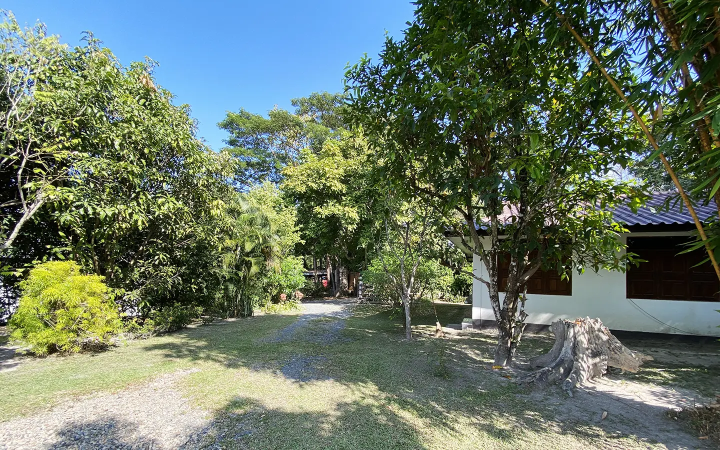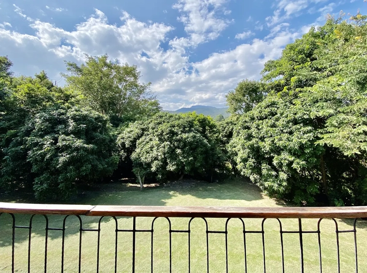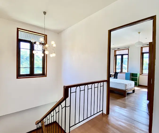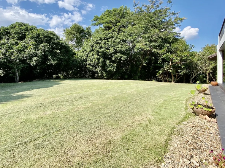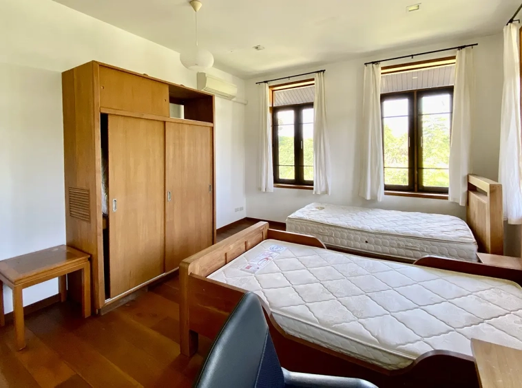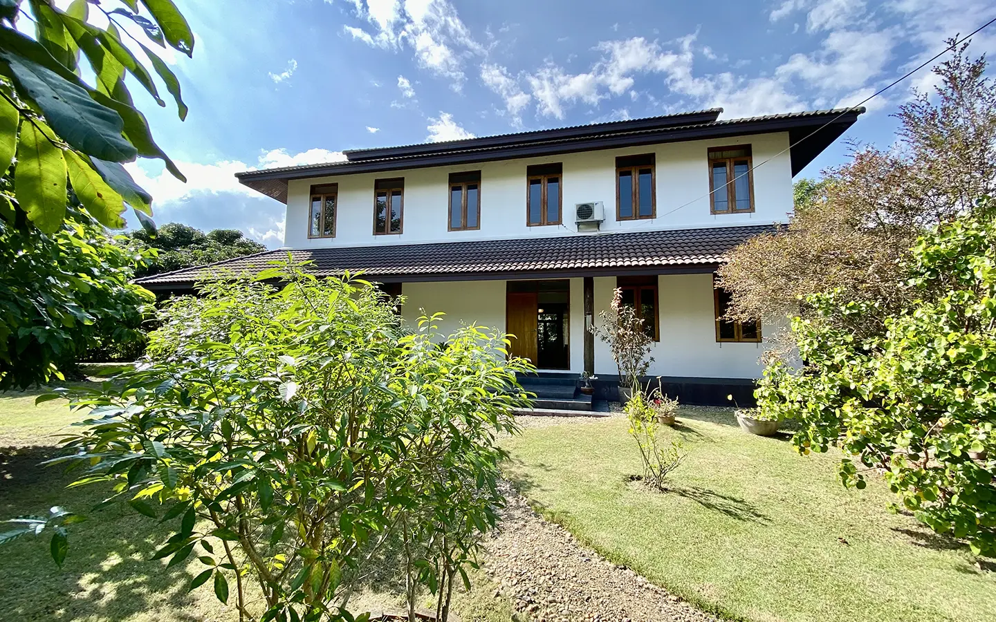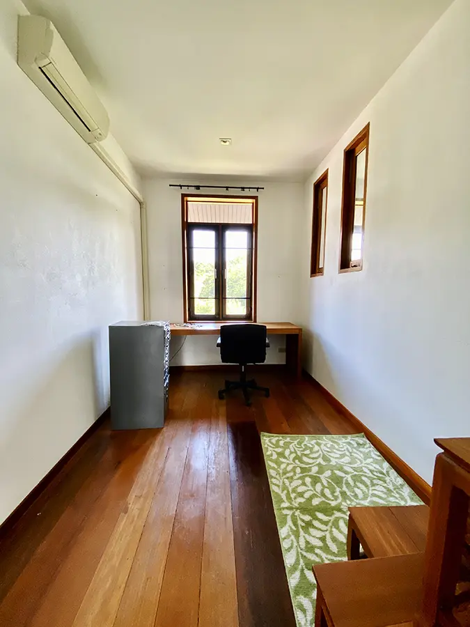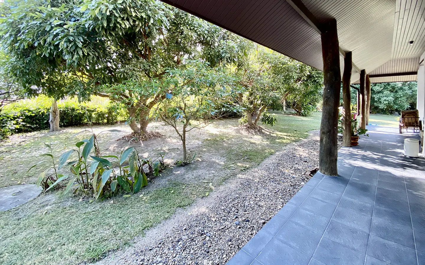 The property sits on a whopping almost 4 rais of land with a fruit trees orchard, a large lawn garden, and backs onto a creek. There is a separate garage with storage rooms, and onto the main house which is slightly elevated and has a wrapped-around covered porch for plenty of natural light and air. On the ground floor to the left is a storage room, an ensuite guest bedroom, a guest bathroom, an open plan living/dining room, and a large fully equipped Western kitchen with a food preparation island and access to the rear. The floor both on the ground floor and first floor is of wide teakwood, double isolation, 3 meters tall ceiling, and several folding doors with access to the porch for energy-saving and outdoor living. Large terrace for outdoor dining and entertaining.