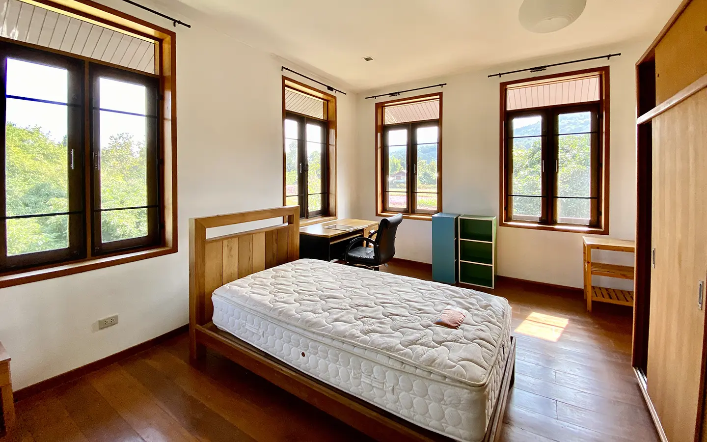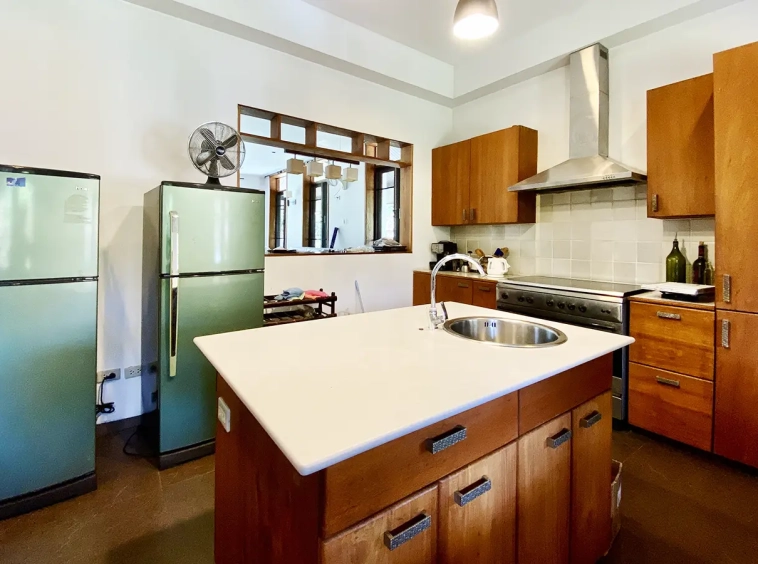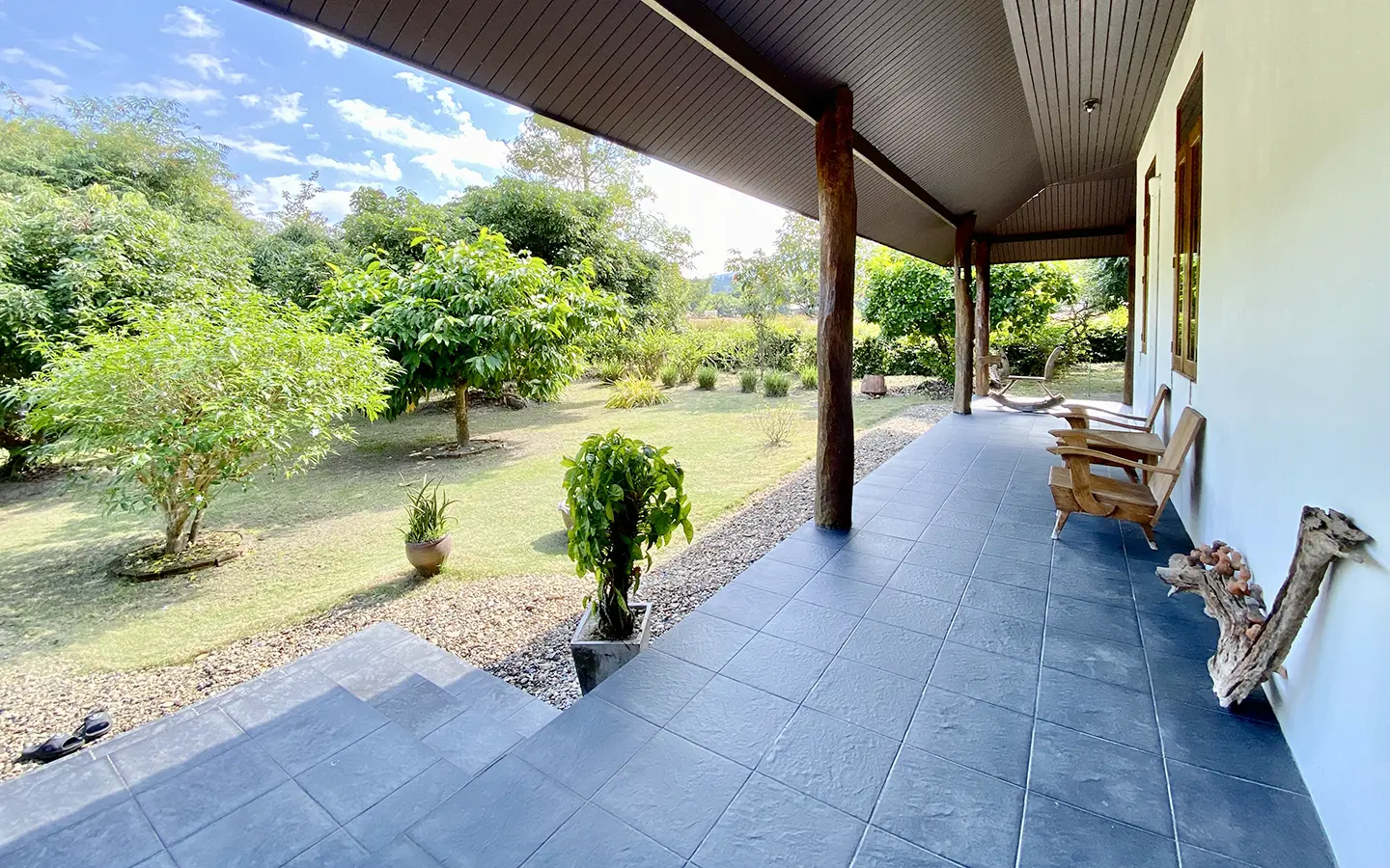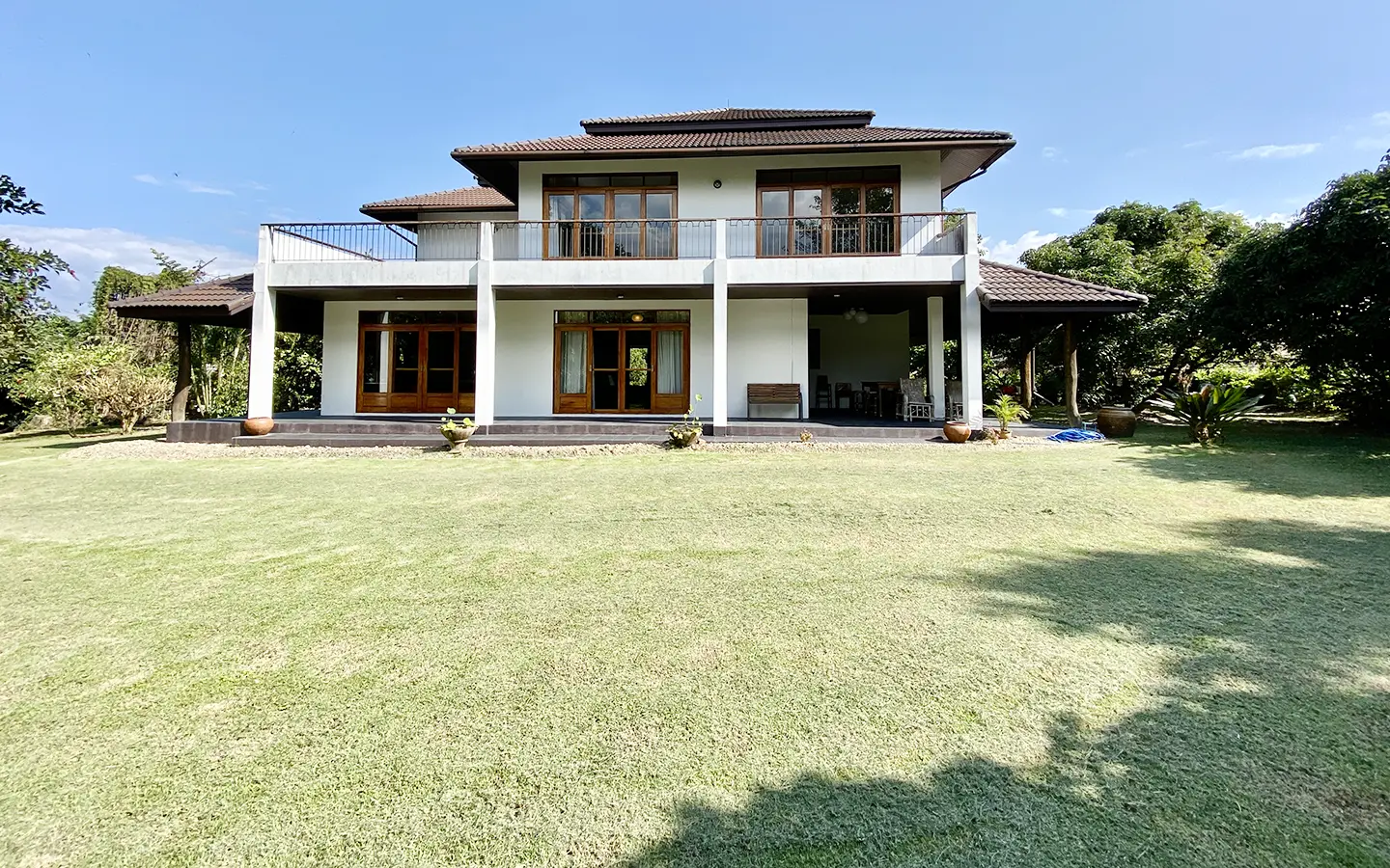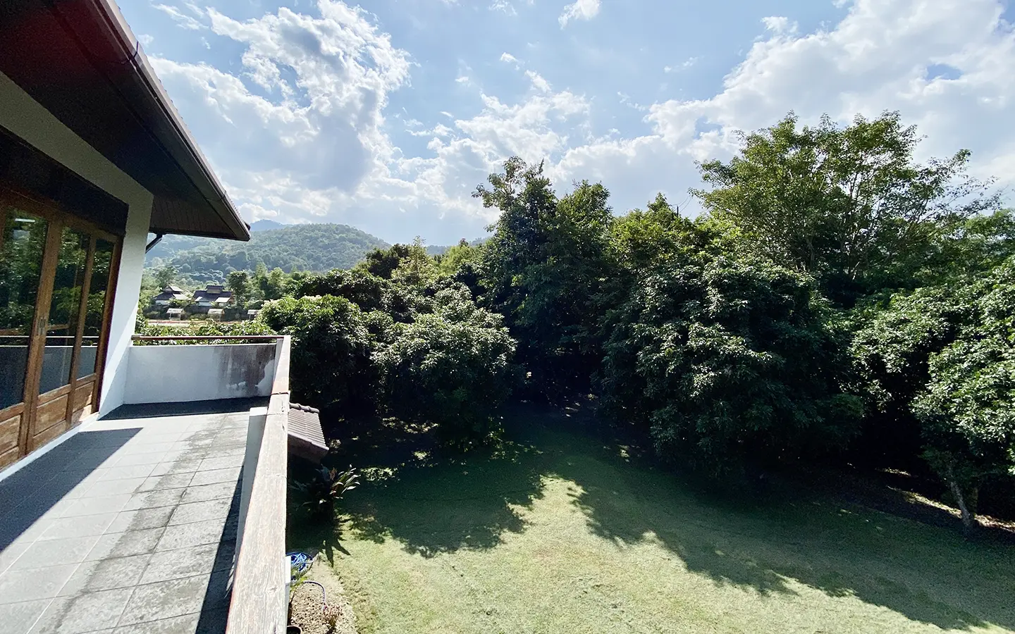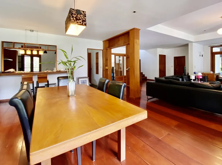 The property sits on a whopping almost 4 rais of land with a fruit trees orchard, a large lawn garden, and backs onto a creek. There is a separate garage with storage rooms, and onto the main house which is slightly elevated and has a wrapped-around covered porch for plenty of natural light and air. On the ground floor to the left is a storage room, an ensuite guest bedroom, a guest bathroom, an open plan living/dining room, and a large fully equipped Western kitchen with a food preparation island and access to the rear. The floor both on the ground floor and first floor is of wide teakwood, double isolation, 3 meters tall ceiling, and several folding doors with access to the porch for energy-saving and outdoor living. Large terrace for outdoor dining and entertaining.