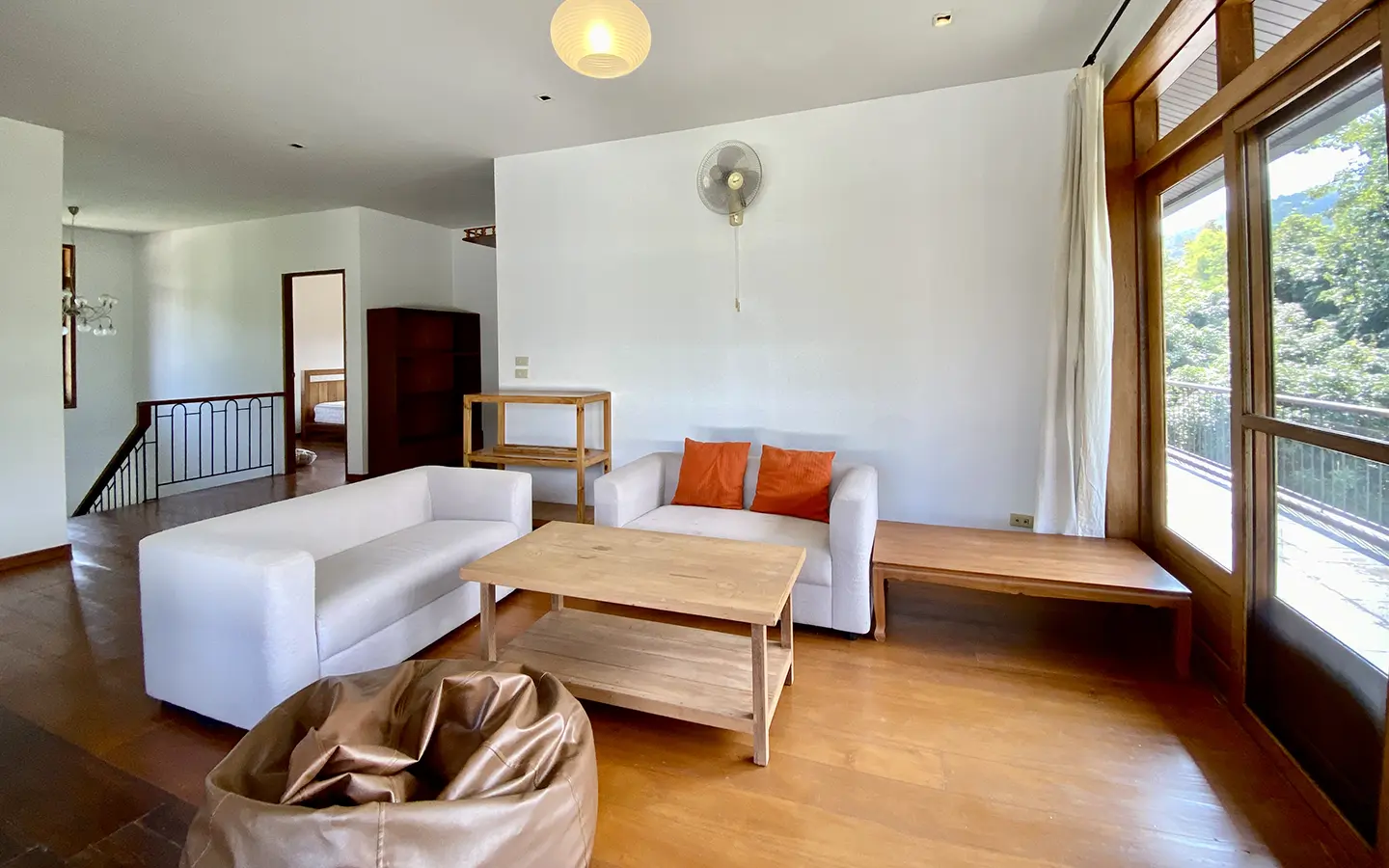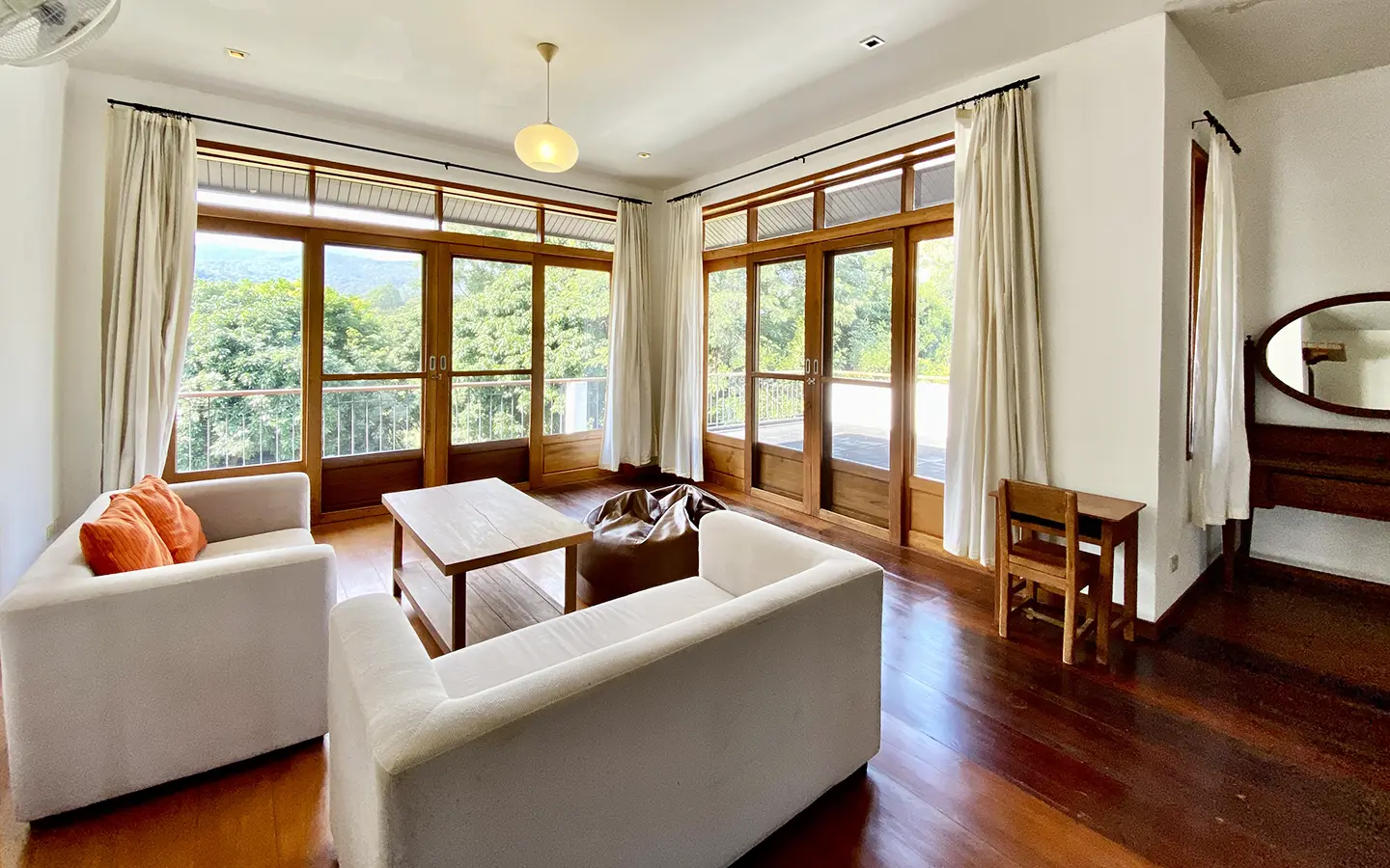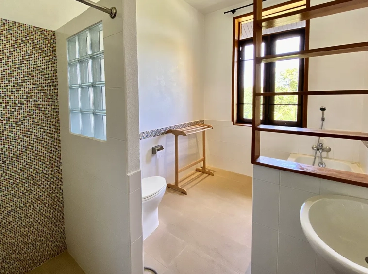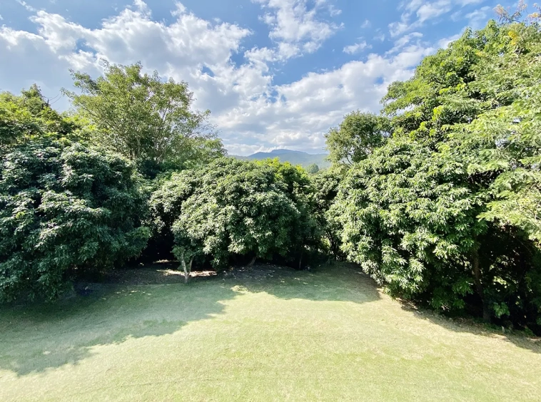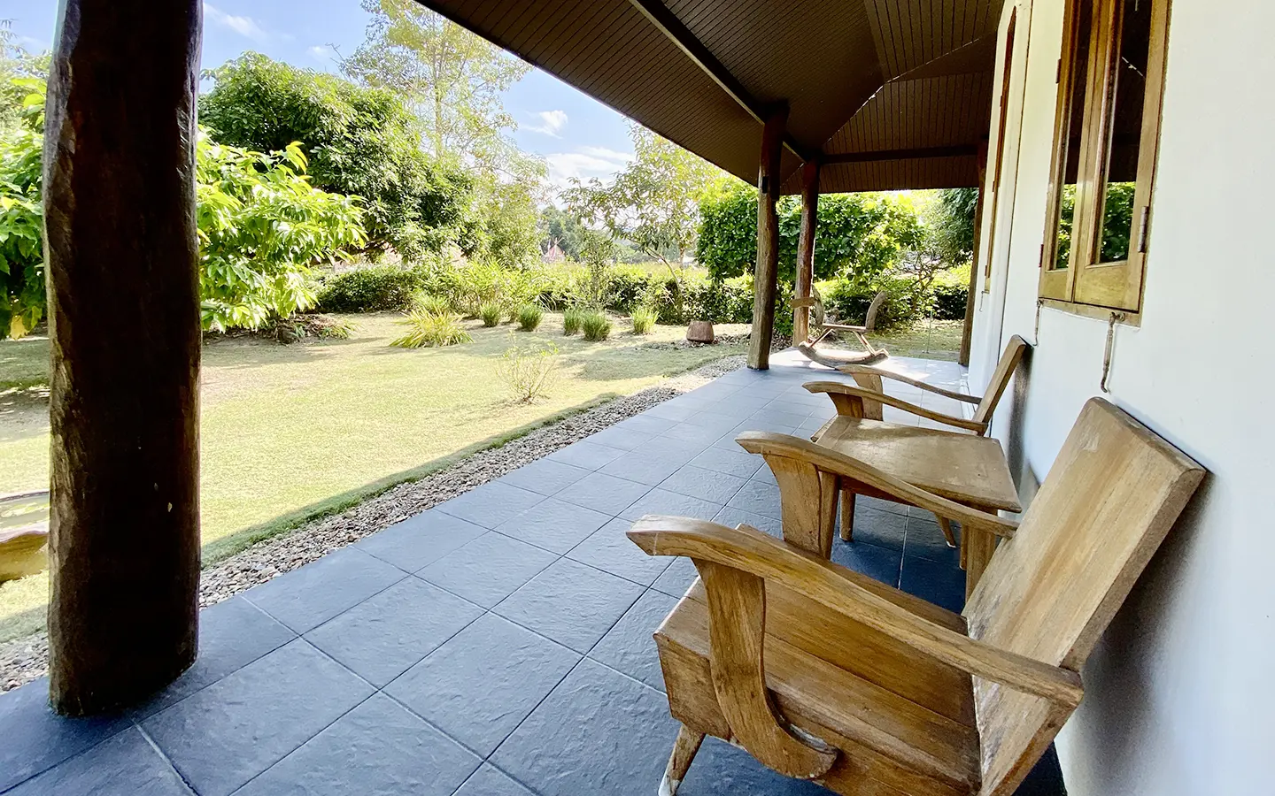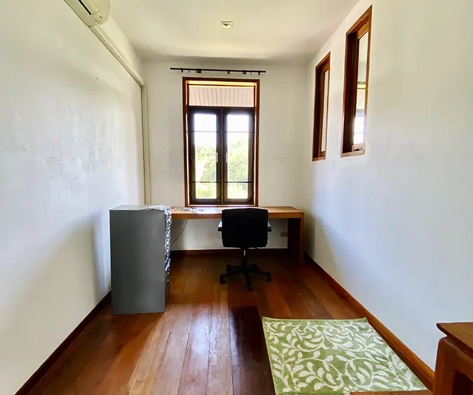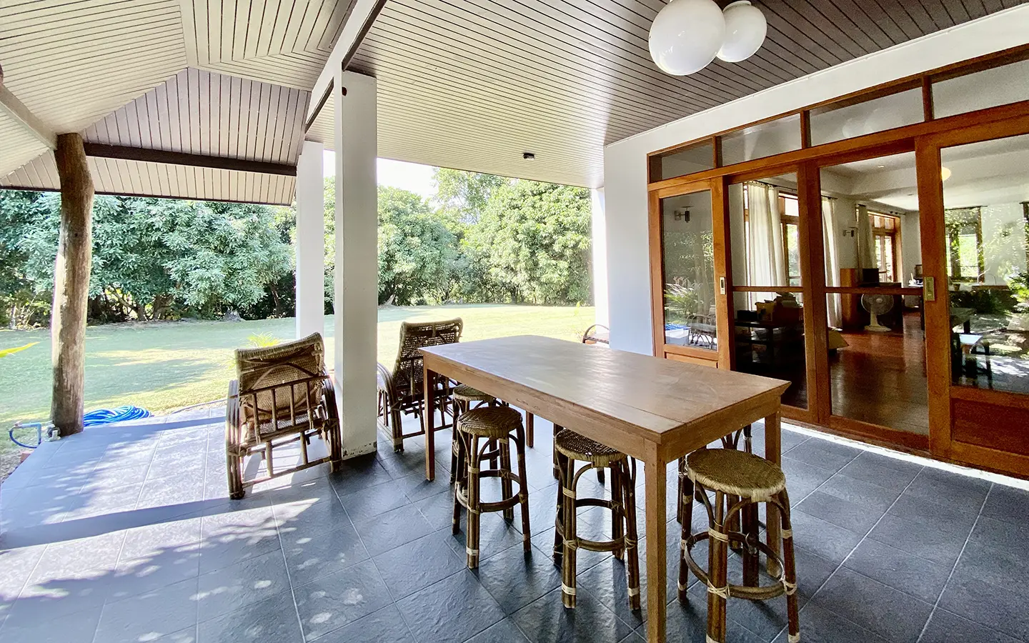 The property sits on a whopping almost 4 rais of land with a fruit trees orchard, a large lawn garden, and backs onto a creek. There is a separate garage with storage rooms, and onto the main house which is slightly elevated and has a wrapped-around covered porch for plenty of natural light and air. On the ground floor to the left is a storage room, an ensuite guest bedroom, a guest bathroom, an open plan living/dining room, and a large fully equipped Western kitchen with a food preparation island and access to the rear. The floor both on the ground floor and first floor is of wide teakwood, double isolation, 3 meters tall ceiling, and several folding doors with access to the porch for energy-saving and outdoor living. Large terrace for outdoor dining and entertaining.