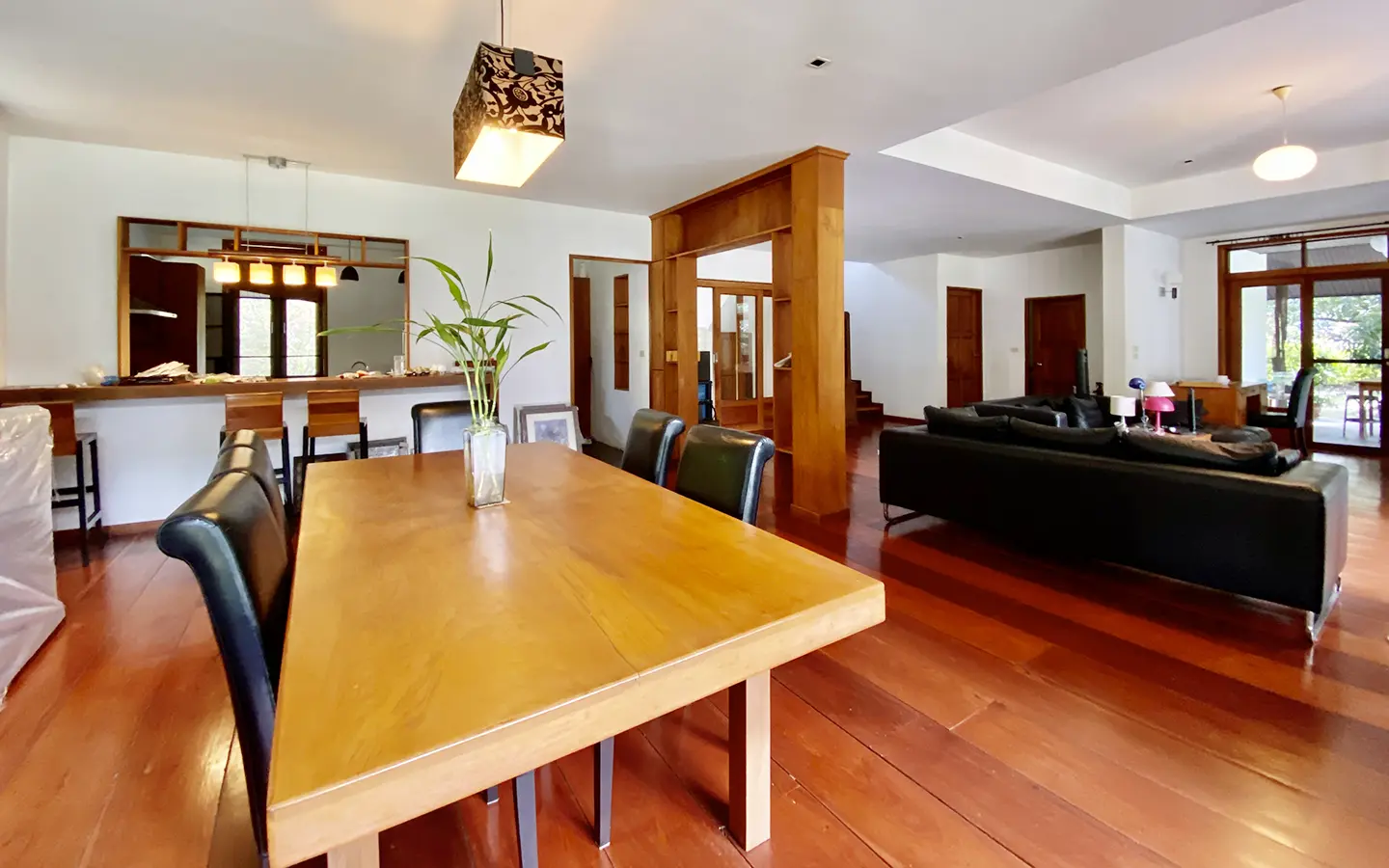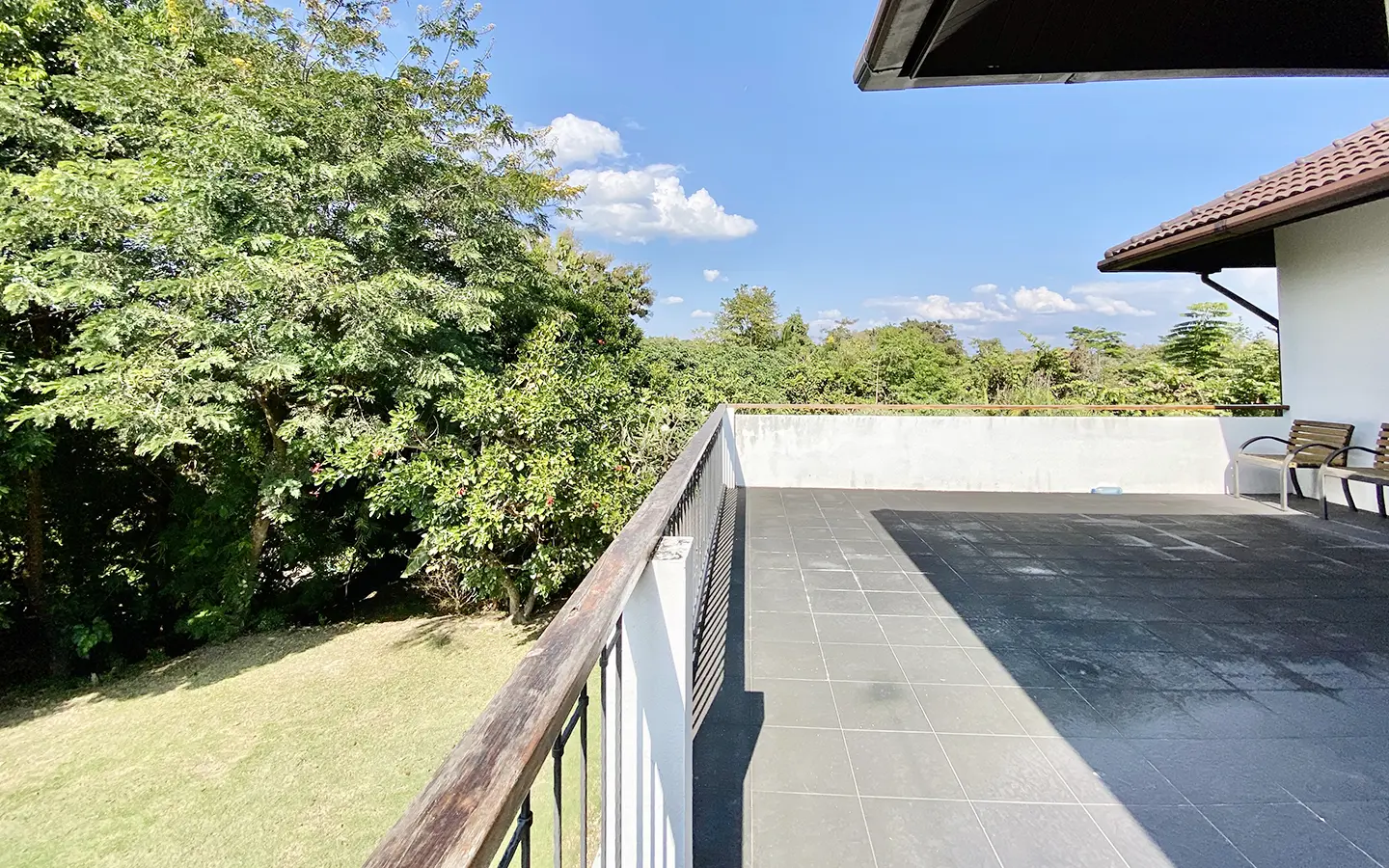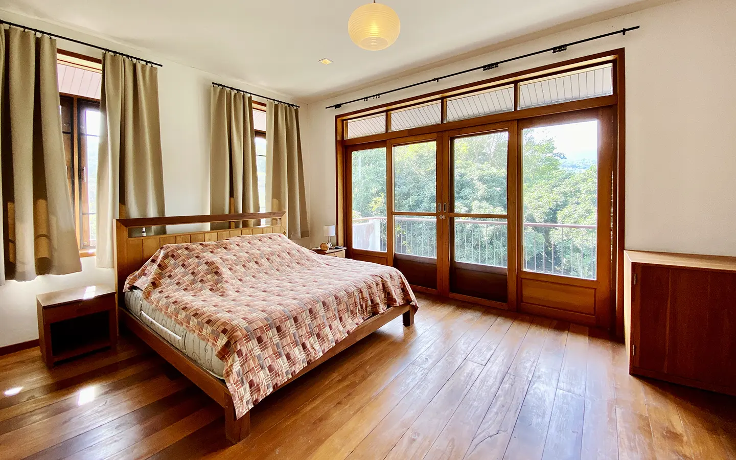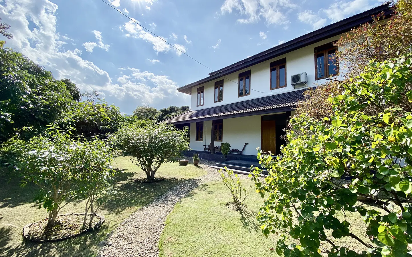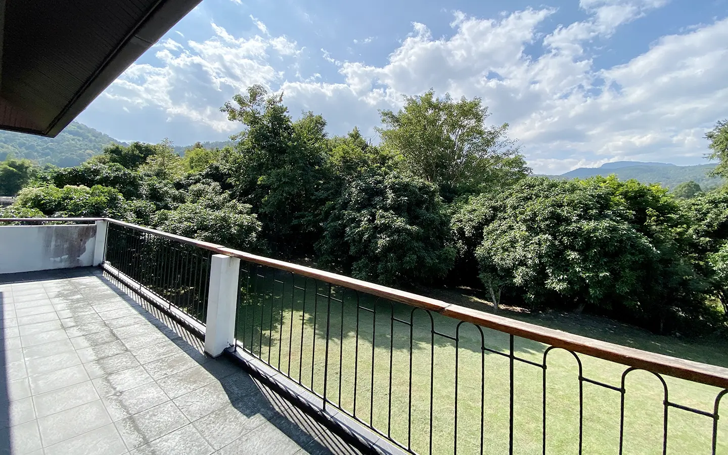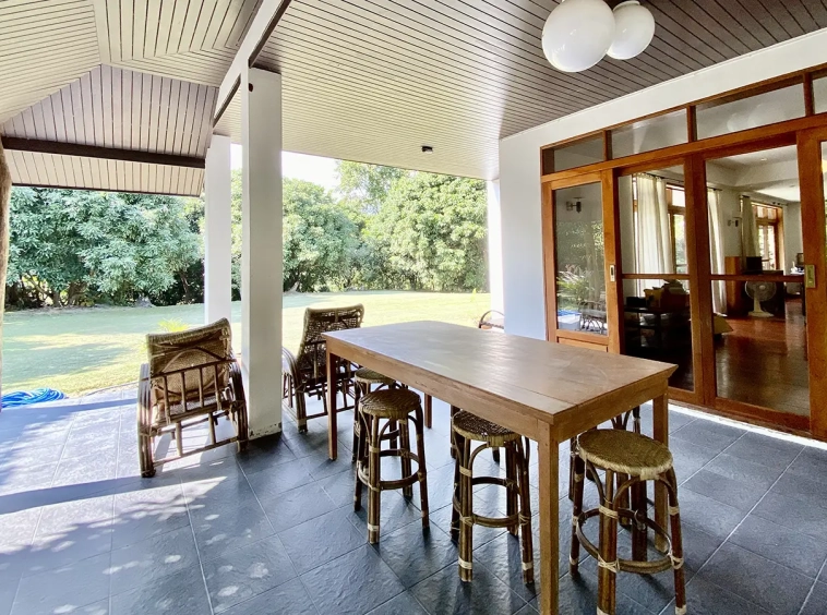 The property sits on a whopping almost 4 rais of land with a fruit trees orchard, a large lawn garden, and backs onto a creek. There is a separate garage with storage rooms, and onto the main house which is slightly elevated and has a wrapped-around covered porch for plenty of natural light and air. On the ground floor to the left is a storage room, an ensuite guest bedroom, a guest bathroom, an open plan living/dining room, and a large fully equipped Western kitchen with a food preparation island and access to the rear. The floor both on the ground floor and first floor is of wide teakwood, double isolation, 3 meters tall ceiling, and several folding doors with access to the porch for energy-saving and outdoor living. Large terrace for outdoor dining and entertaining.