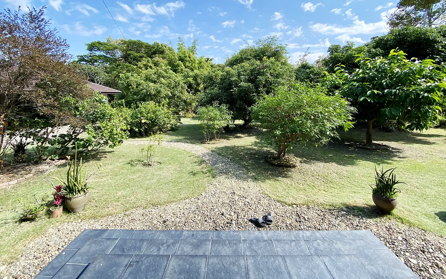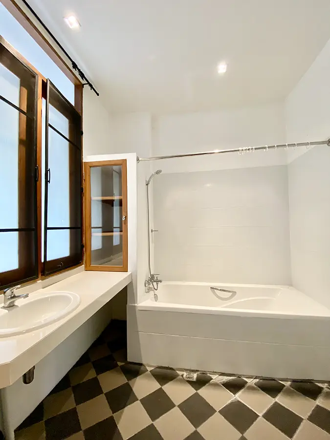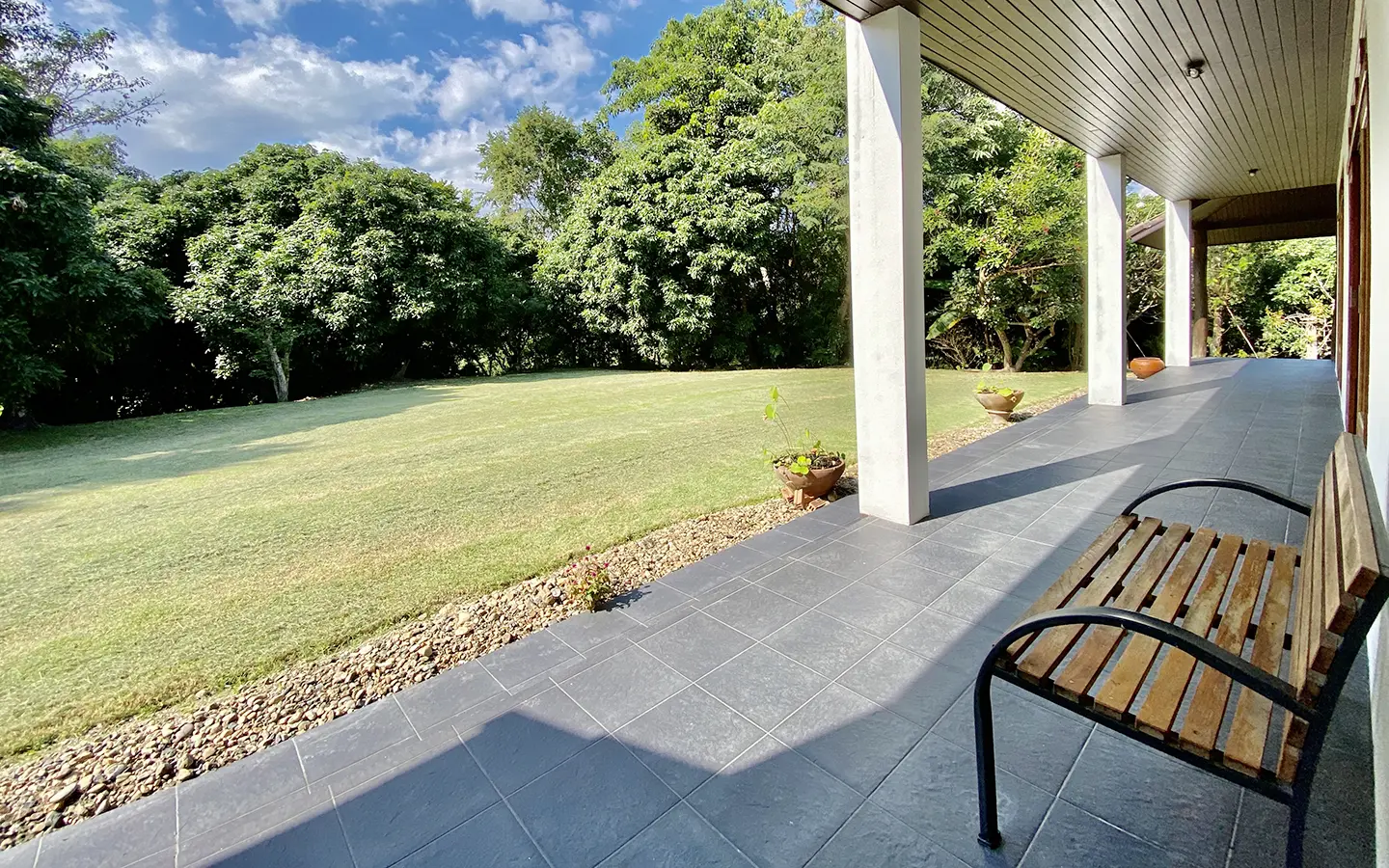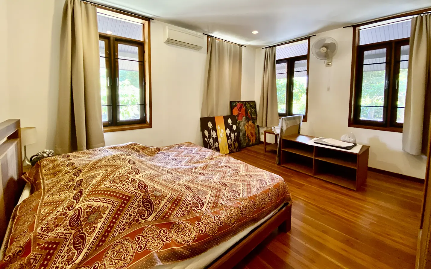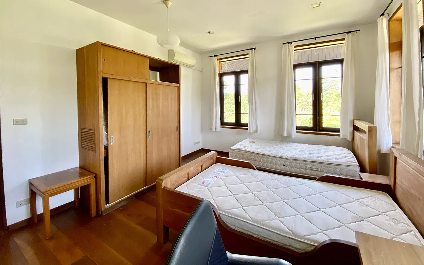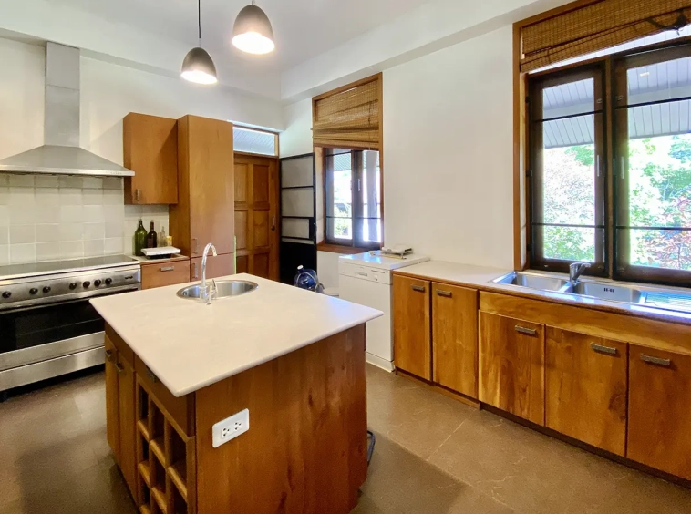 The property sits on a whopping almost 4 rais of land with a fruit trees orchard, a large lawn garden, and backs onto a creek. There is a separate garage with storage rooms, and onto the main house which is slightly elevated and has a wrapped-around covered porch for plenty of natural light and air. On the ground floor to the left is a storage room, an ensuite guest bedroom, a guest bathroom, an open plan living/dining room, and a large fully equipped Western kitchen with a food preparation island and access to the rear. The floor both on the ground floor and first floor is of wide teakwood, double isolation, 3 meters tall ceiling, and several folding doors with access to the porch for energy-saving and outdoor living. Large terrace for outdoor dining and entertaining.