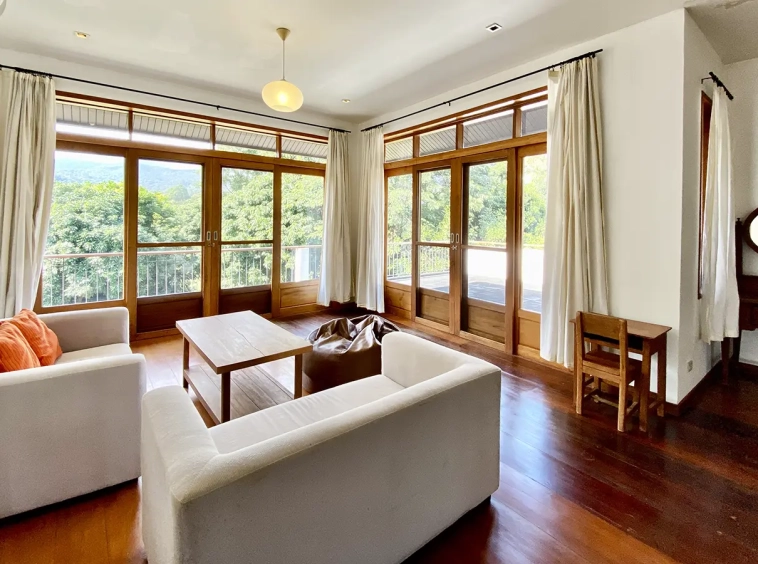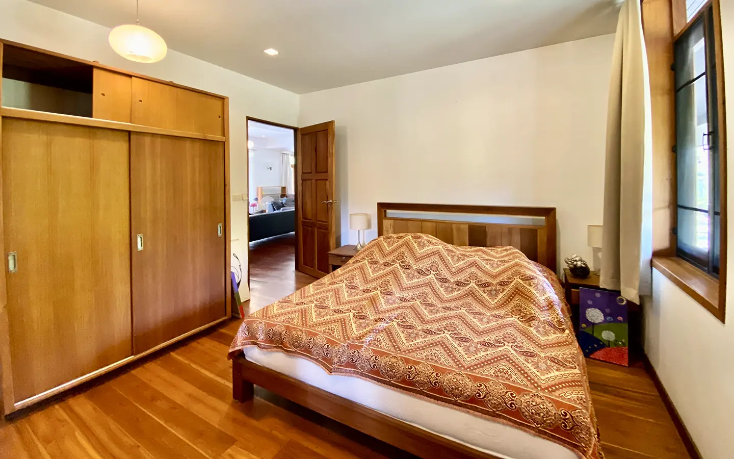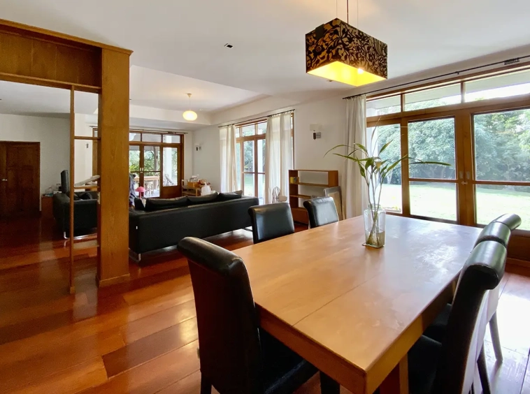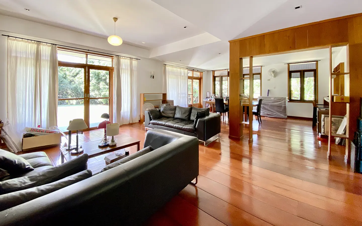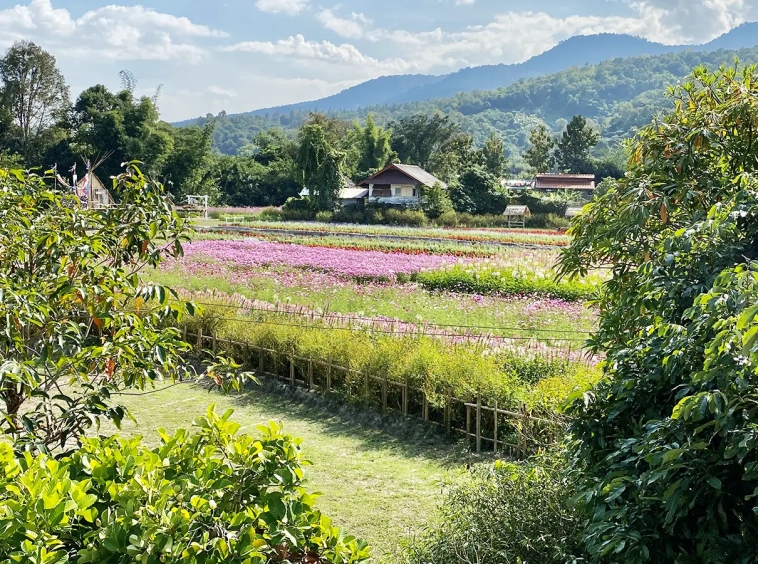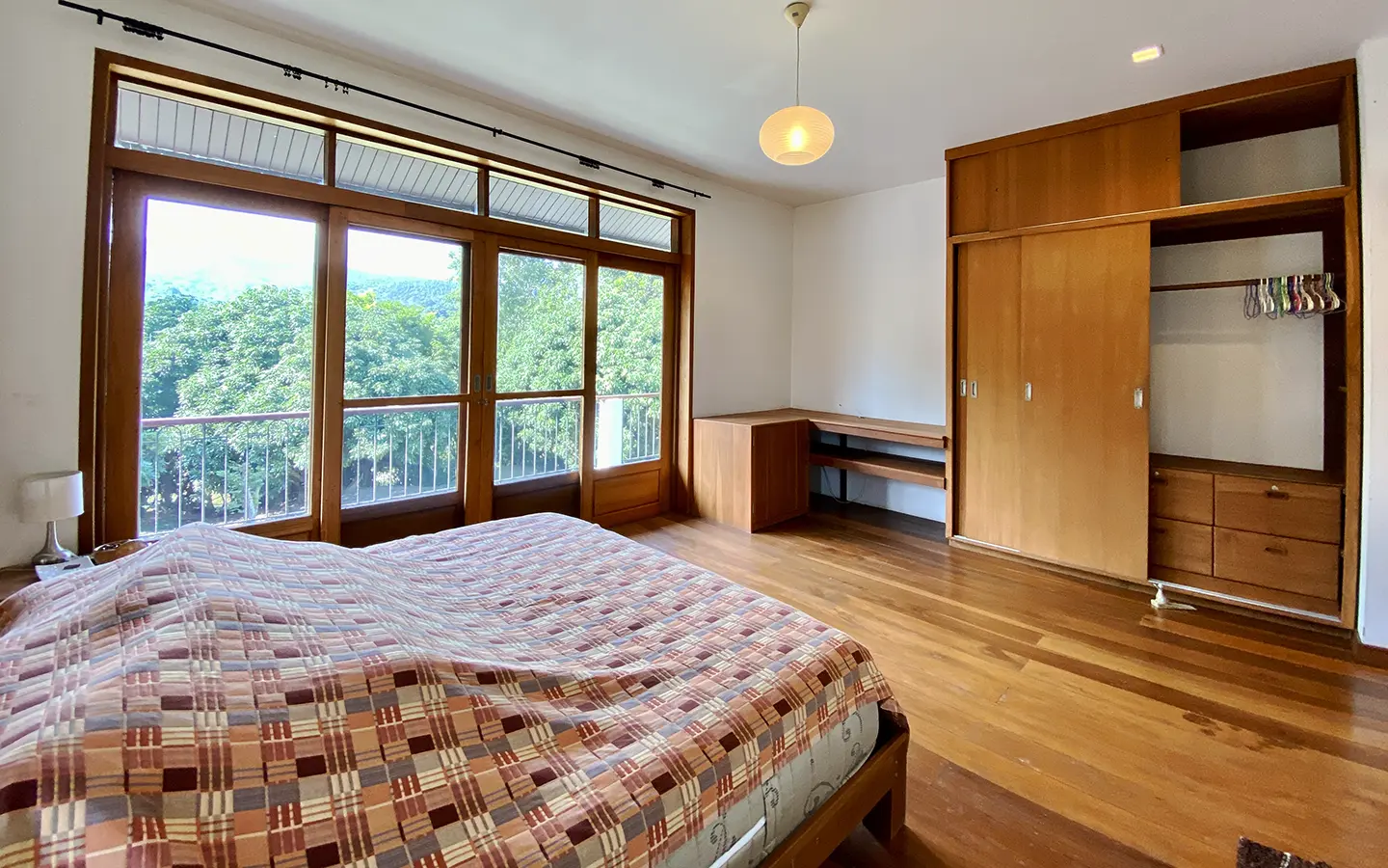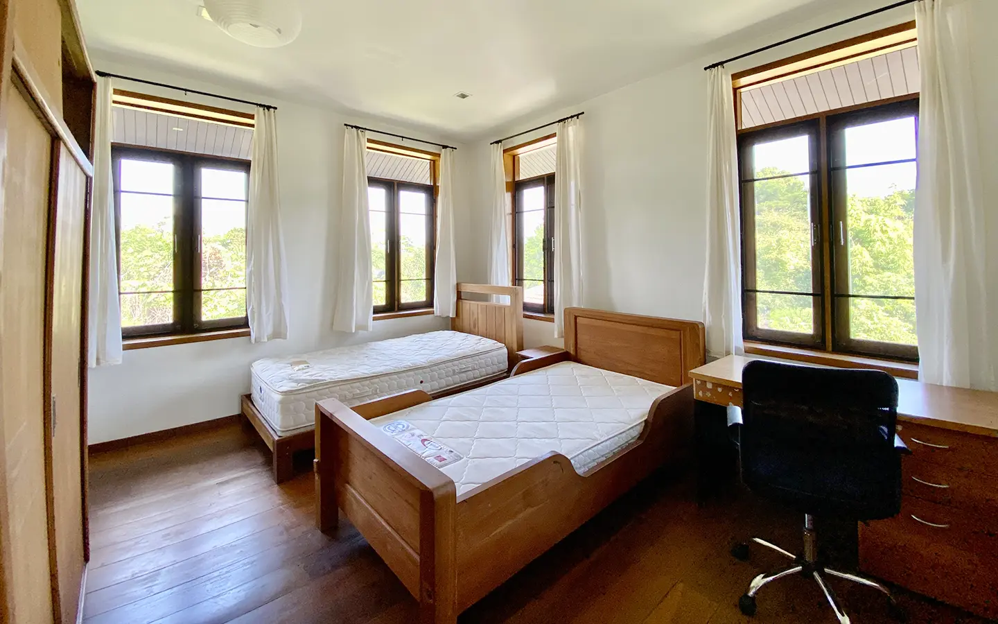 The property sits on a whopping almost 4 rais of land with a fruit trees orchard, a large lawn garden, and backs onto a creek. There is a separate garage with storage rooms, and onto the main house which is slightly elevated and has a wrapped-around covered porch for plenty of natural light and air. On the ground floor to the left is a storage room, an ensuite guest bedroom, a guest bathroom, an open plan living/dining room, and a large fully equipped Western kitchen with a food preparation island and access to the rear. The floor both on the ground floor and first floor is of wide teakwood, double isolation, 3 meters tall ceiling, and several folding doors with access to the porch for energy-saving and outdoor living. Large terrace for outdoor dining and entertaining.