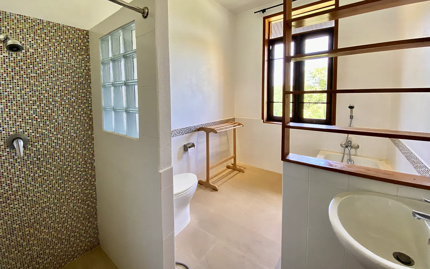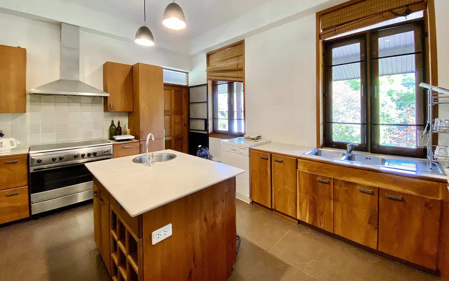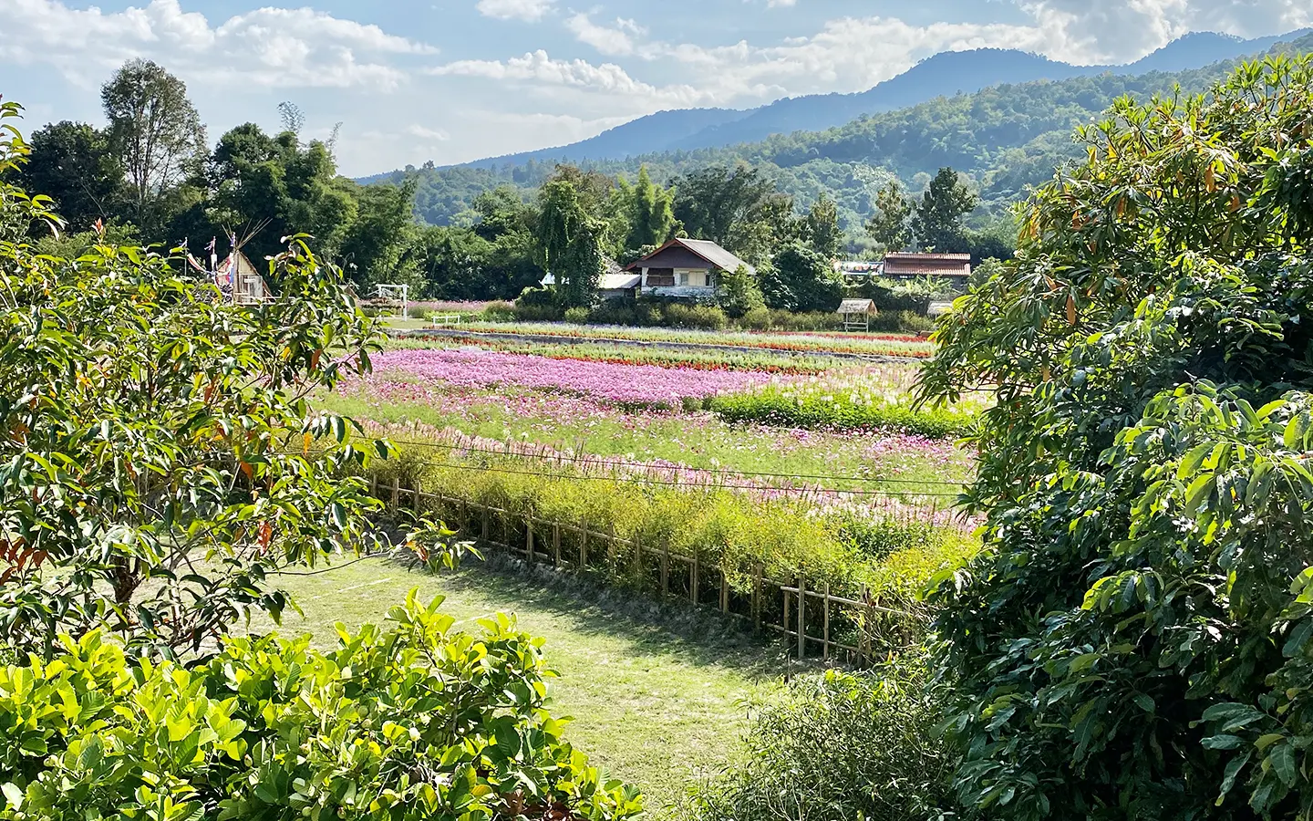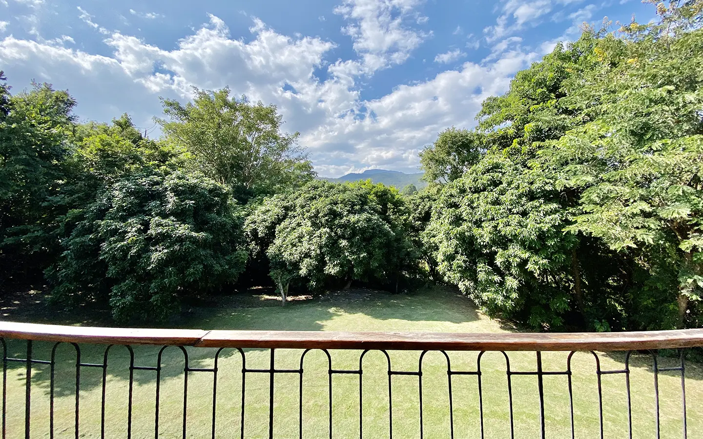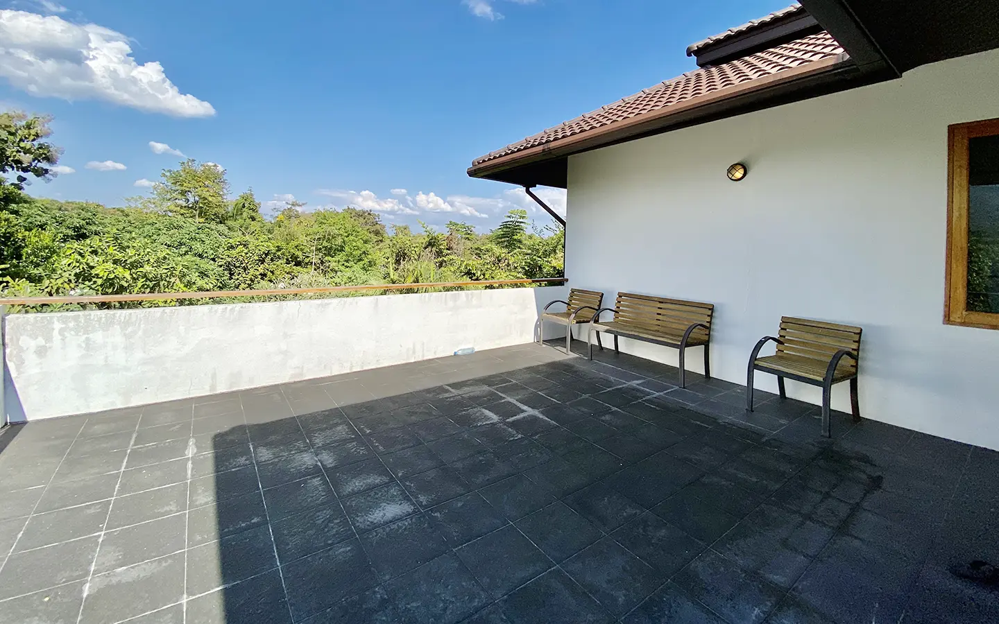 The property sits on a whopping almost 4 rais of land with a fruit trees orchard, a large lawn garden, and backs onto a creek. There is a separate garage with storage rooms, and onto the main house which is slightly elevated and has a wrapped-around covered porch for plenty of natural light and air. On the ground floor to the left is a storage room, an ensuite guest bedroom, a guest bathroom, an open plan living/dining room, and a large fully equipped Western kitchen with a food preparation island and access to the rear. The floor both on the ground floor and first floor is of wide teakwood, double isolation, 3 meters tall ceiling, and several folding doors with access to the porch for energy-saving and outdoor living. Large terrace for outdoor dining and entertaining.