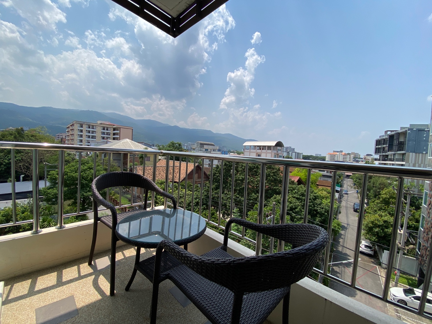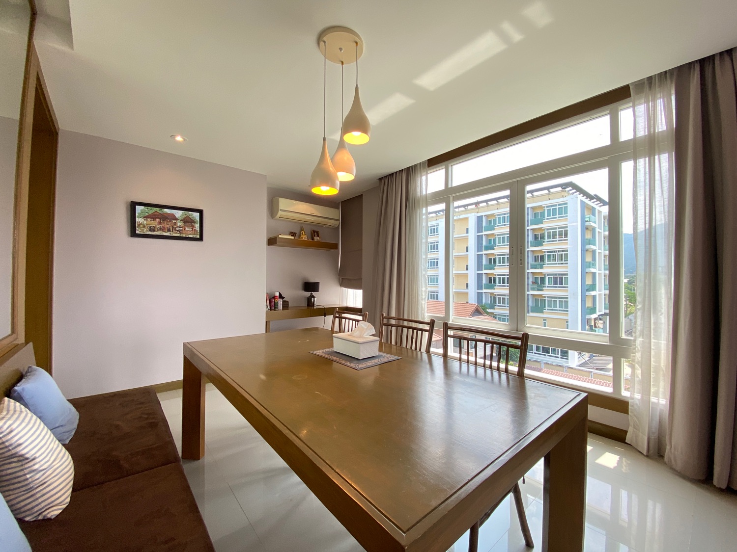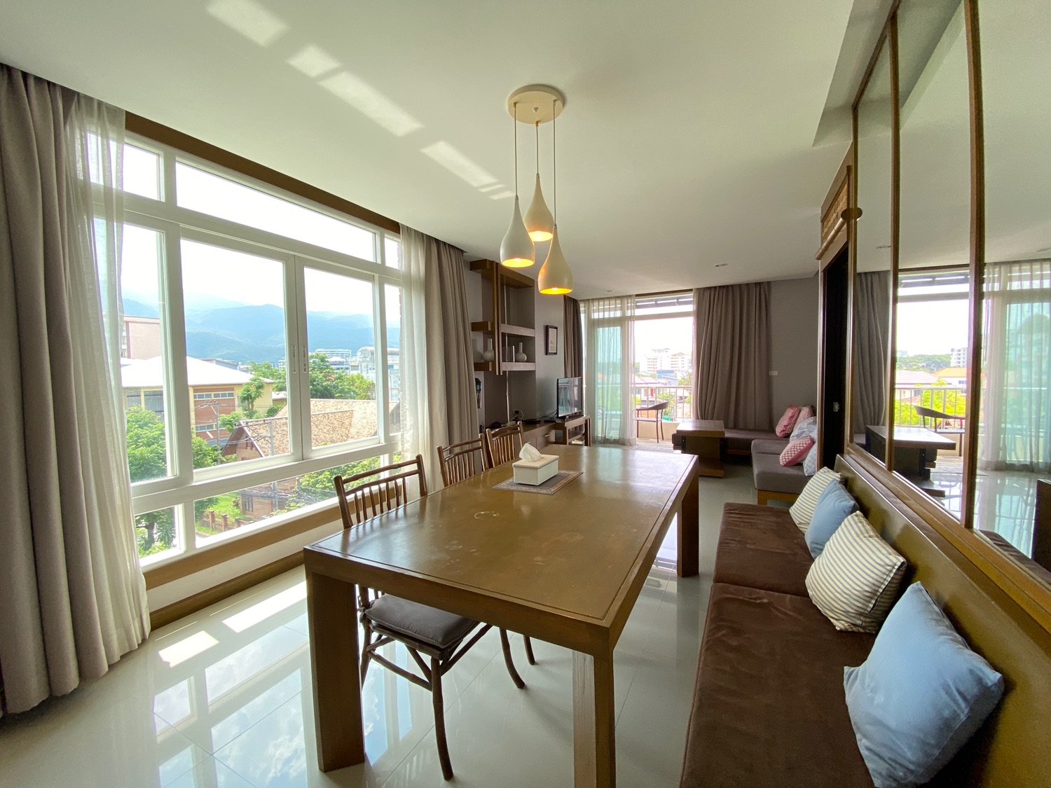 The unit is a whopping 114 Sqm and is located on the 5th floor and comes with a digital door entry. It has a very tall ceiling providing plenty of natural light and stunning views of Doi Suthep mountains. To the left is the fully fitted Western kitchen with plenty of cupboard units, a shared guest bathroom with a bathtub and access to the first bedroom that comes complete with a built-in closet. Facing the mountain view is the dining area which can also be used as a working area and a sitting area with door access to the terrace. The master bedroom comes with a built-in wall unit and closet and is ensuite with a bathtub. Spacious corner units like this are rare to come to the market and must be viewed to appreciate.