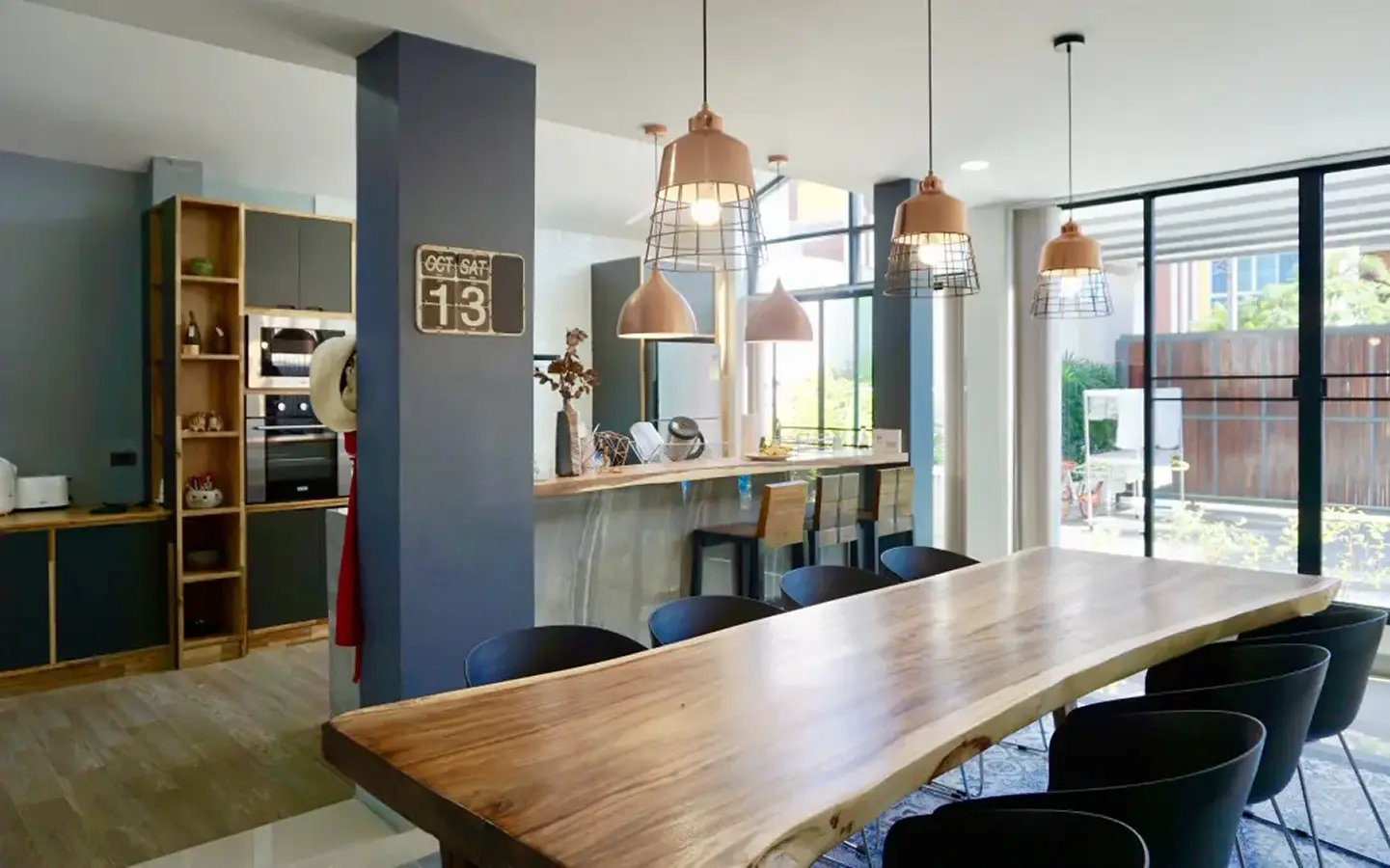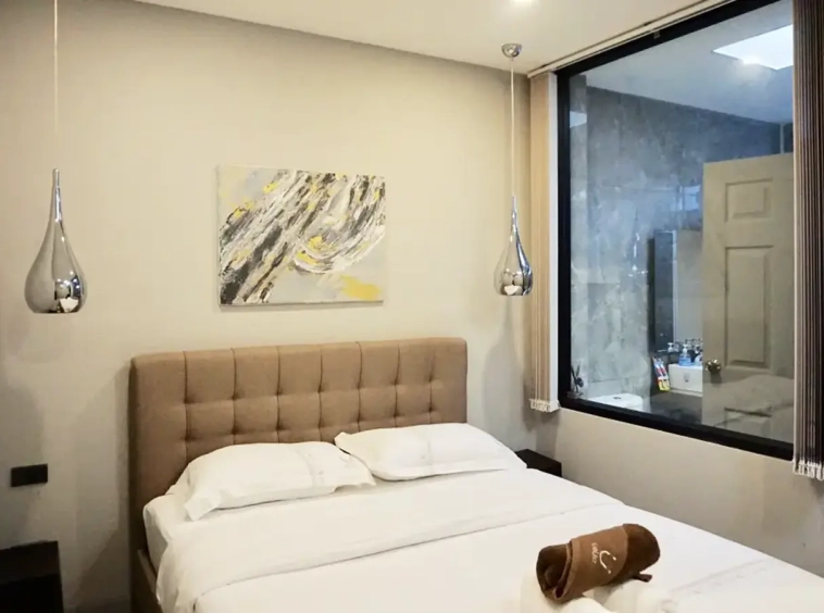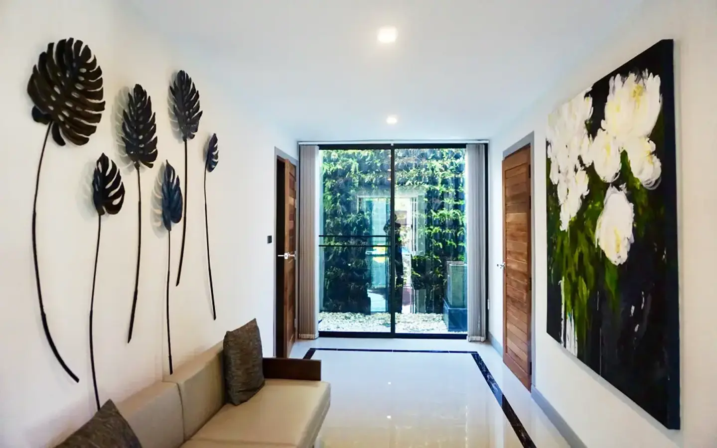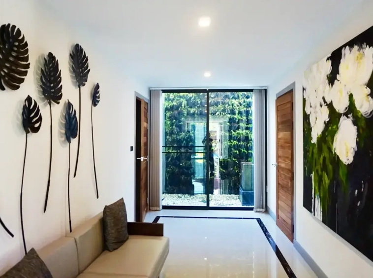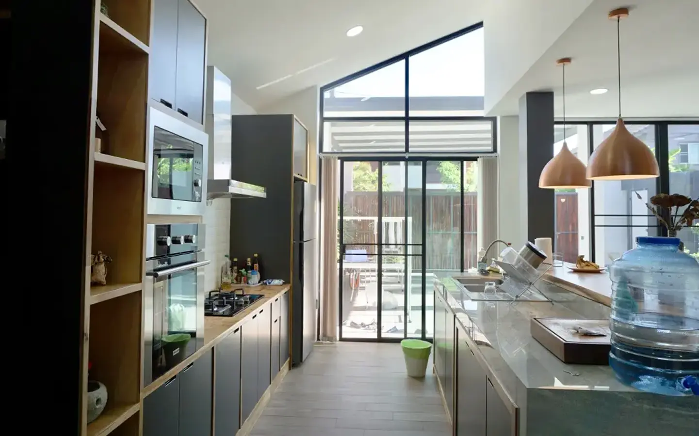 Through the motorised gate, the swimming pool and deck area are to the right getting partial sun for most of the day. Inside, the fully fitted Western kitchen is elegantly done, with built-in appliances, a breakfast bar and a large wooden dining table set. A delightful little courtyard can be seen and enjoyed from here.