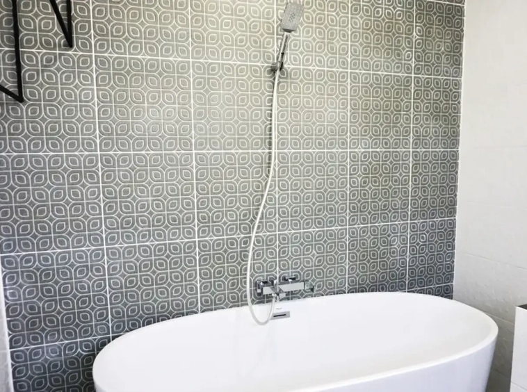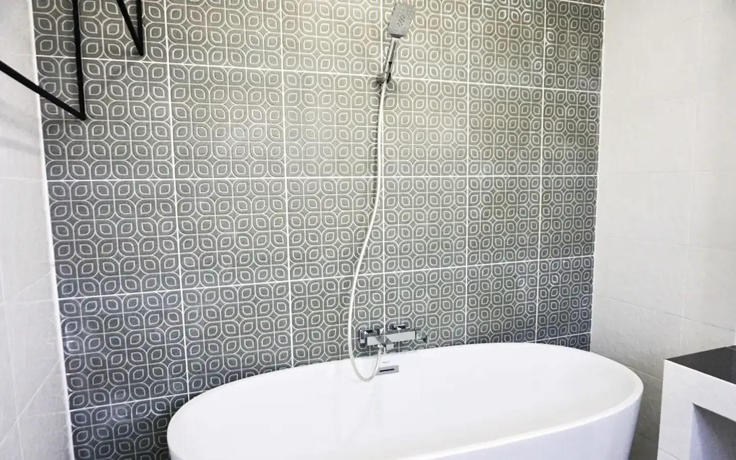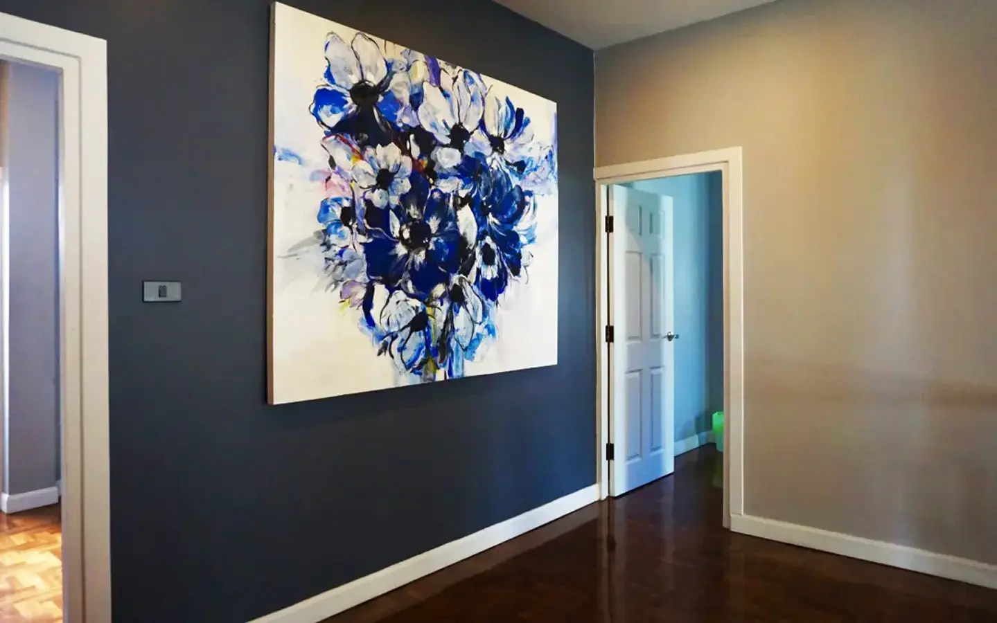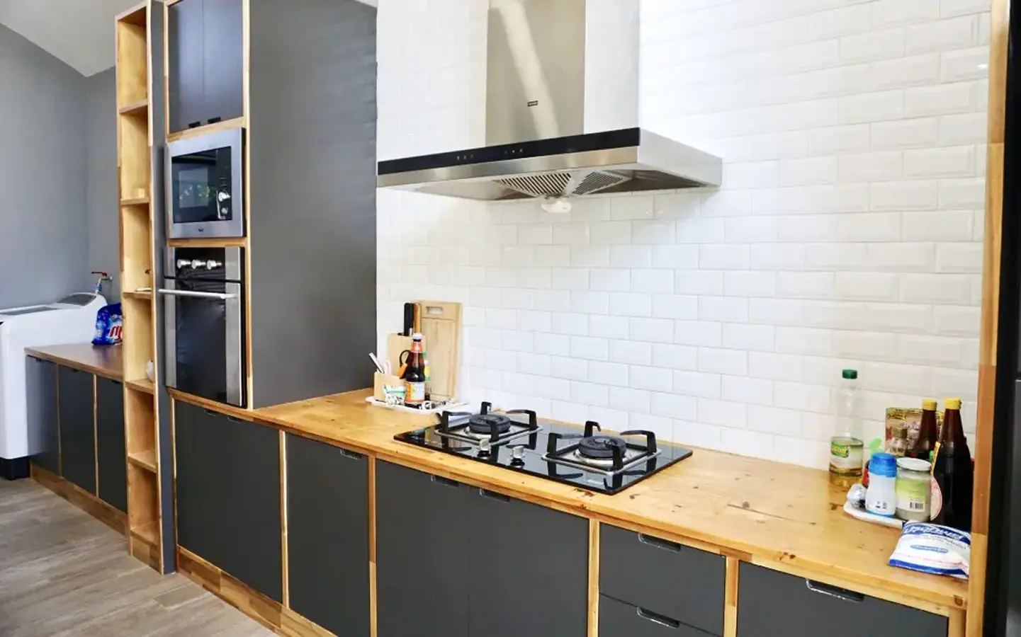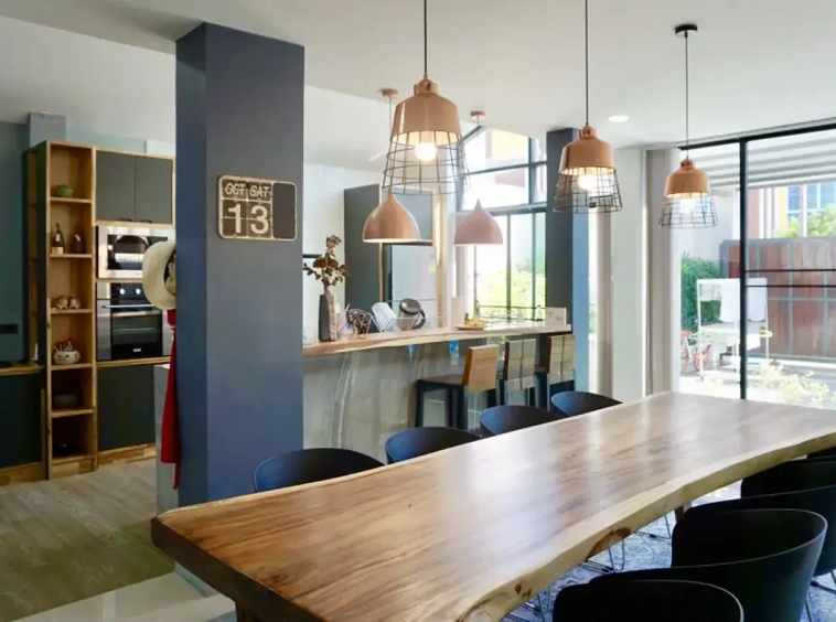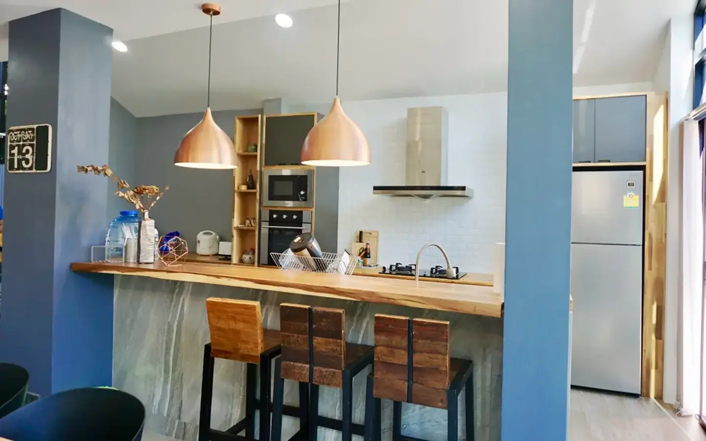 Through the motorised gate, the swimming pool and deck area are to the right getting partial sun for most of the day. Inside, the fully fitted Western kitchen is elegantly done, with built-in appliances, a breakfast bar and a large wooden dining table set. A delightful little courtyard can be seen and enjoyed from here.