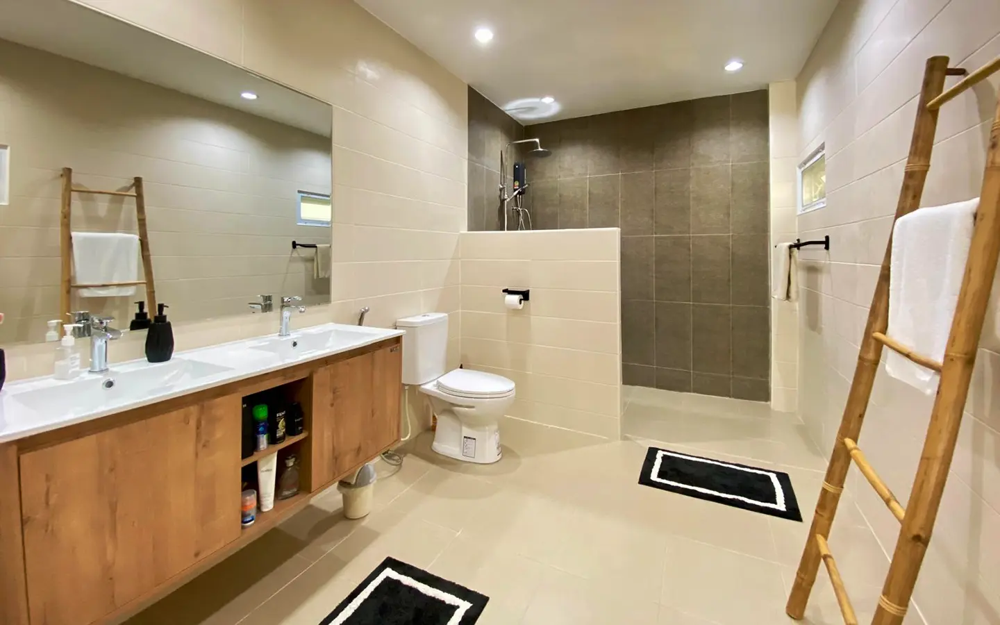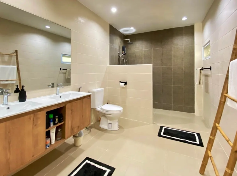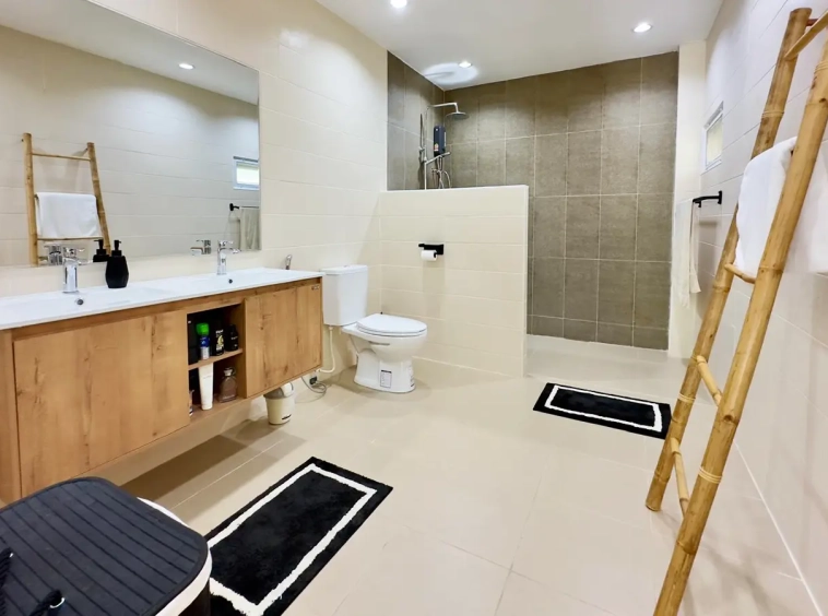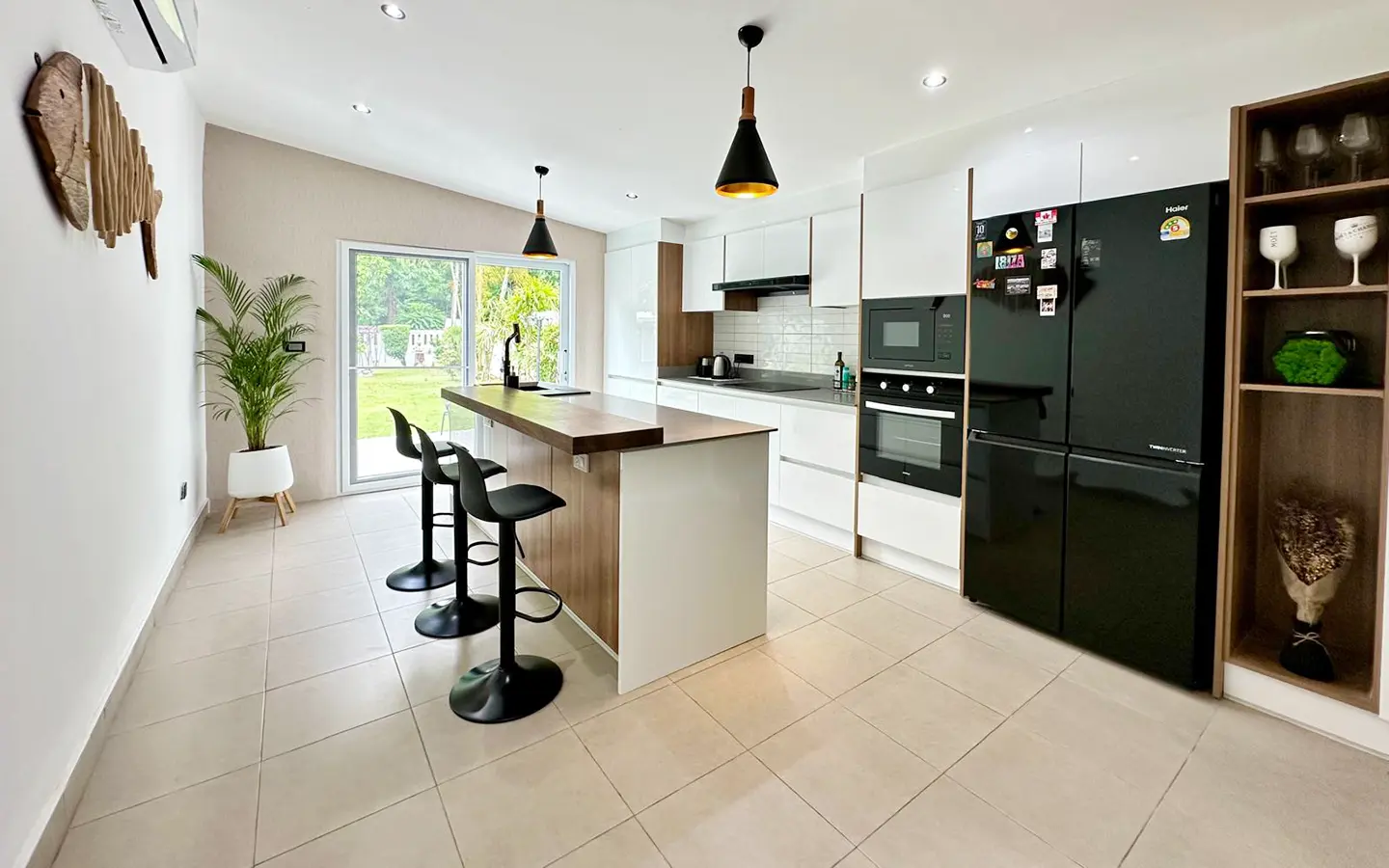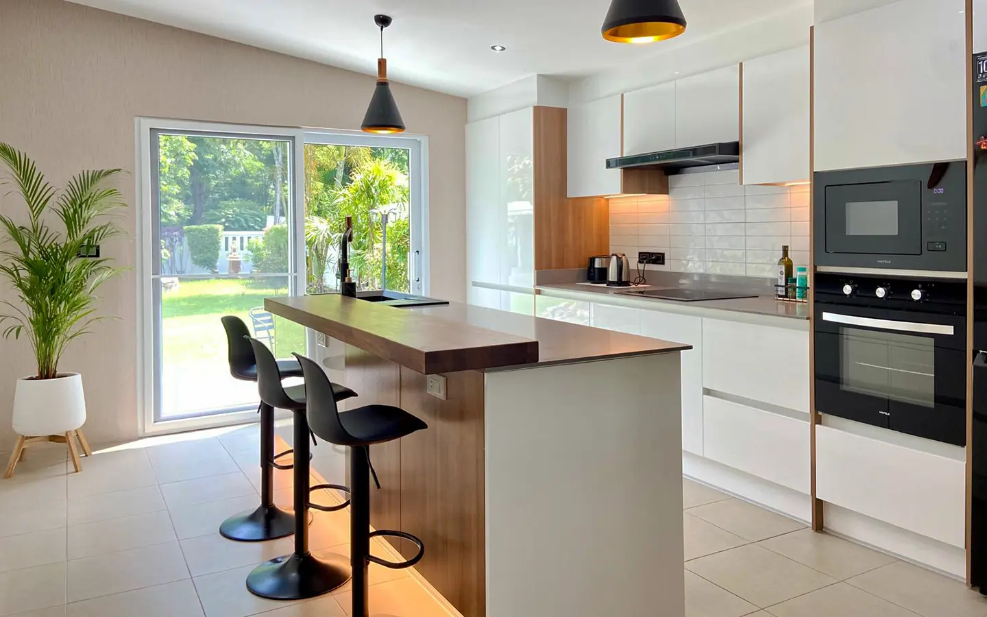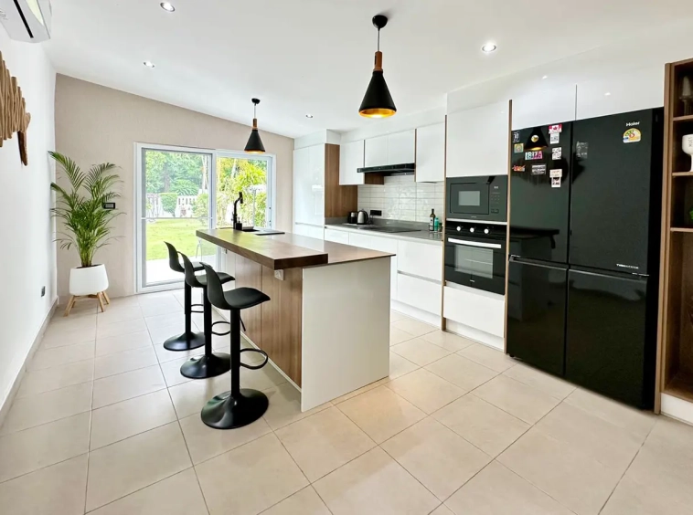 However, saving the best for last: the kitchen. Bought from Homikitch in Chiang Mai it’s gorgeous with its own breakfast bar and private patio overlooking the garden. Everything you would expect from the dishwasher to the 4 door fridge freezer, Induction hob, oven, microwave and mood lighting. Truly delightful, a must-see.