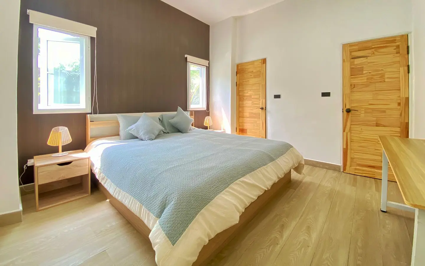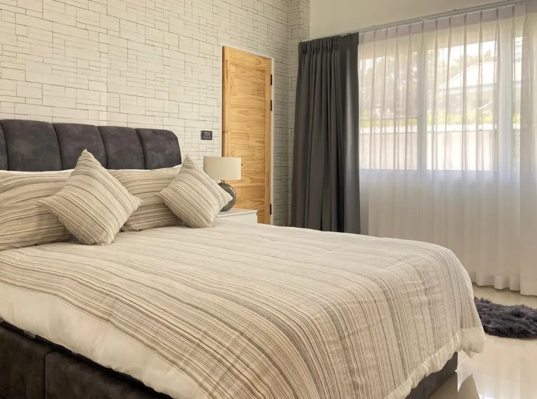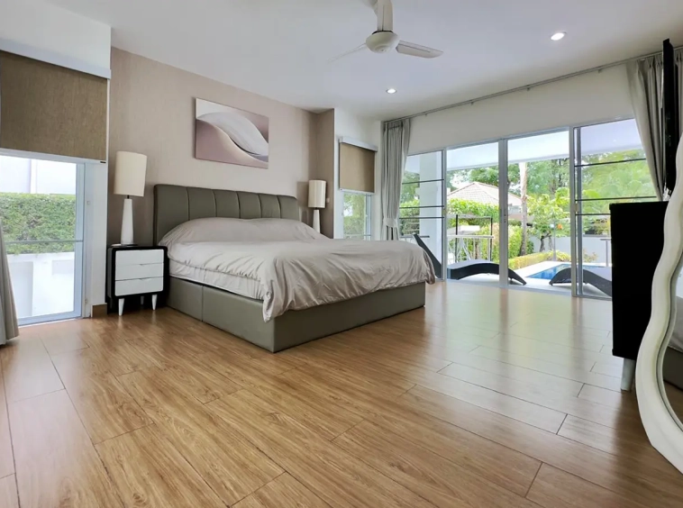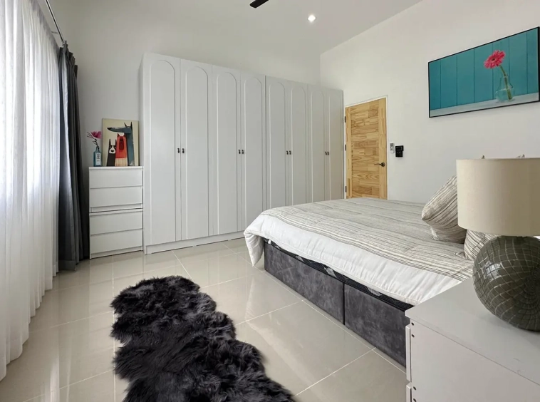 The Master bedroom suite features triple aspect glazing with a view of the garden that wraps around the entire 250 sqm Villa and Pool. There is a fully built-in separate dressing room and large en-suite bathroom.